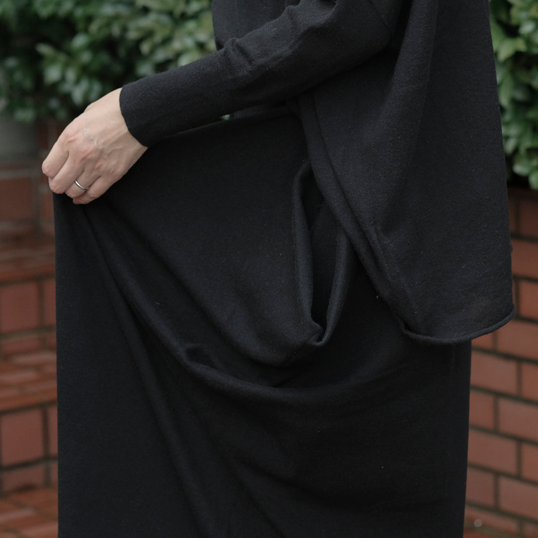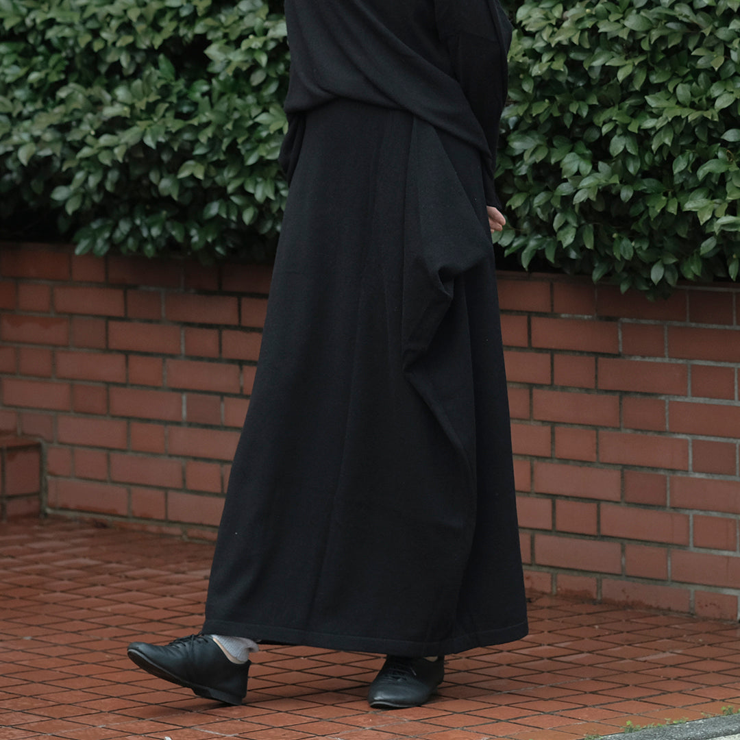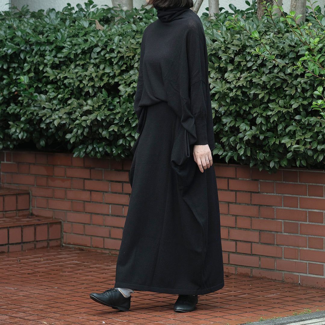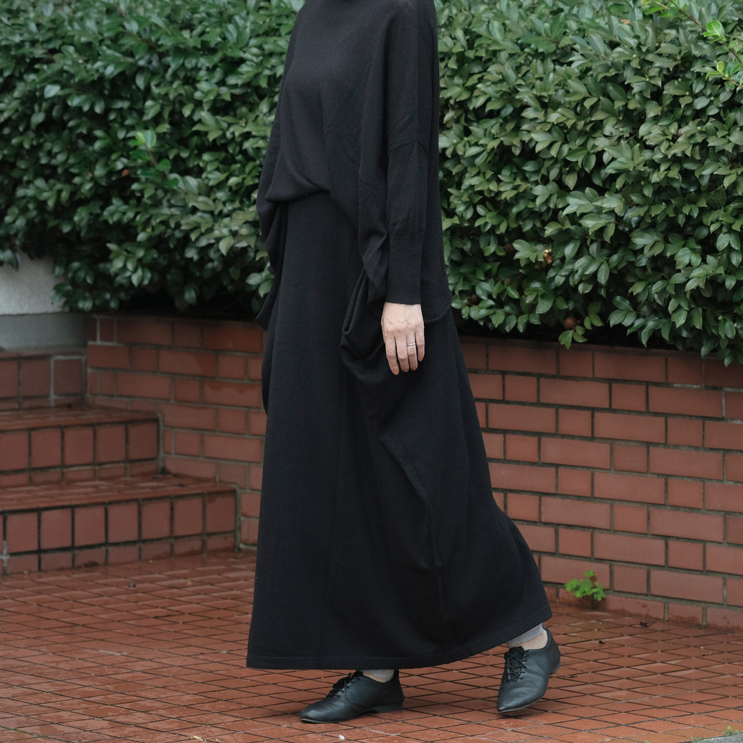 トップスはインしてもアウトでもバランスのよいボリューム感。トップスを黒に合わせたコーディネートで、セットアップやワンピース風の着こなしにもおすすめです。