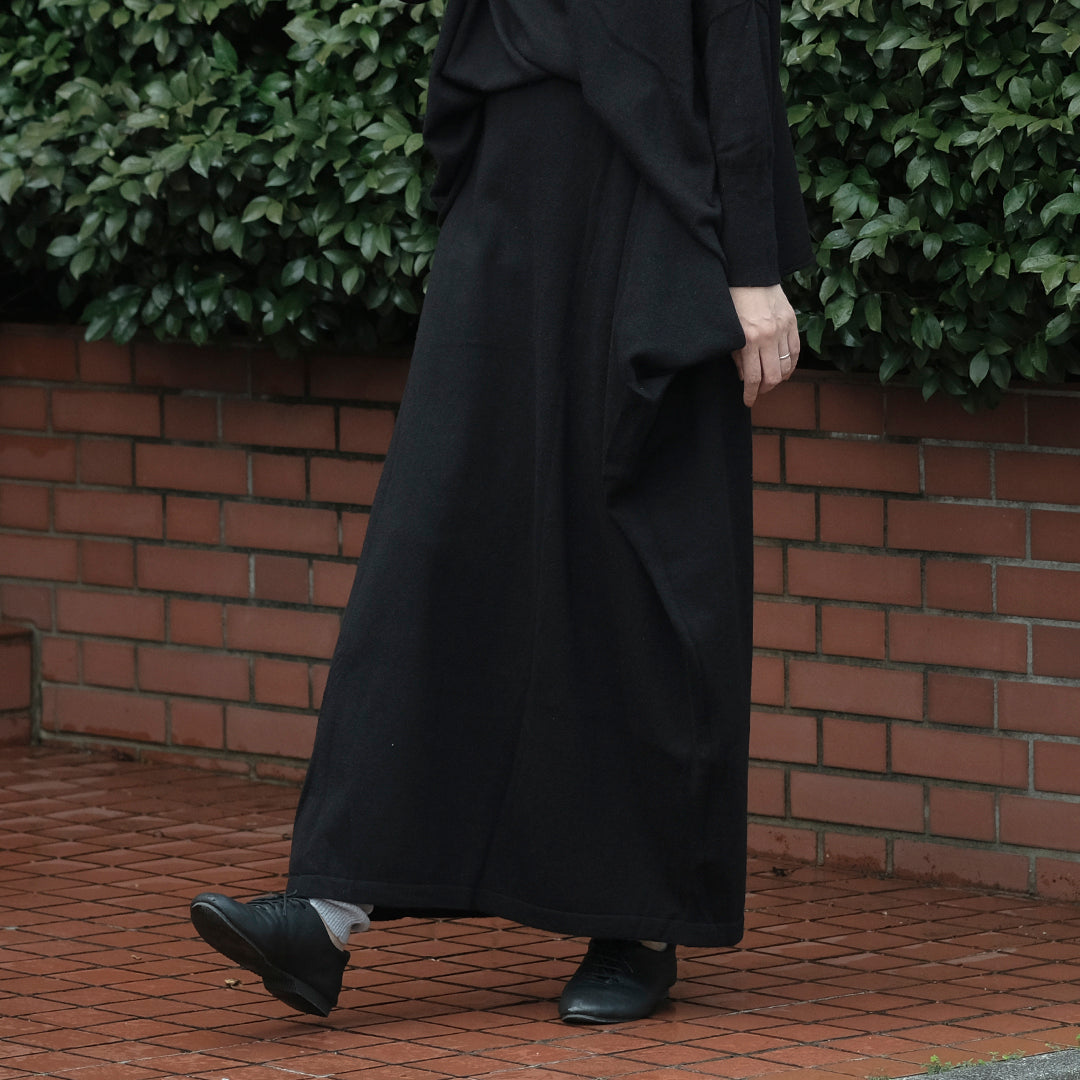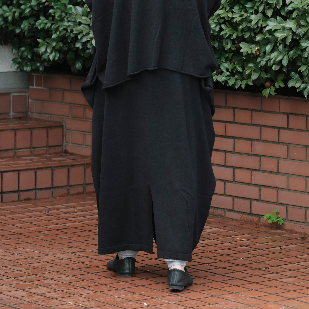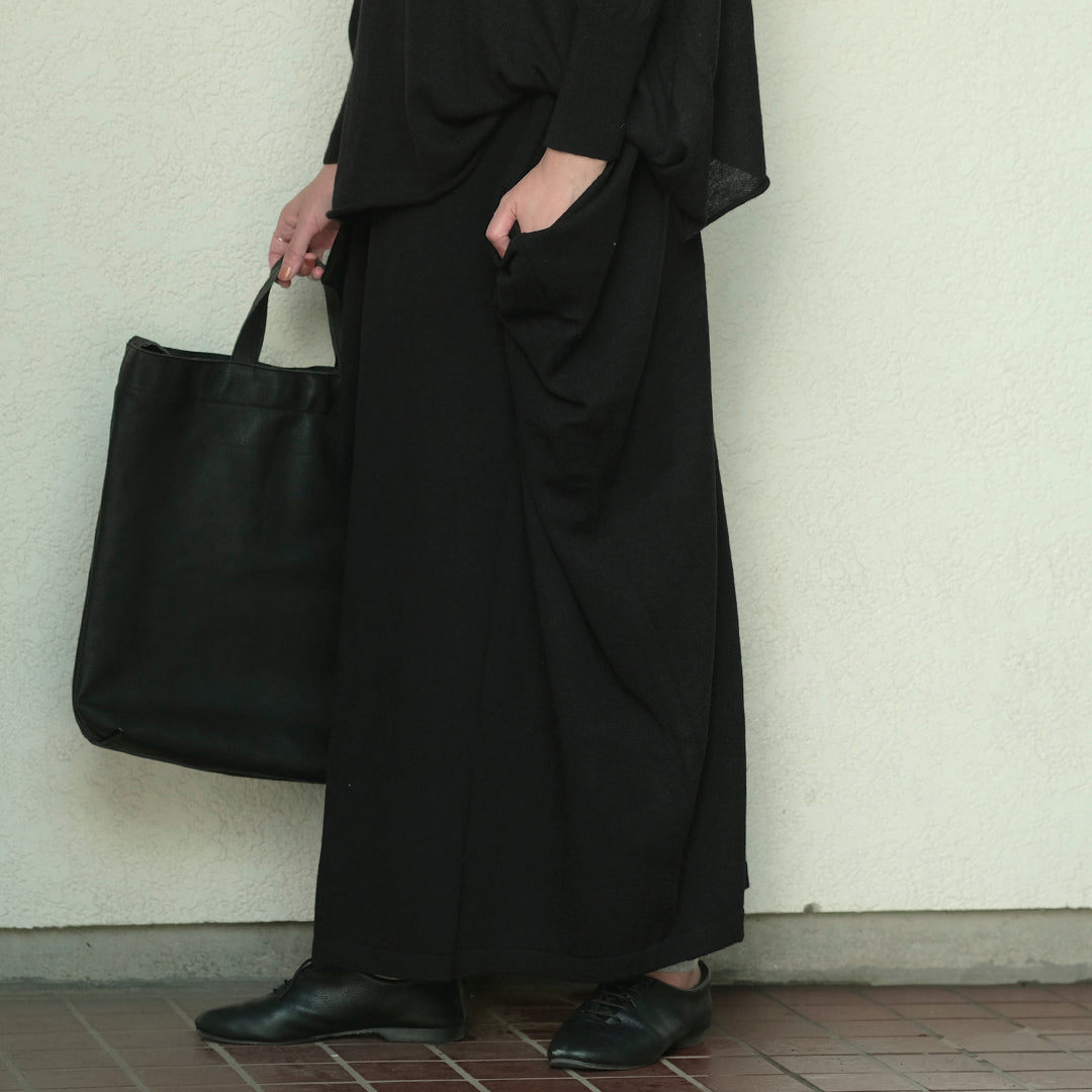 トップスはインしてもアウトでもバランスのよいボリューム感。トップスを黒に合わせたコーディネートで、セットアップやワンピース風の着こなしにもおすすめです。