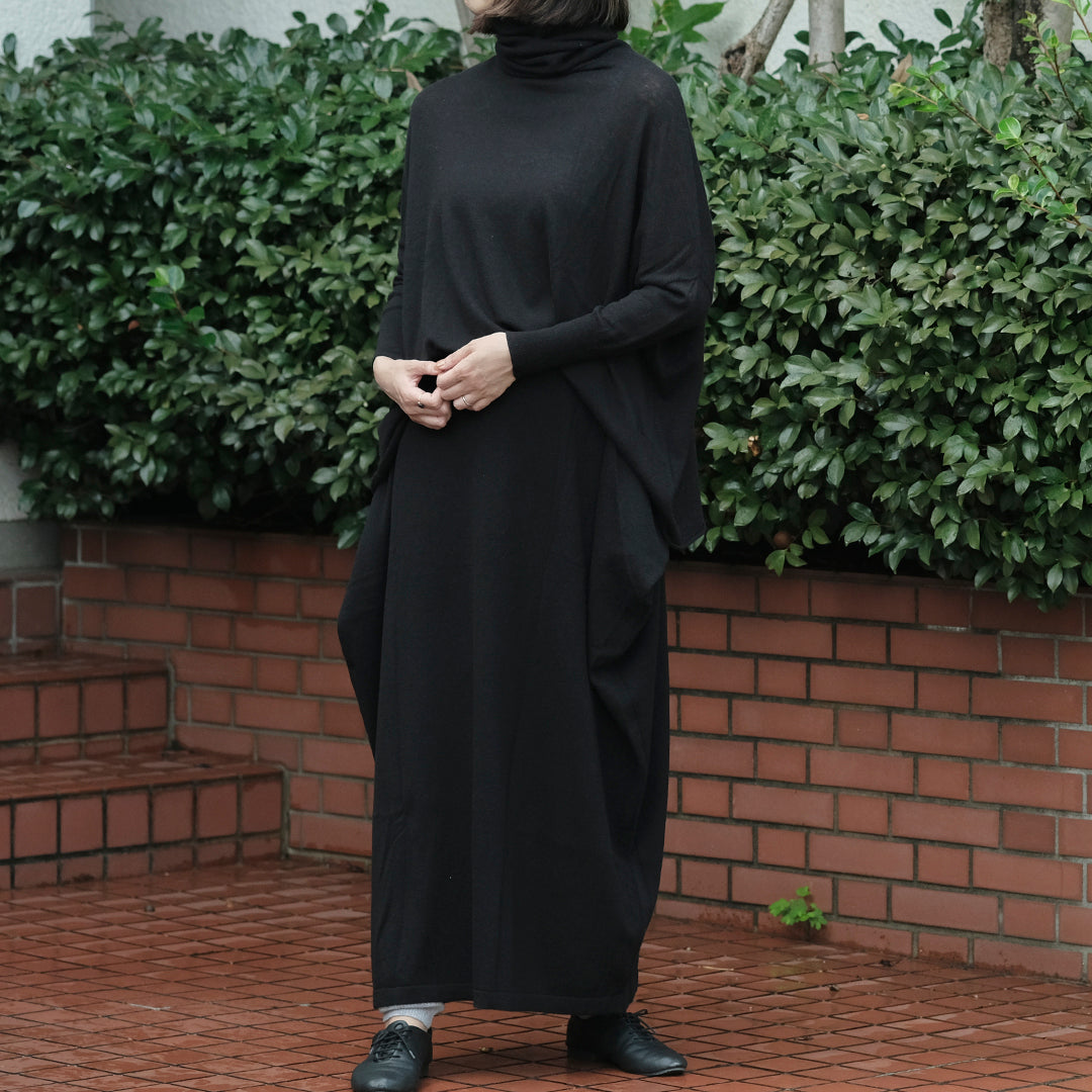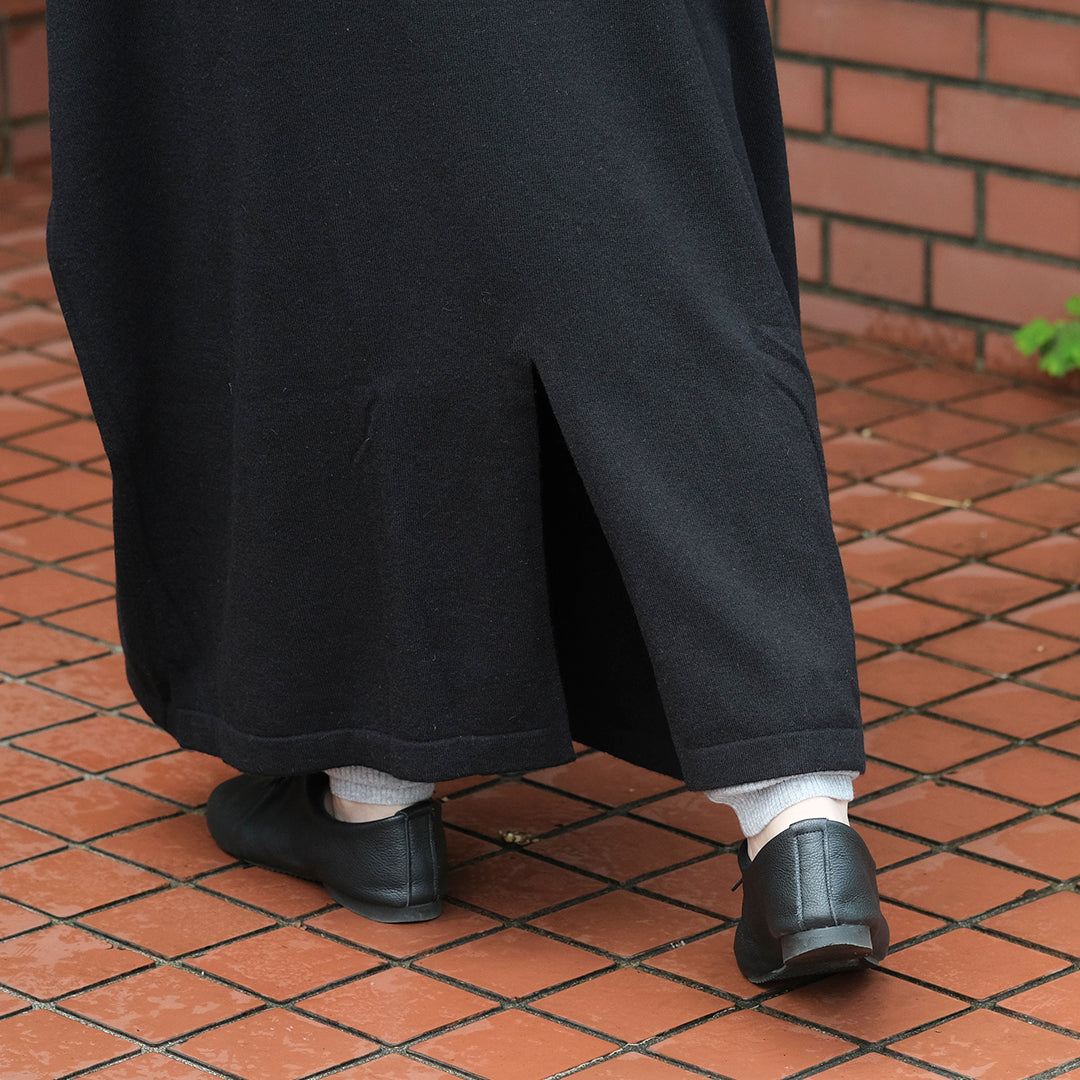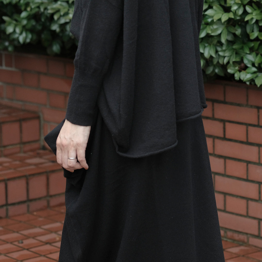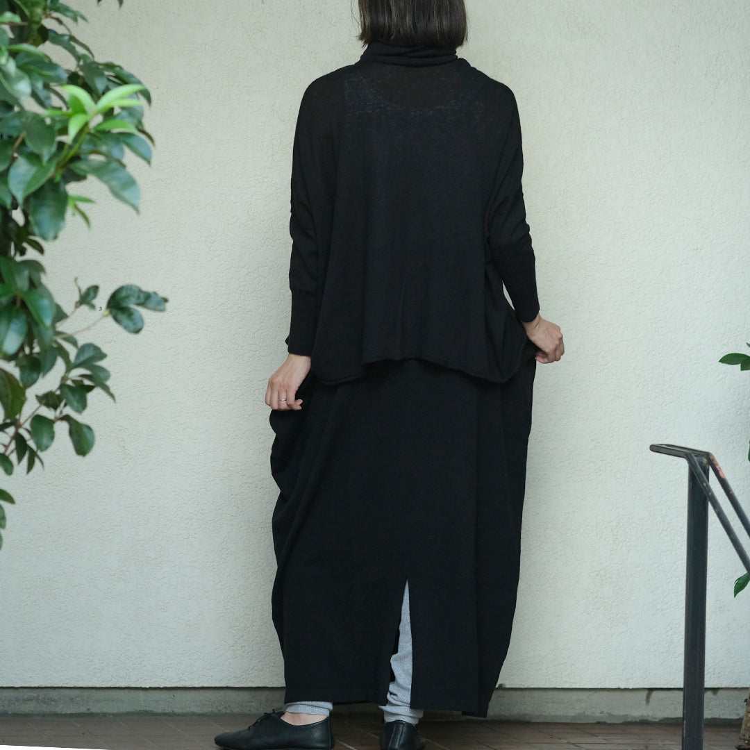 トップスはインしてもアウトでもバランスのよいボリューム感。トップスを黒に合わせたコーディネートで、セットアップやワンピース風の着こなしにもおすすめです。