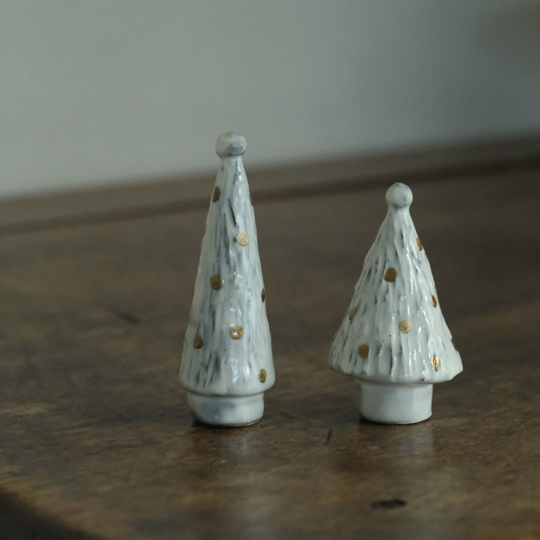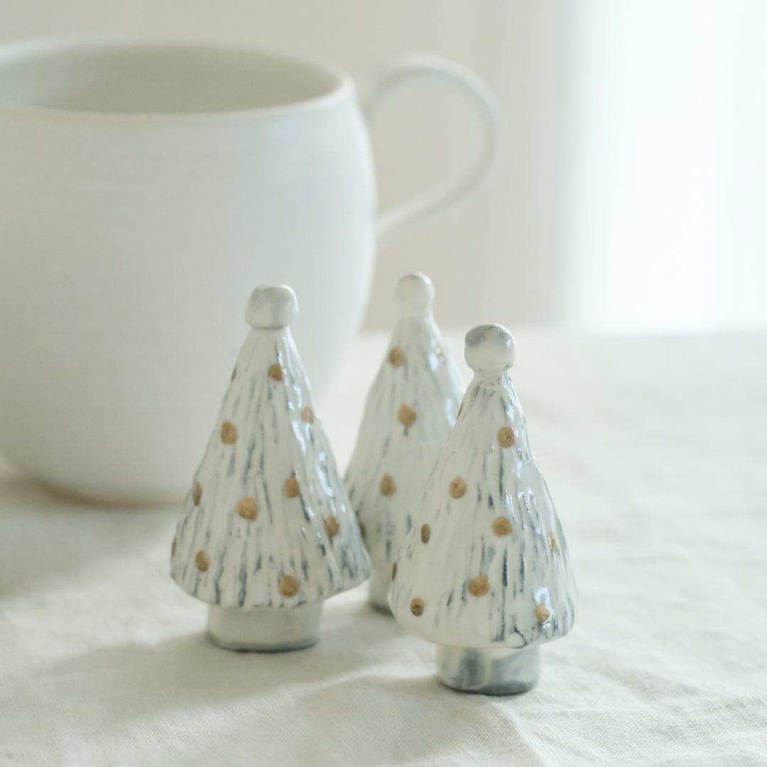 陶器でできた小さなツリーです。艶のある釉薬は土台の色がほんのり透けて、降り積もった雪のよう。金色の合成漆で飾り付けが施されています。