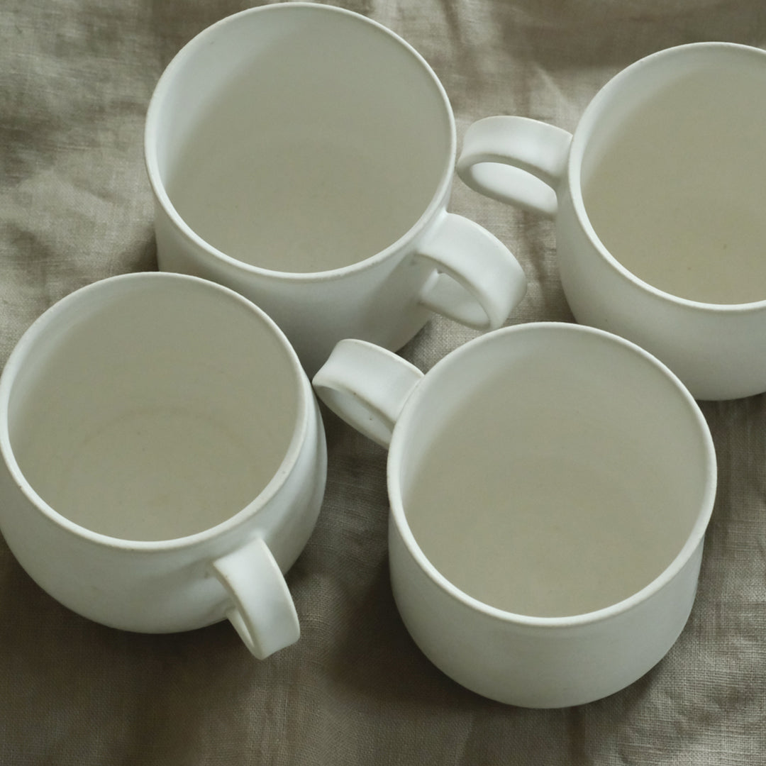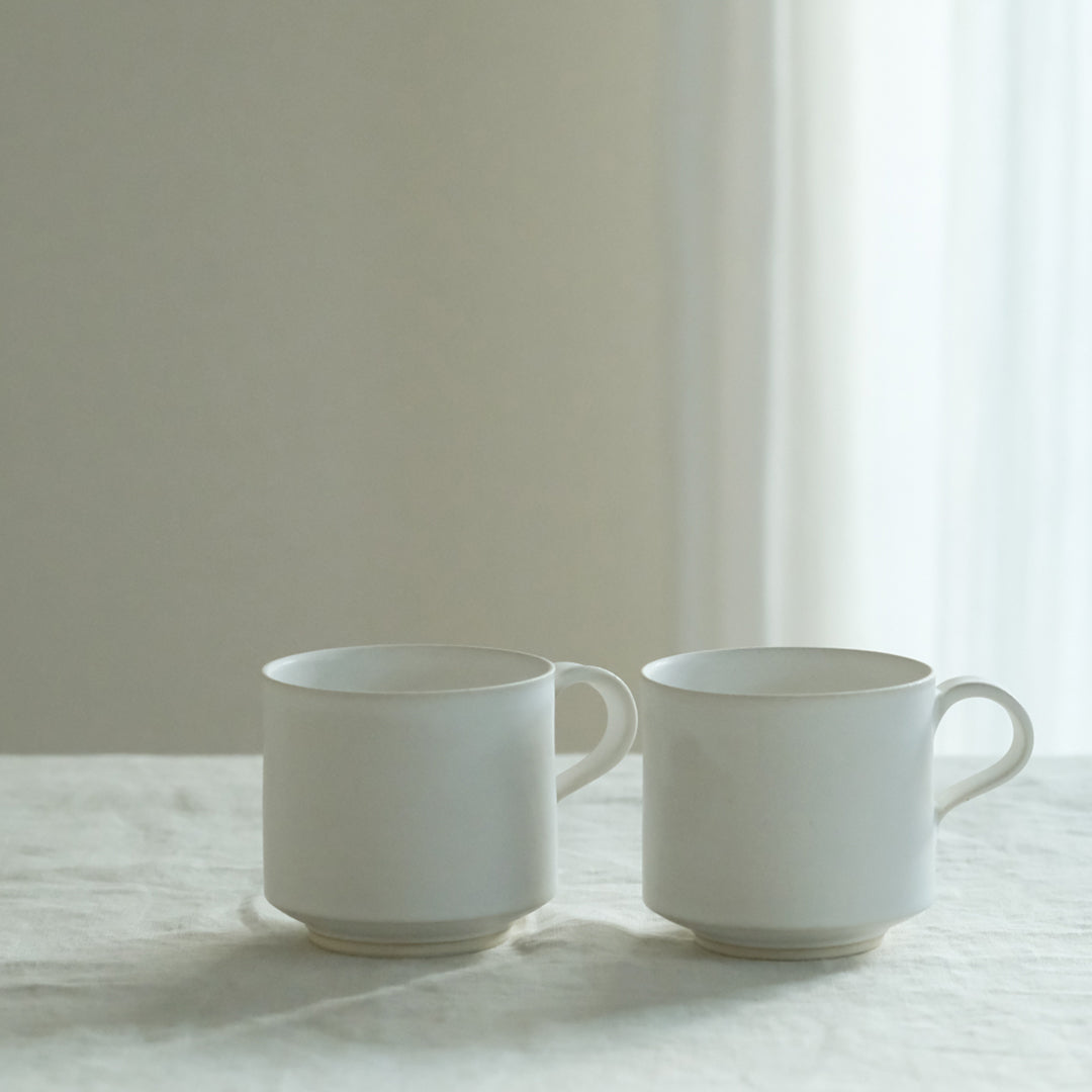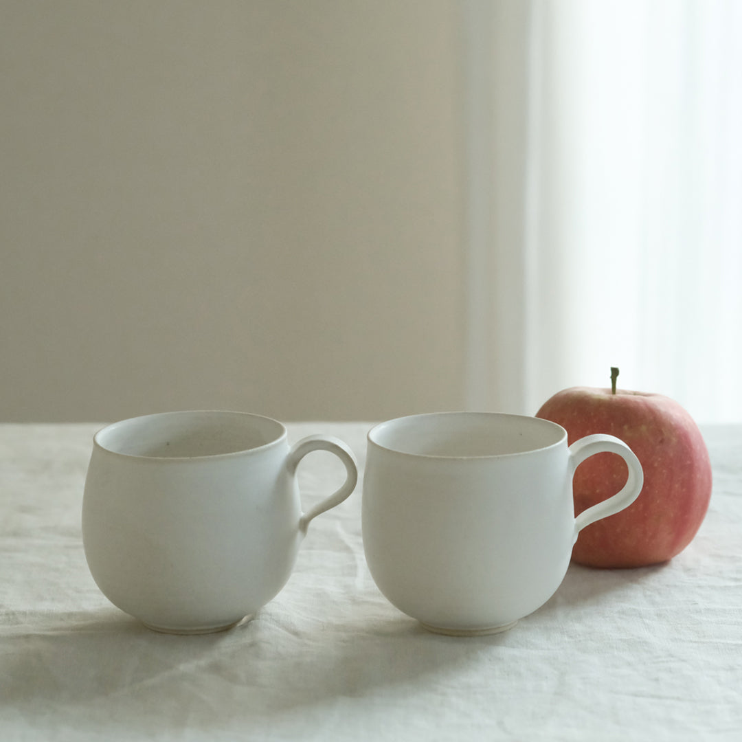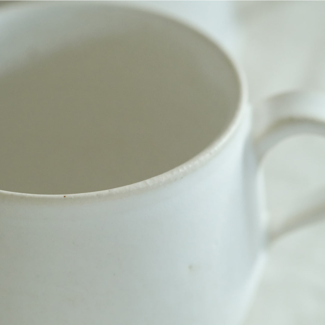 さらりとした質感の、乳白色のマグカップ。ふっくらとした「丸」とスッキリとした「角」の2種類があります。