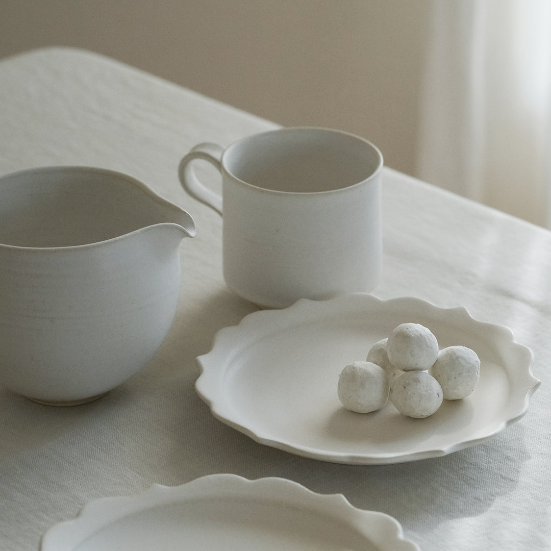 異なる形で揃えても統一感があります。ピッチャーやリム皿 輪花と揃えて食卓をより特別な雰囲気に。