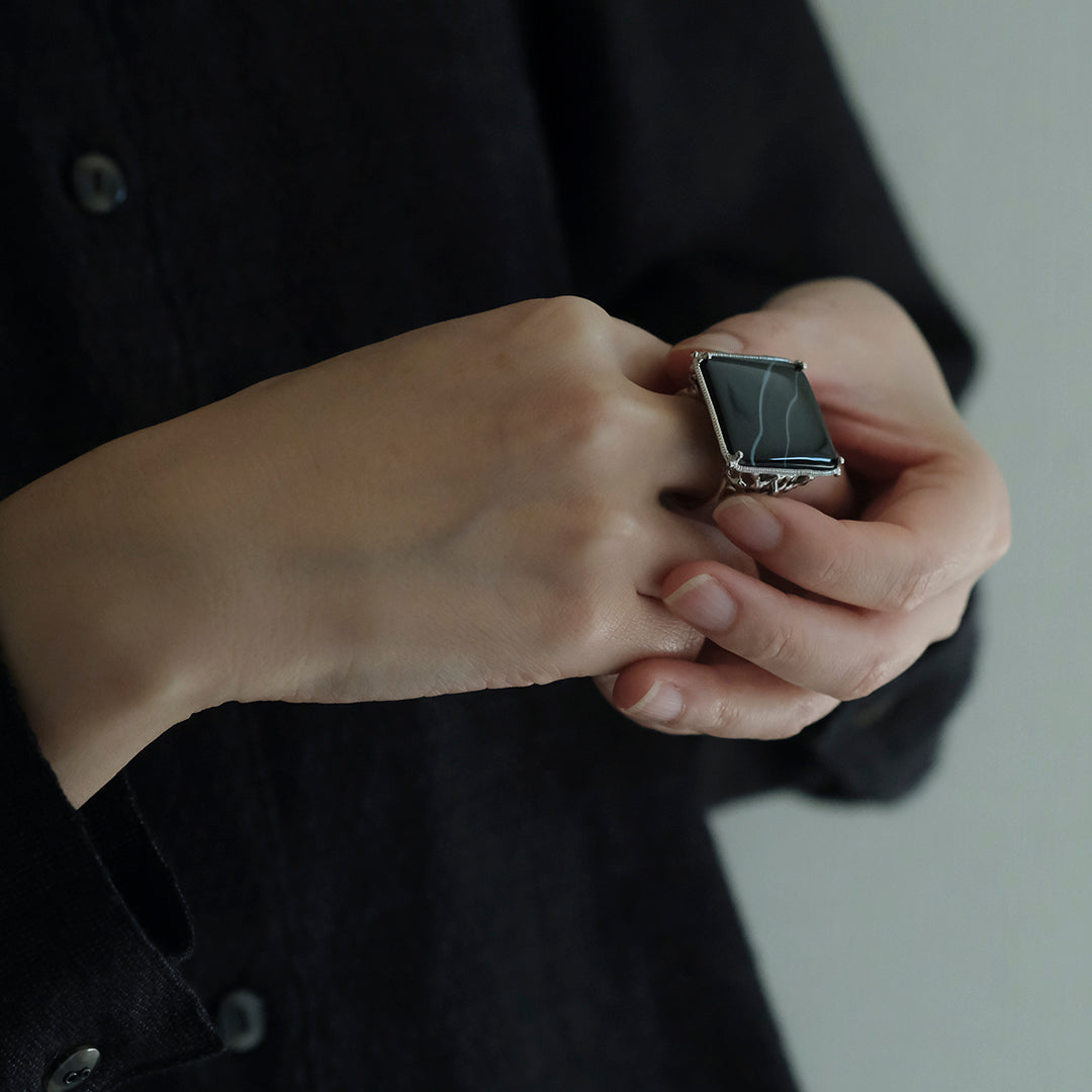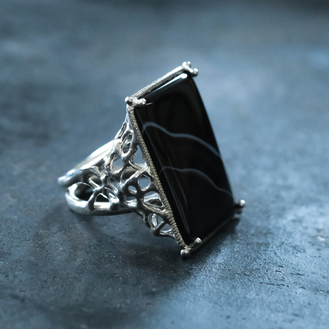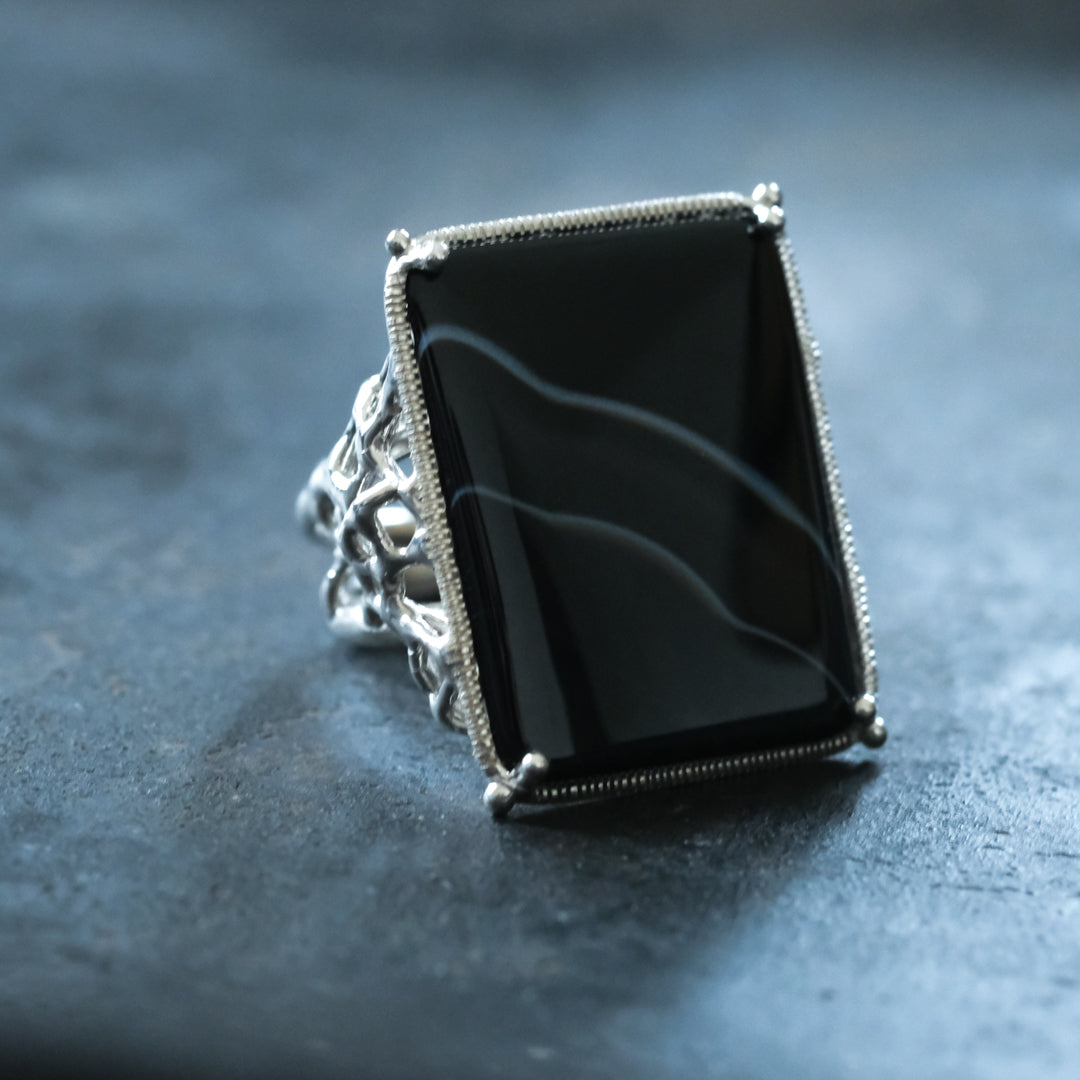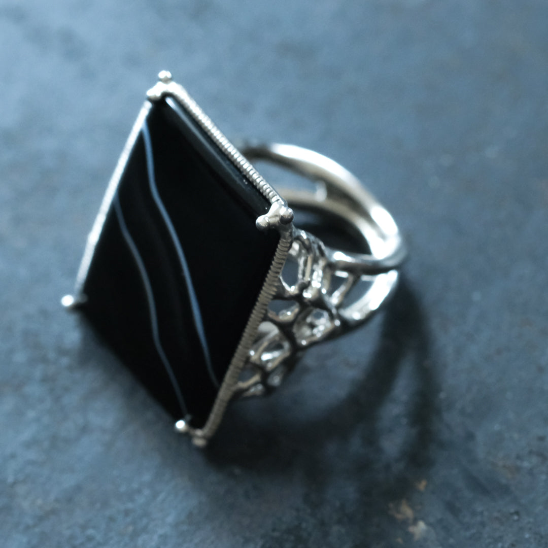 美しい縞模様を宿したアゲートのリング。夜空を閉じ込めた額縁のようなスクエアストーンを、繊細なミル打ちシルバーでトリミング。