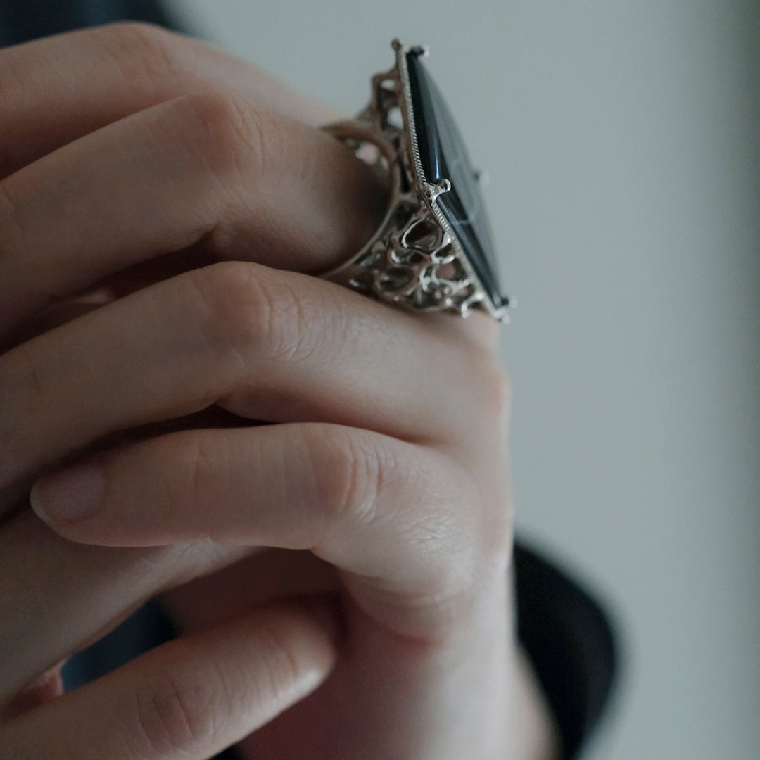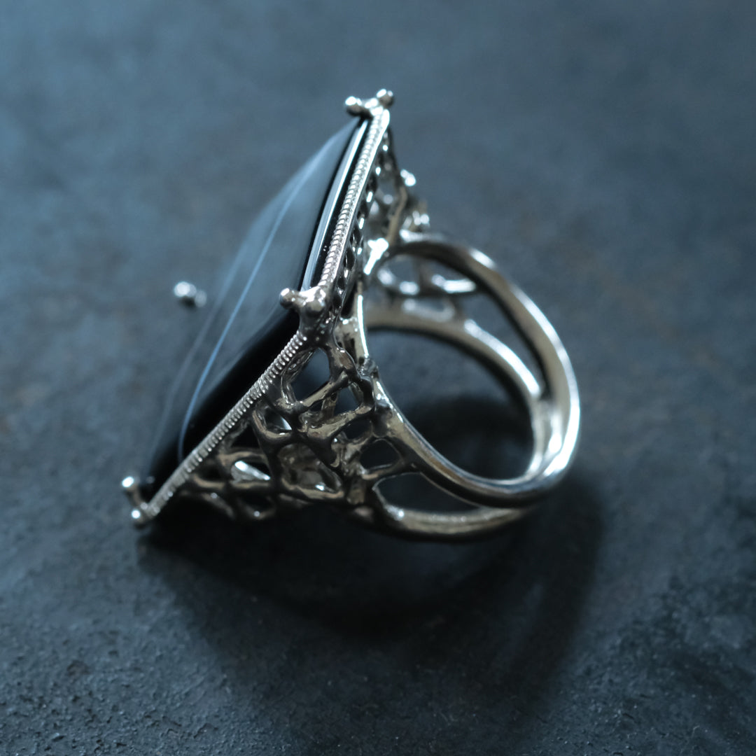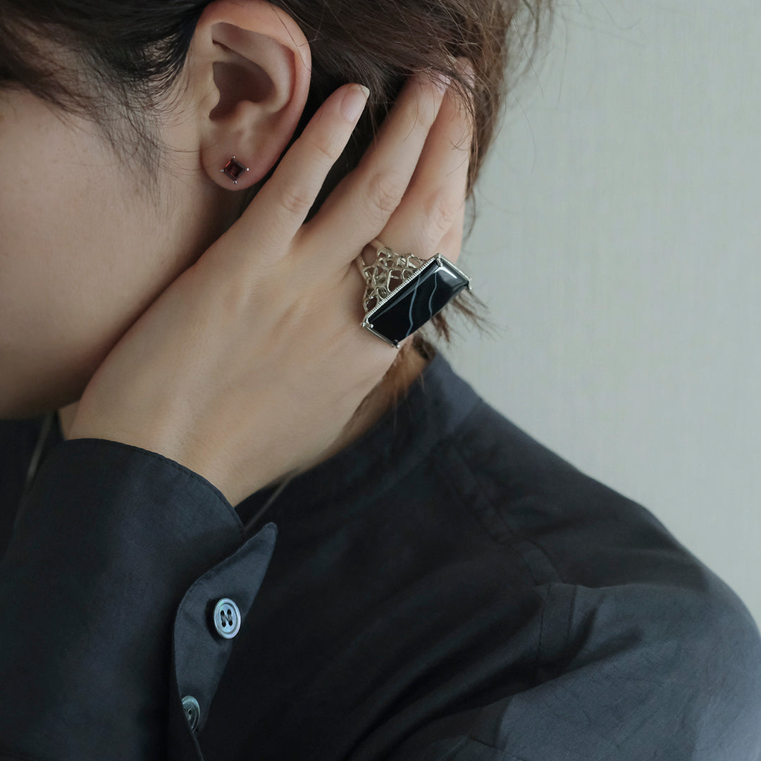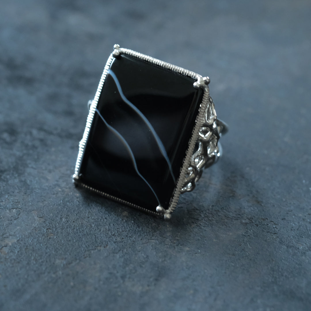 美しい縞模様を宿したアゲートのリング。夜空を閉じ込めた額縁のようなスクエアストーンを、繊細なミル打ちシルバーでトリミング。