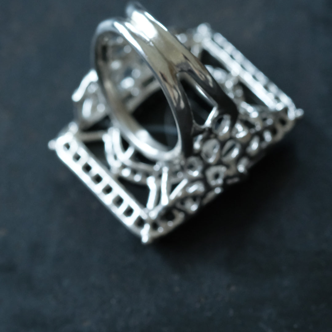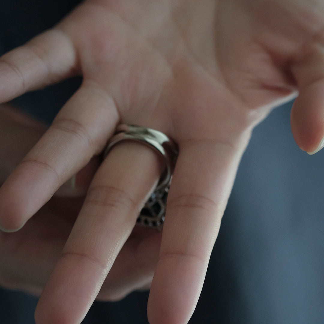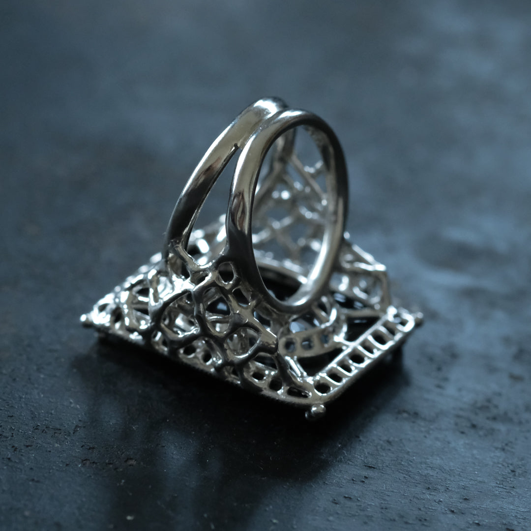 石の個性に合わせたシルバーの装飾は、装身具LCFならではの仕事。俯瞰から見た時もサイドから見た時も鑑賞できるように仕上げられています。
