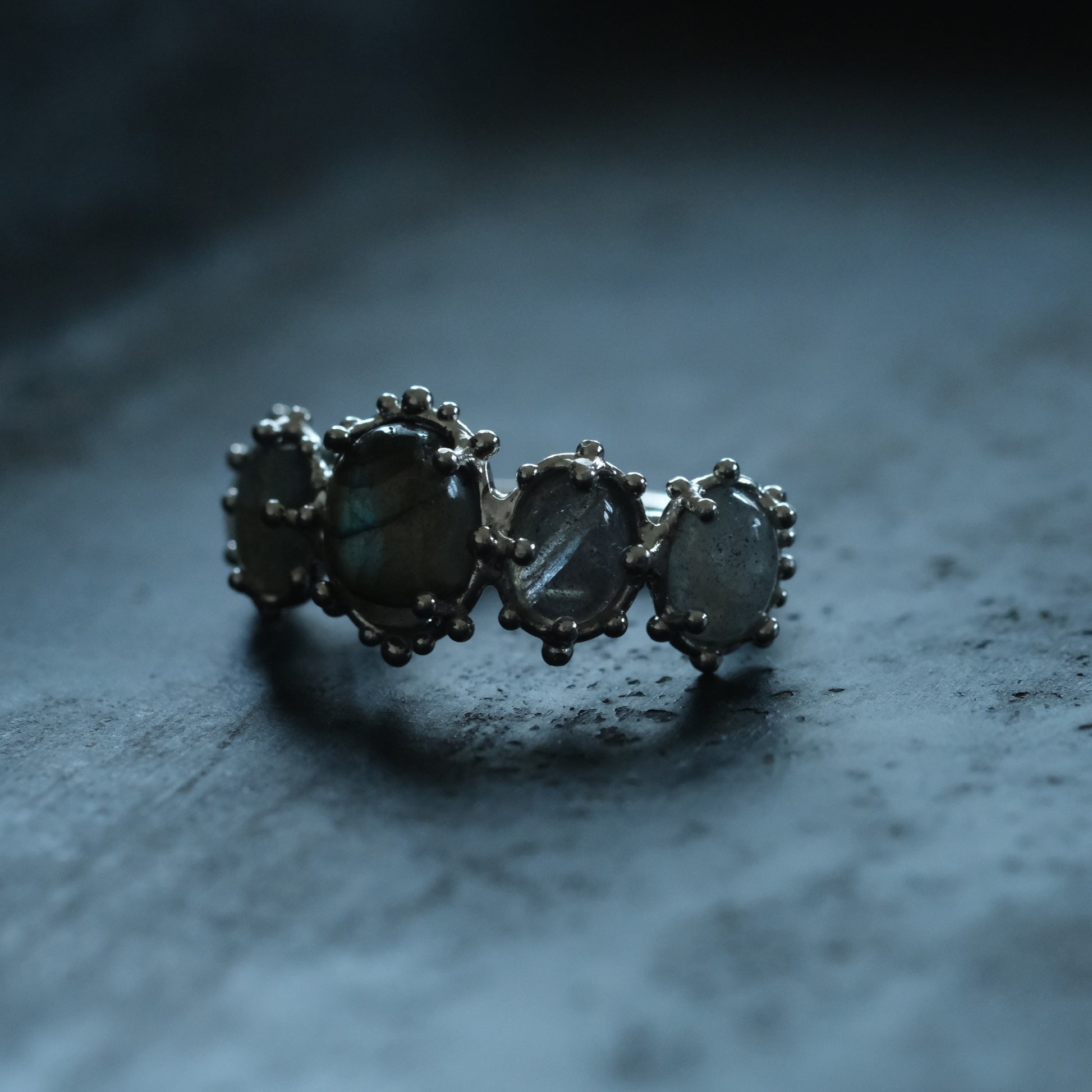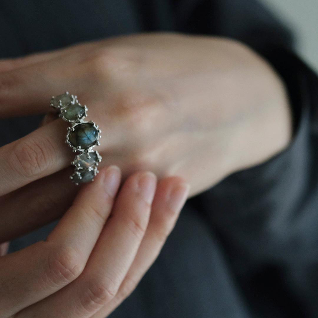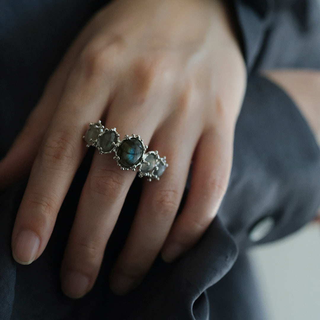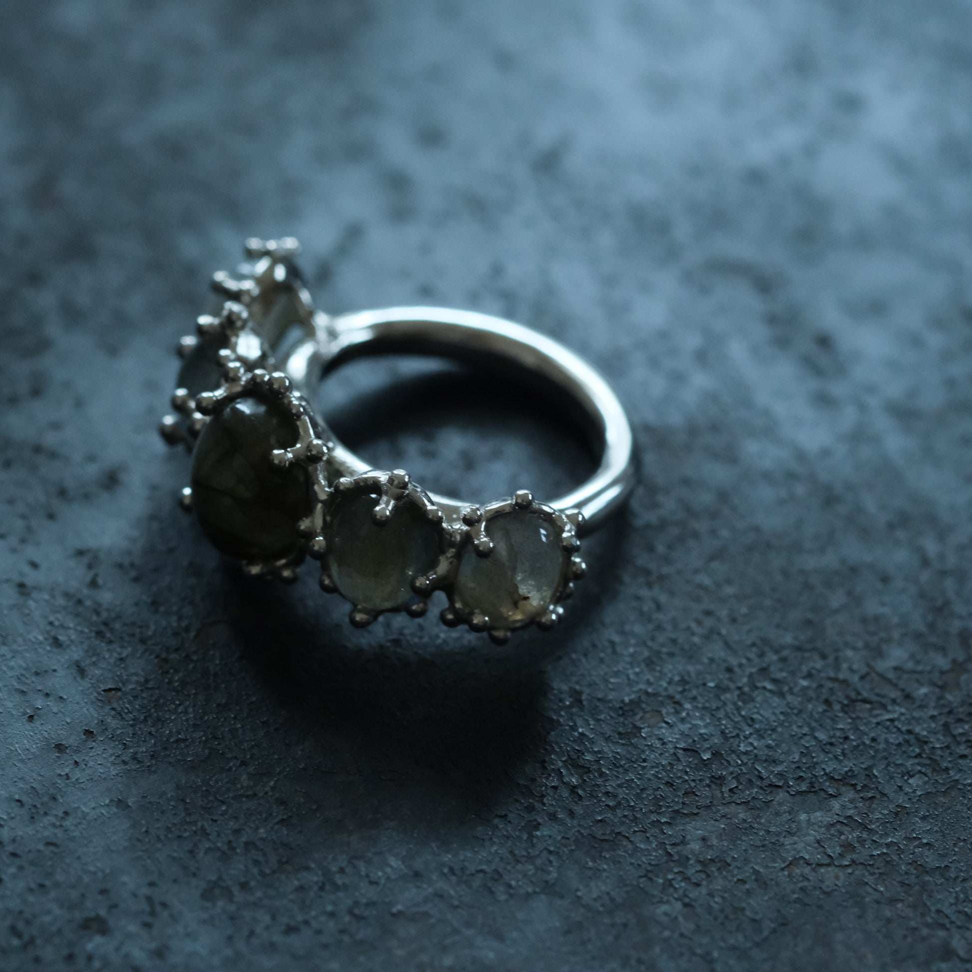 オーロラのように輝くラブラドライトのリング。眺める角度によって5石の色彩が変化する様は唯一無二の存在感です。