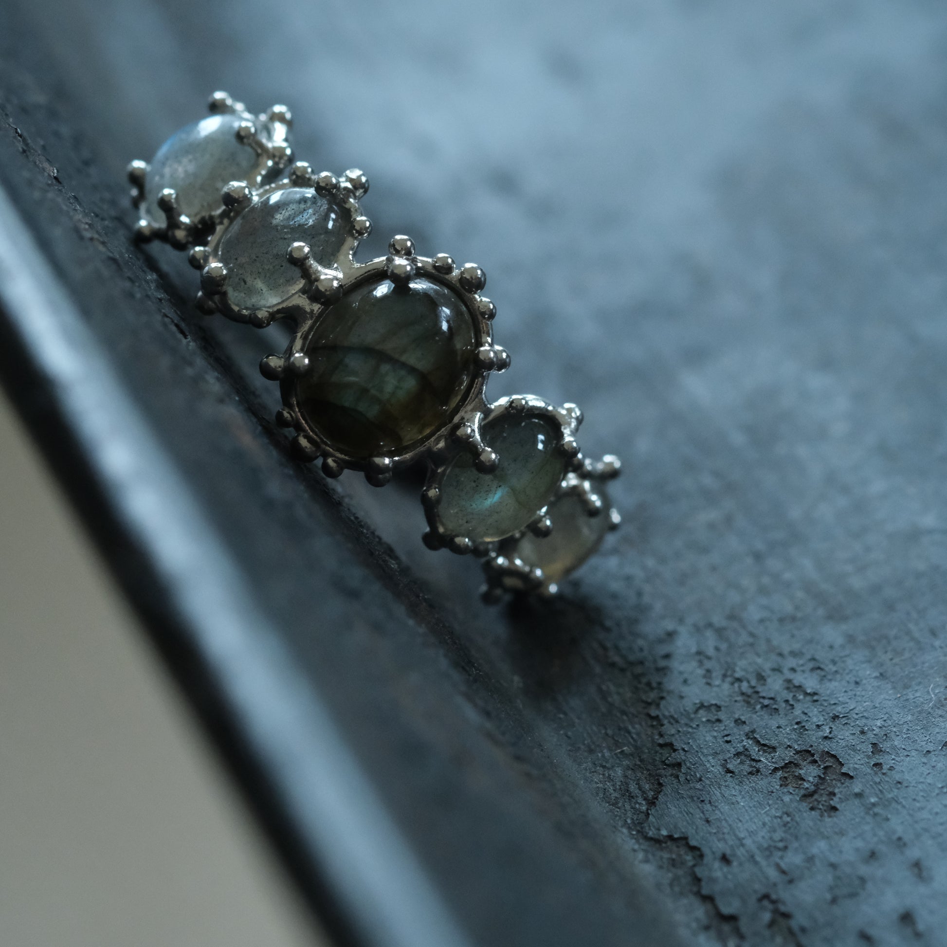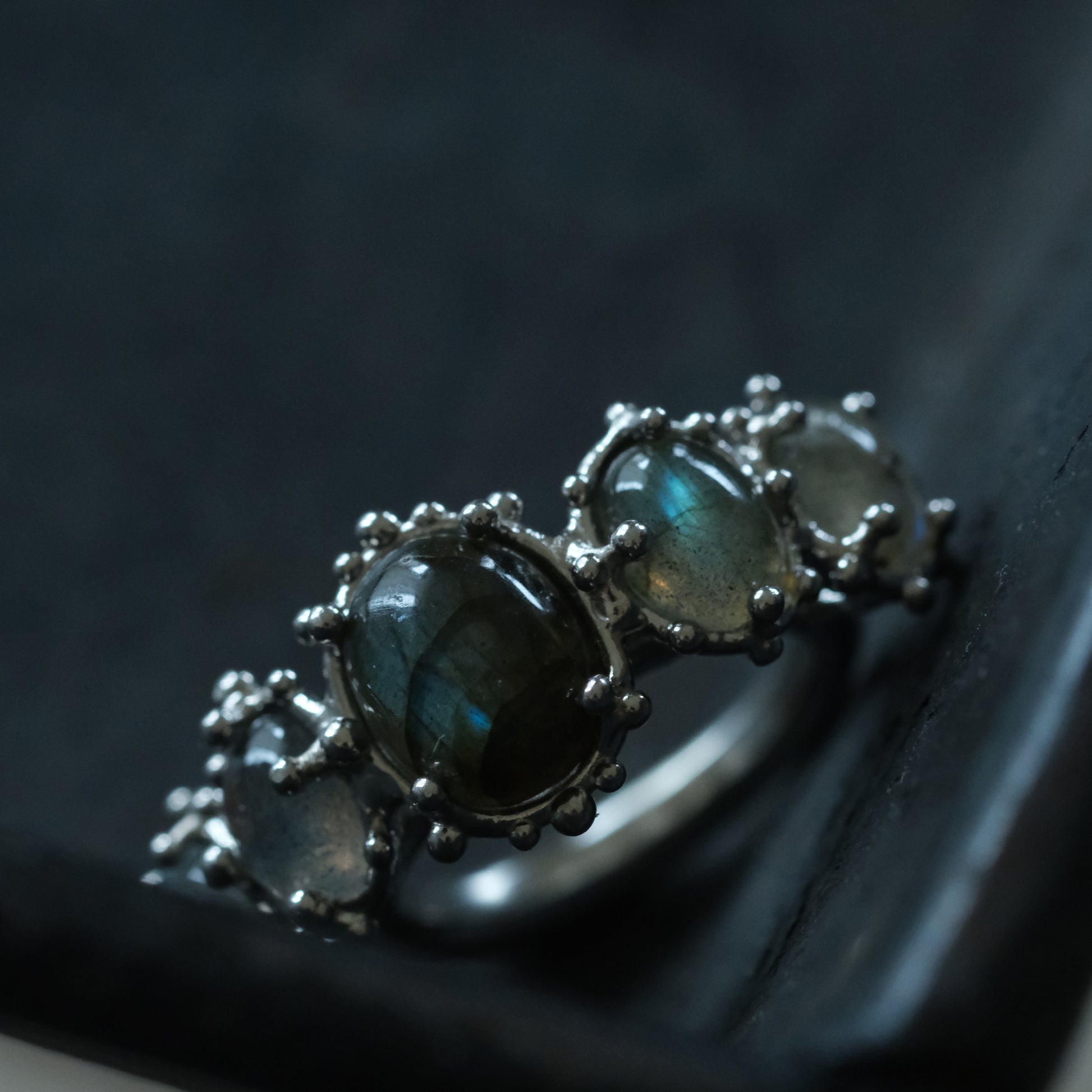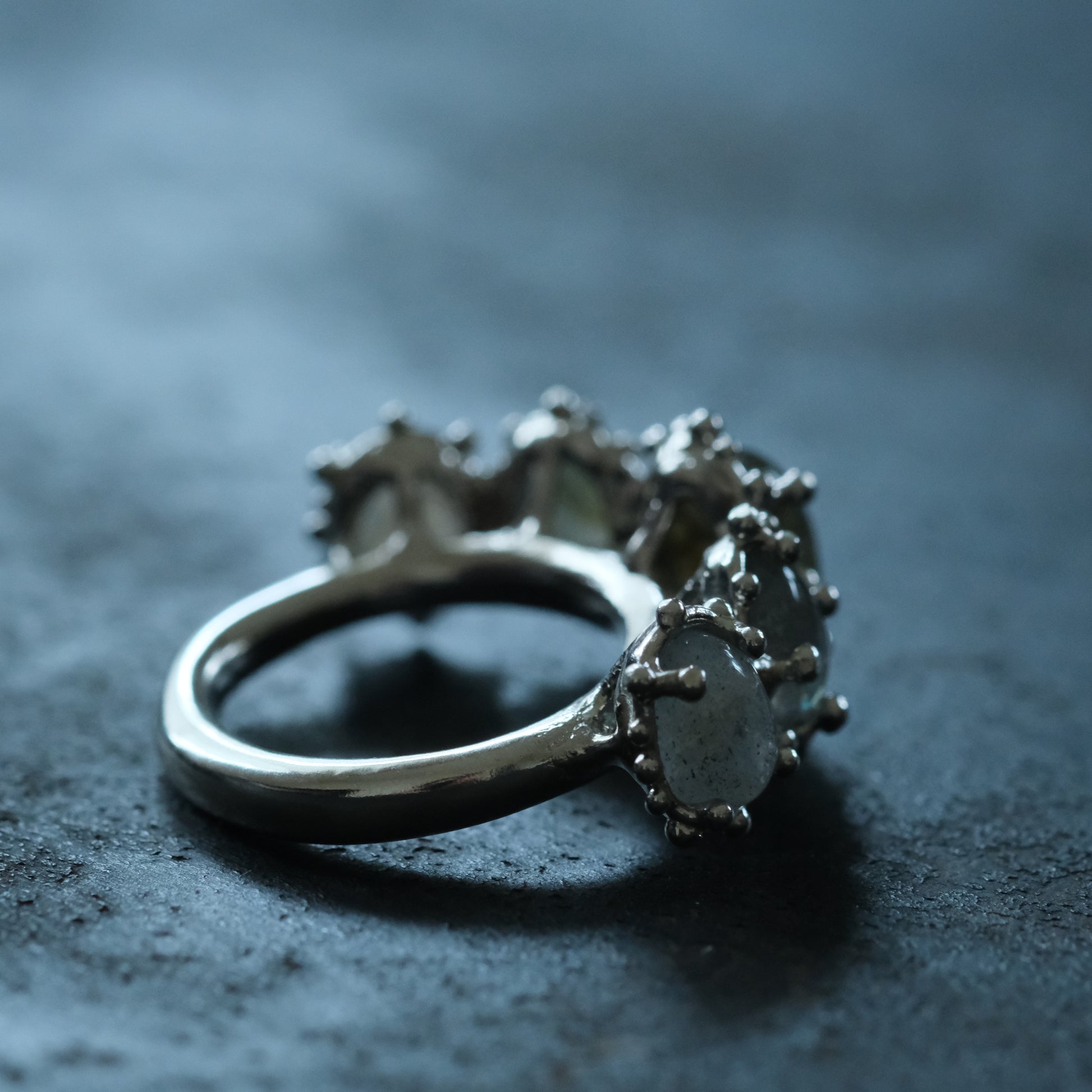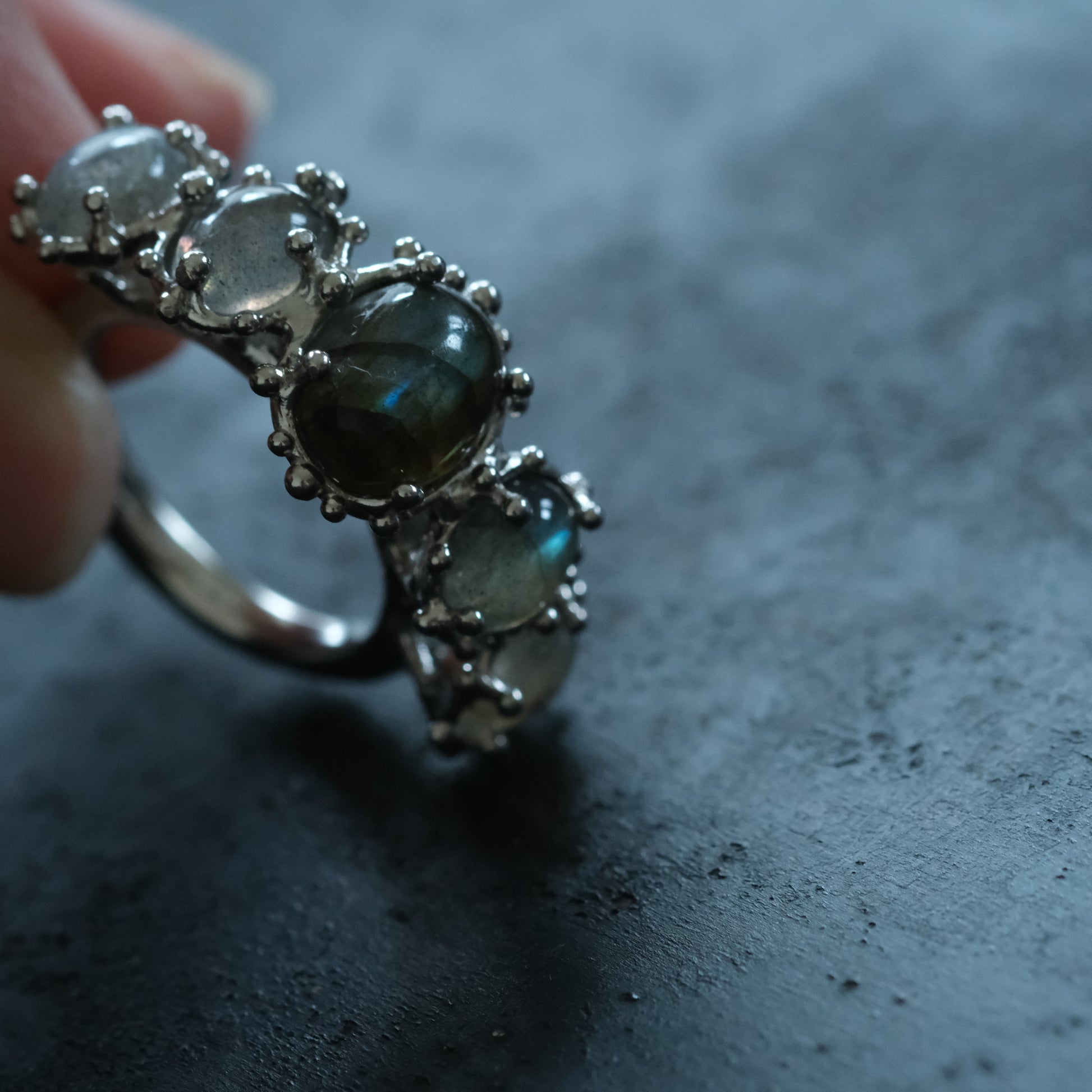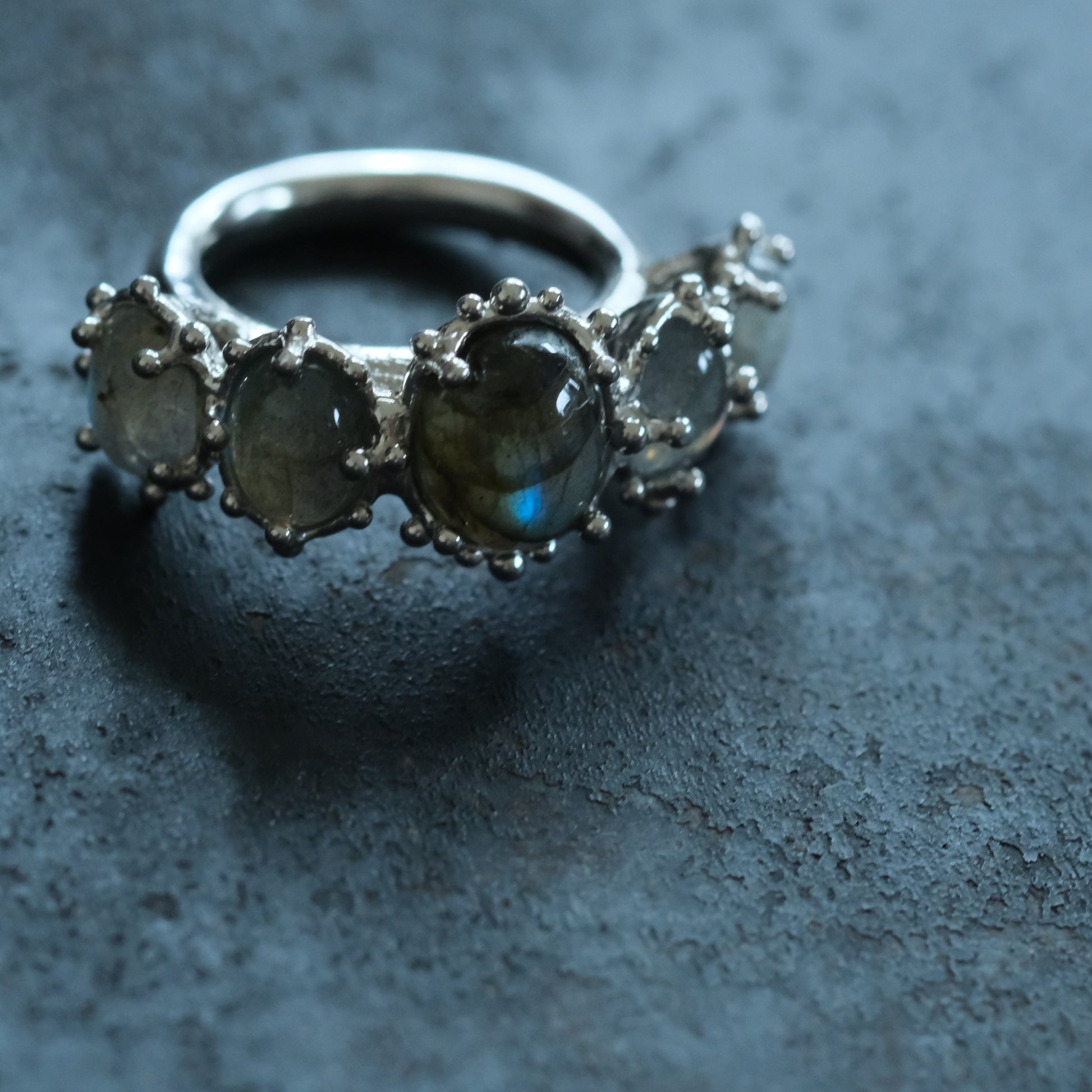 オーロラのように輝くラブラドライトのリング。眺める角度によって5石の色彩が変化する様は唯一無二の存在感です。