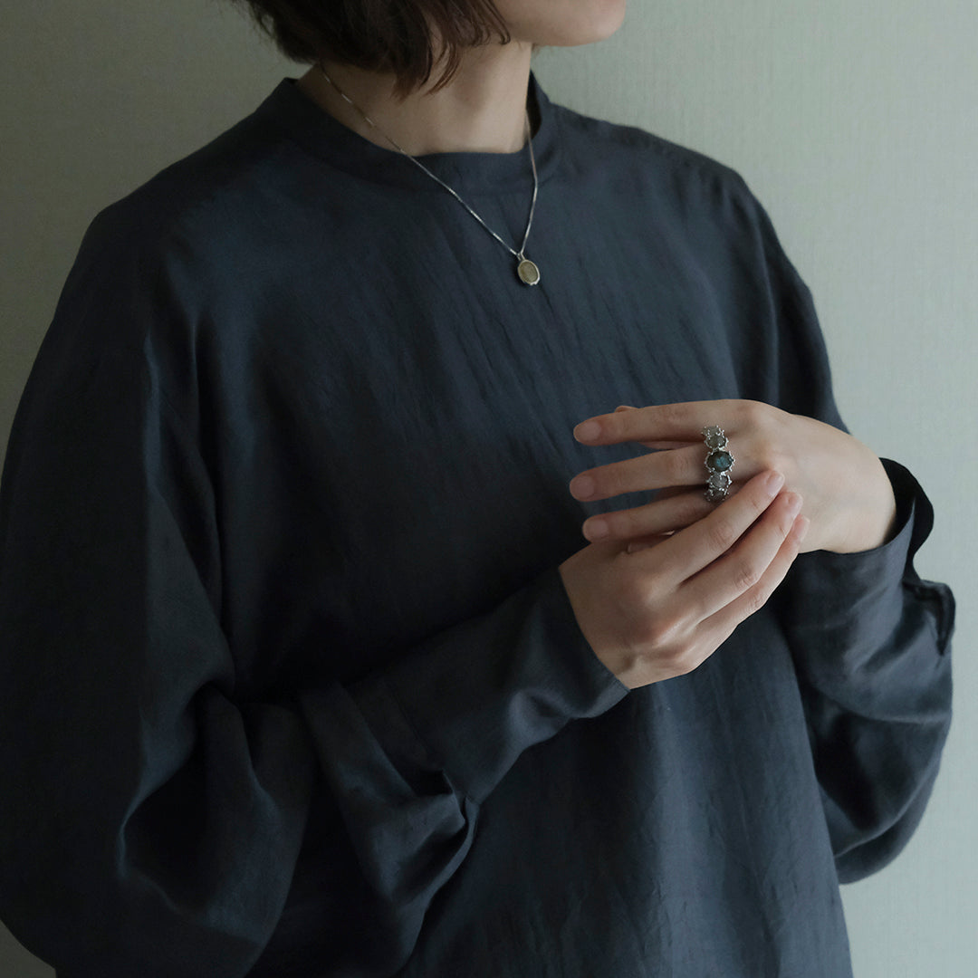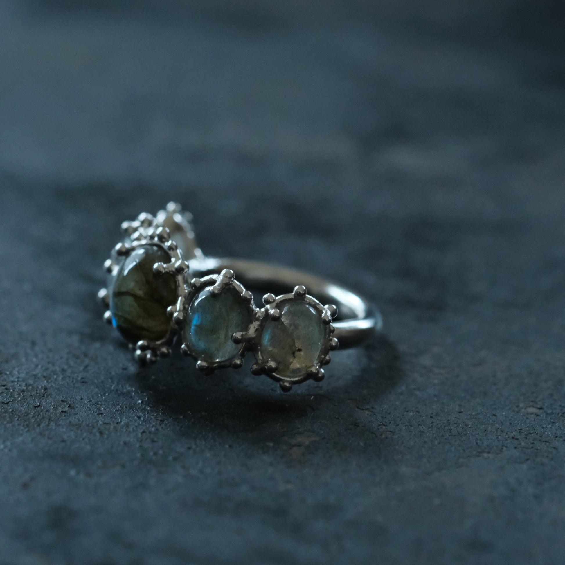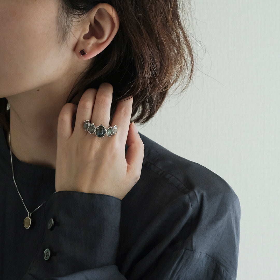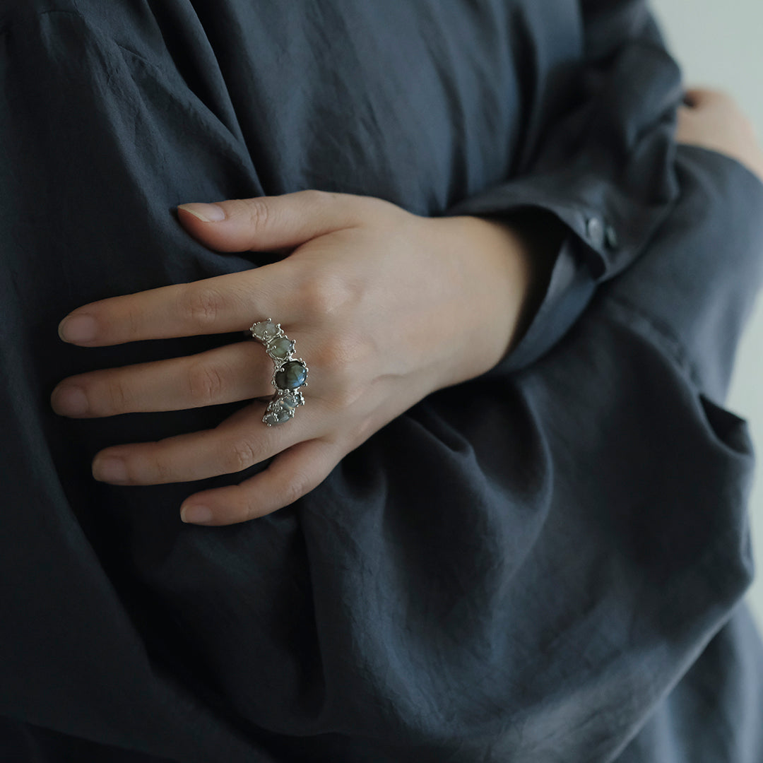 オーロラのように輝くラブラドライトのリング。眺める角度によって5石の色彩が変化する様は唯一無二の存在感です。