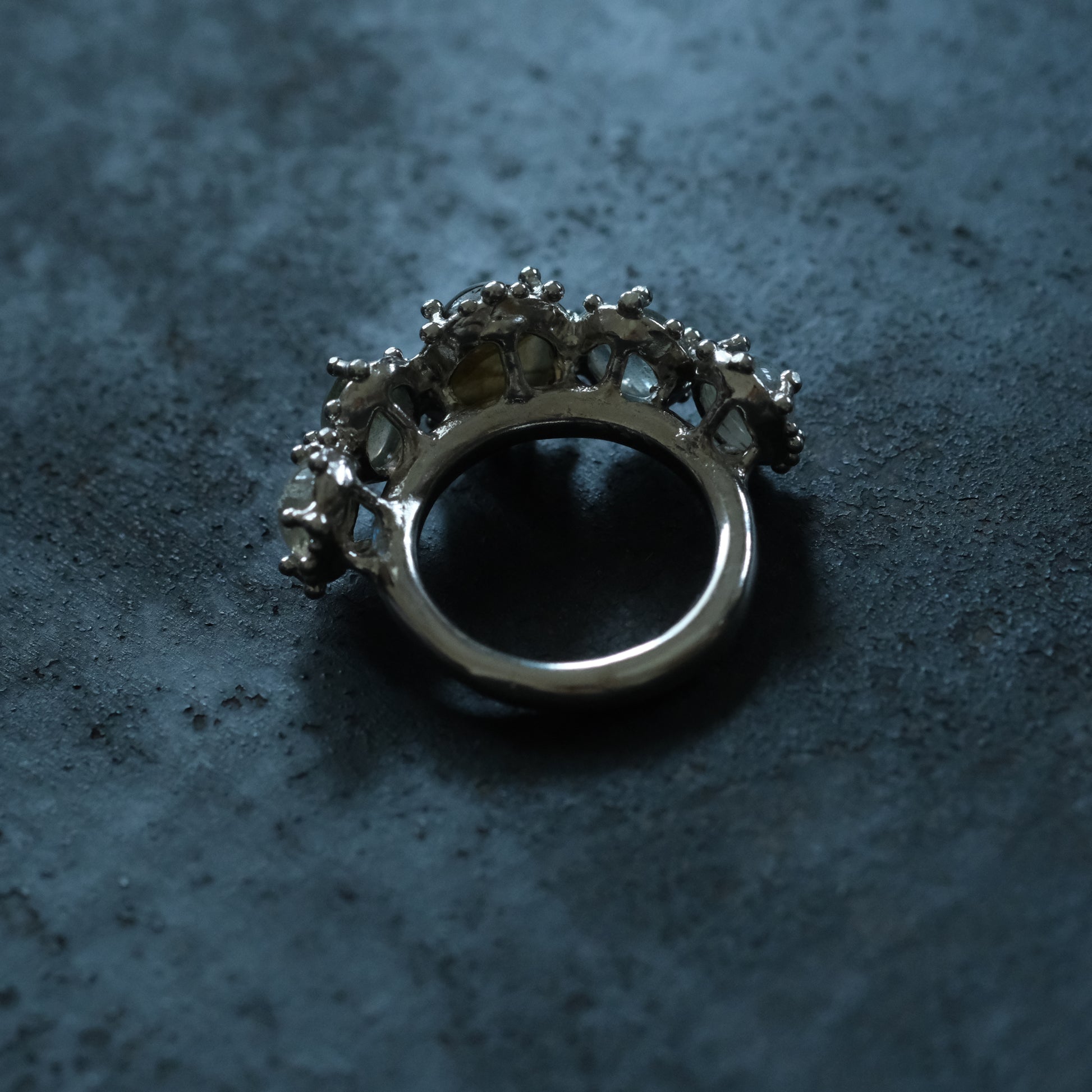 石の個性に合わせたシルバーの装飾は、装身具LCFならではの仕事。俯瞰から見た時もサイドから見た時も鑑賞できるように仕上げられています。