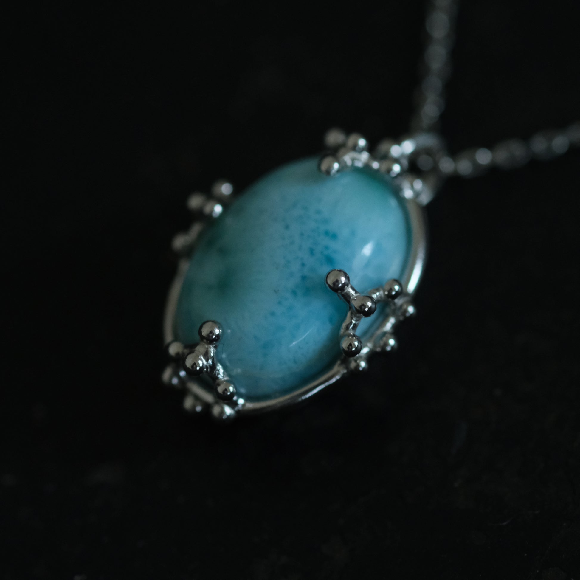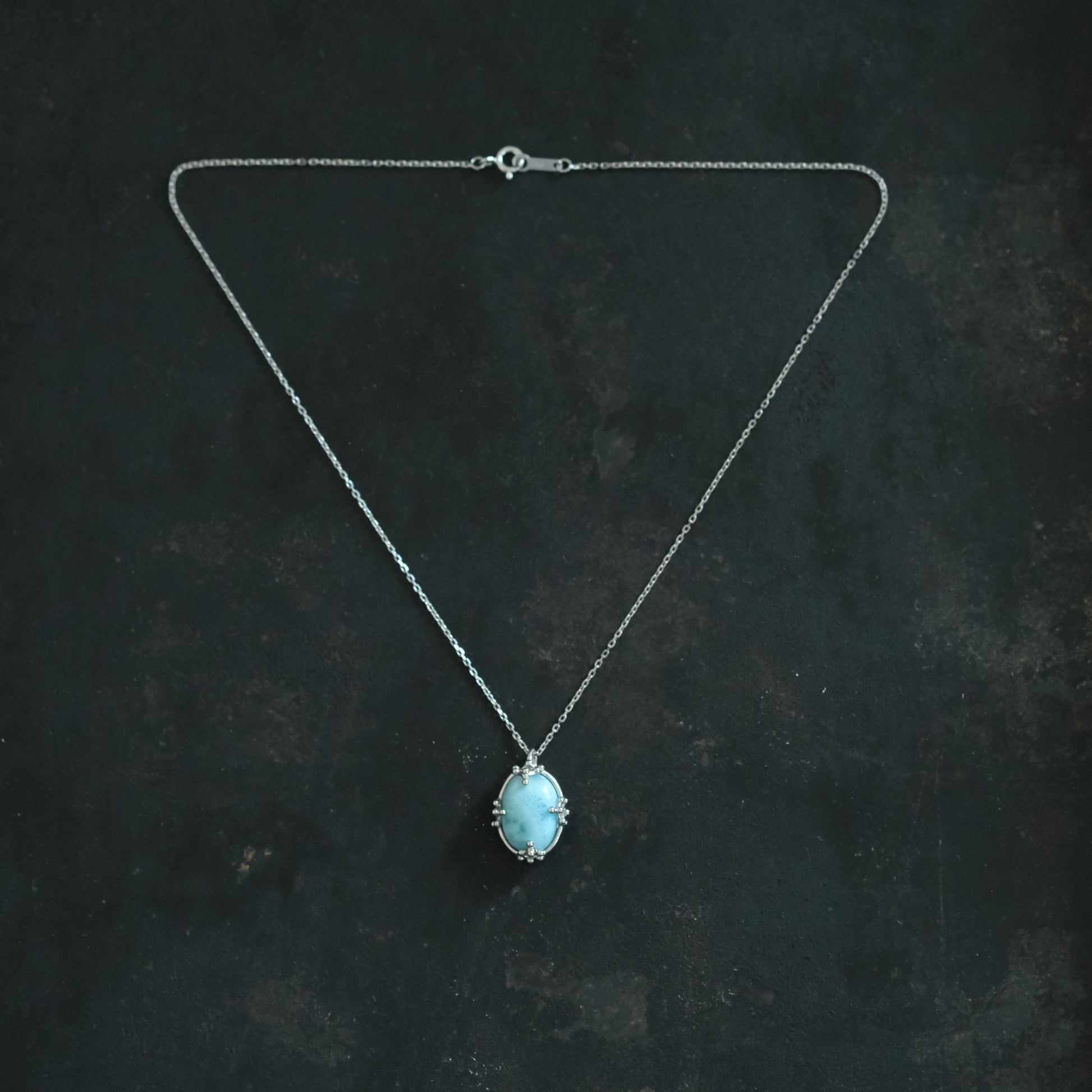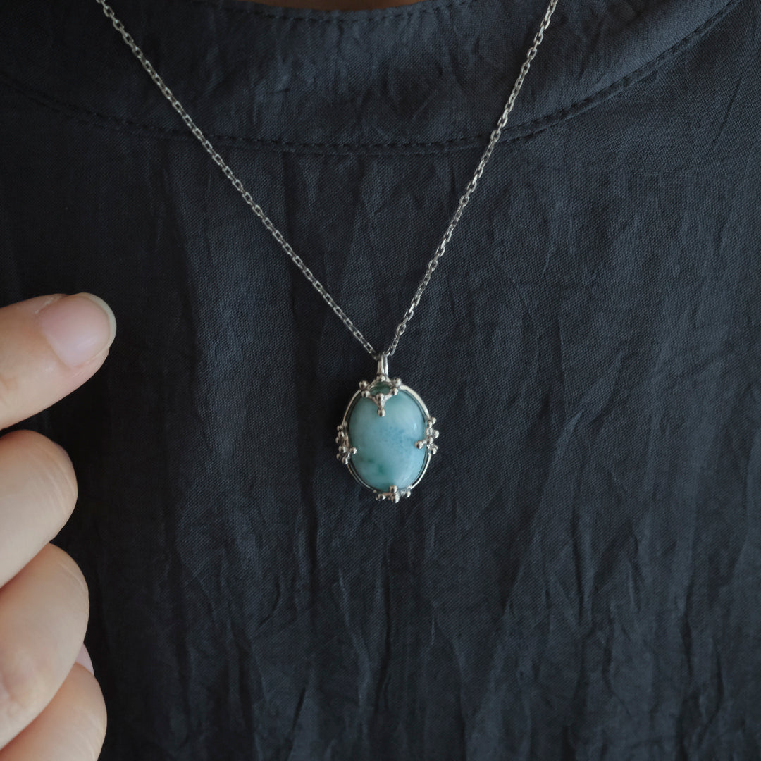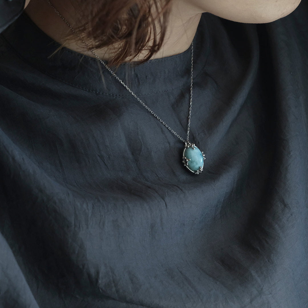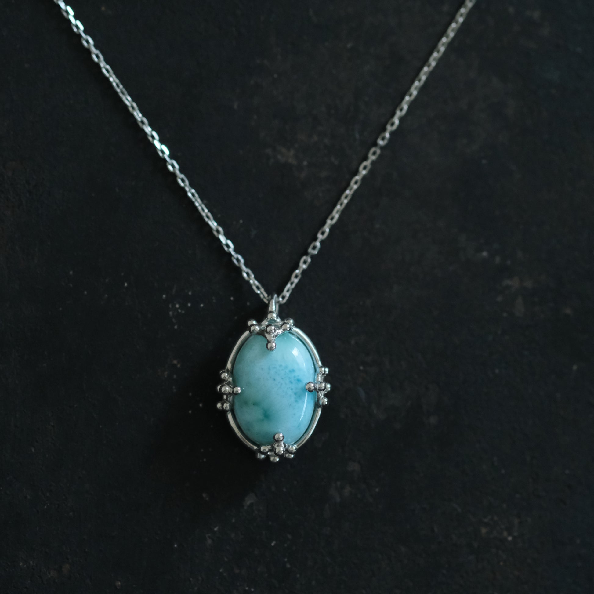 明るい水色の天然石「ラリマー」のネックレス。海や空を思わせるその色彩は「イルカの石」の別名も。身に着けるだけで穏やかな気持ちを運んでくれそうです。