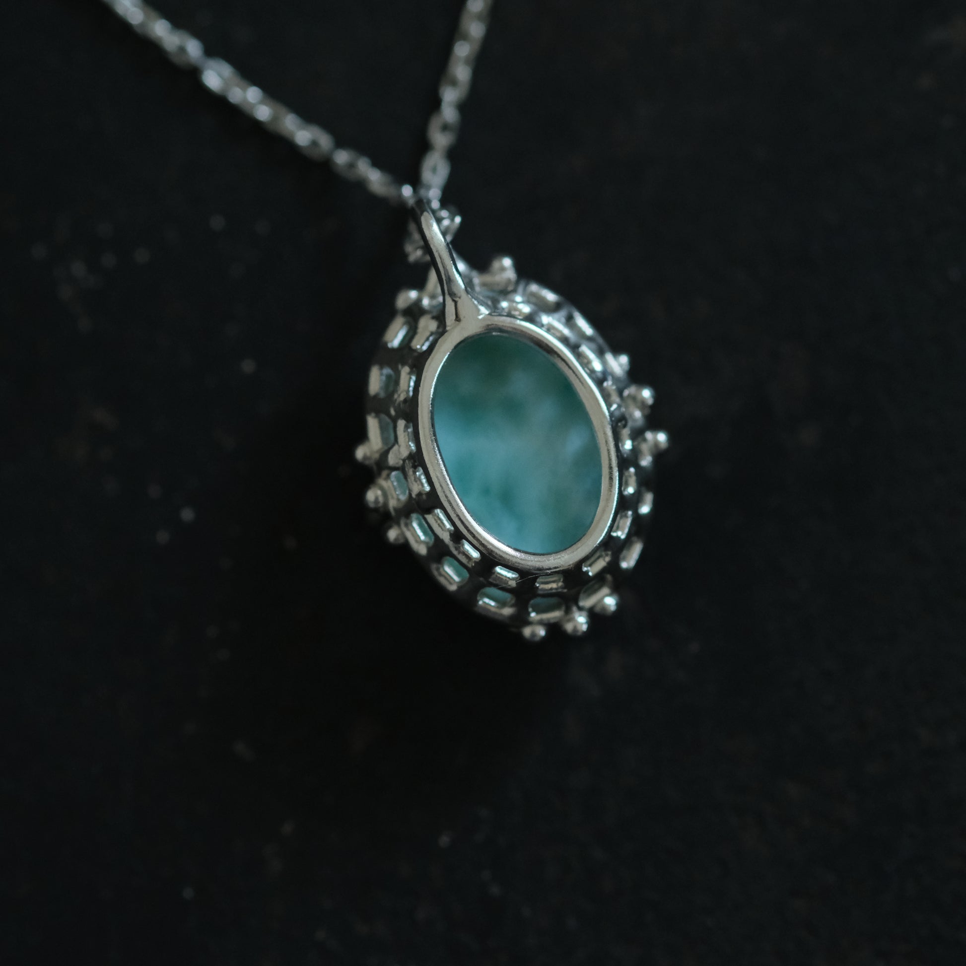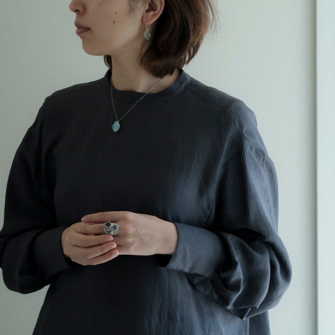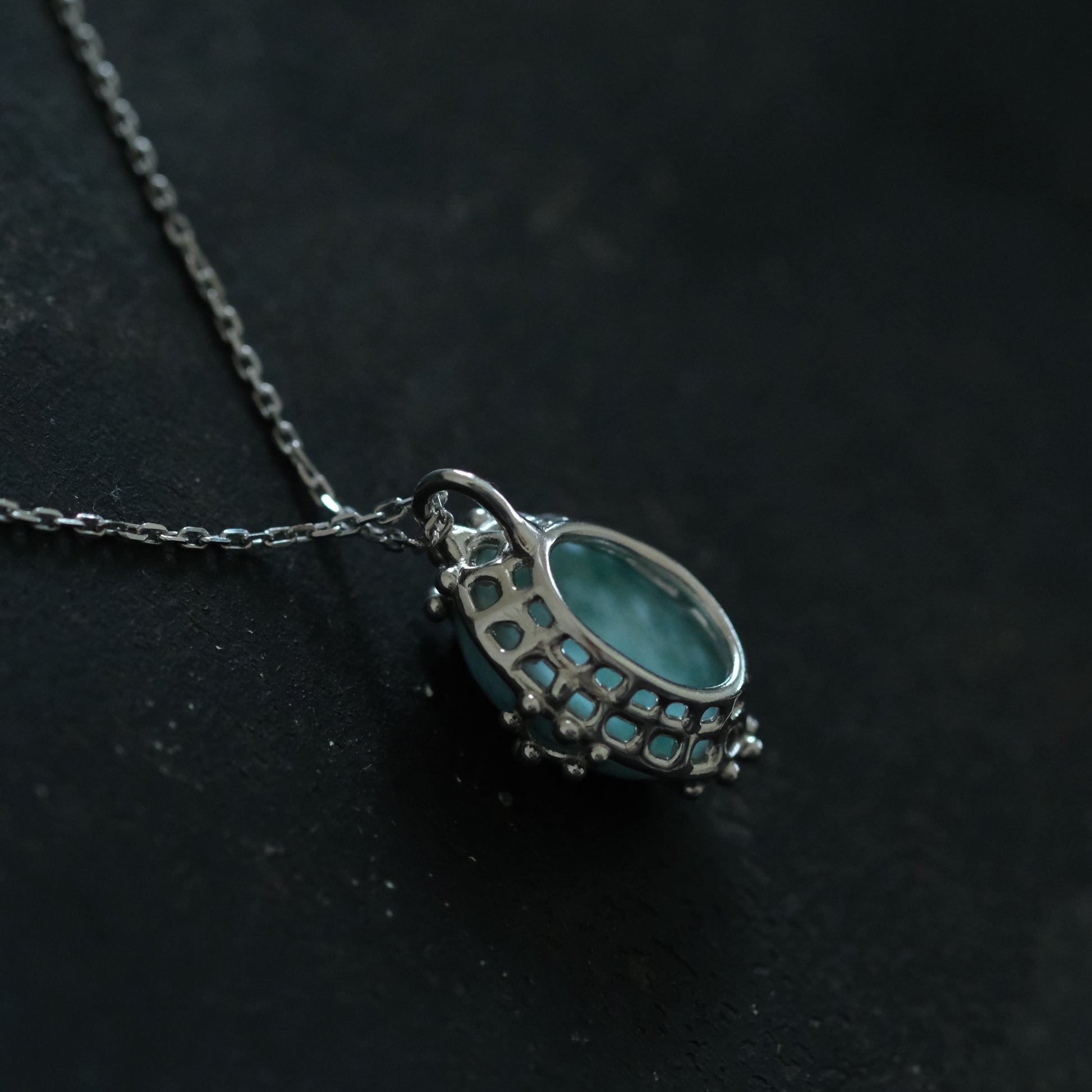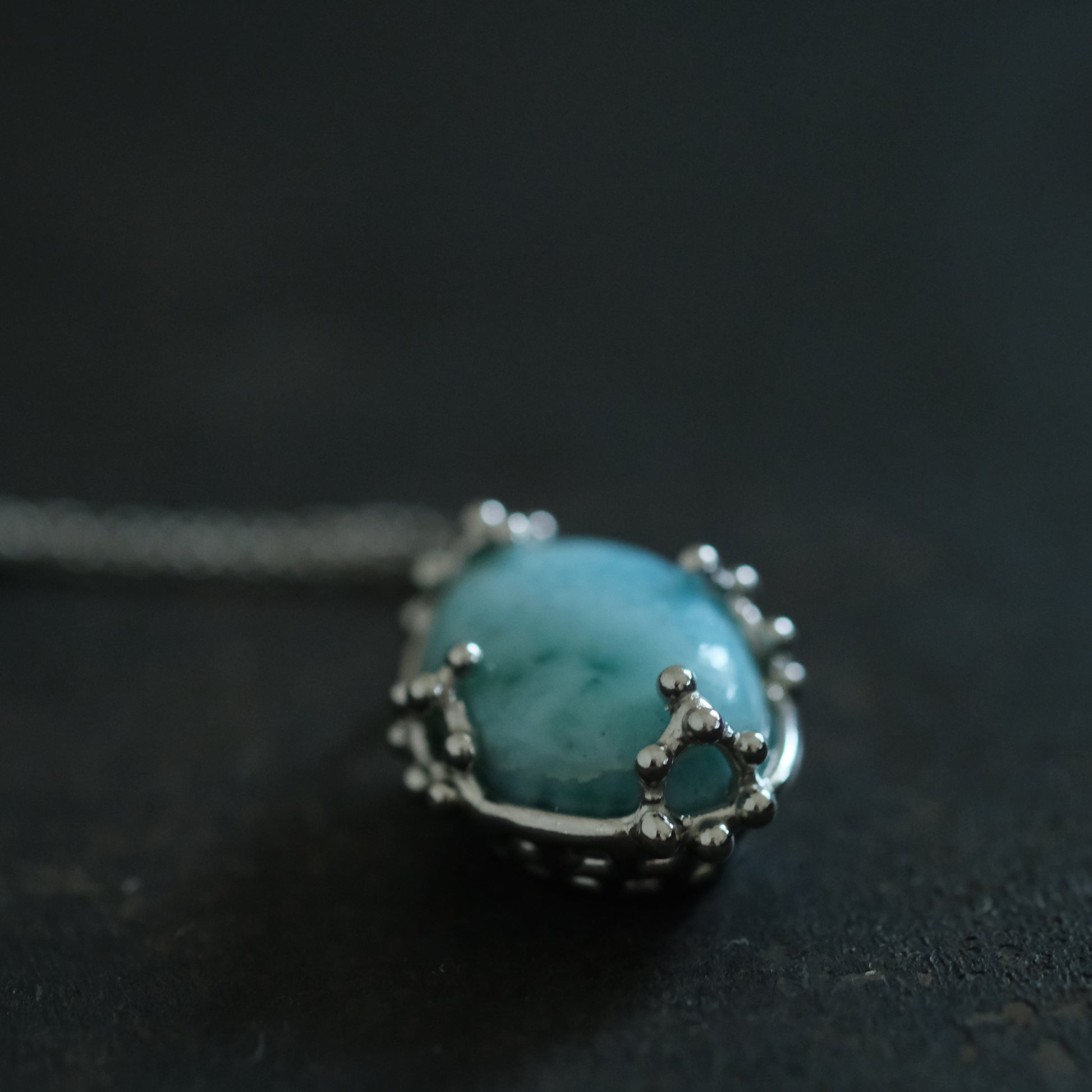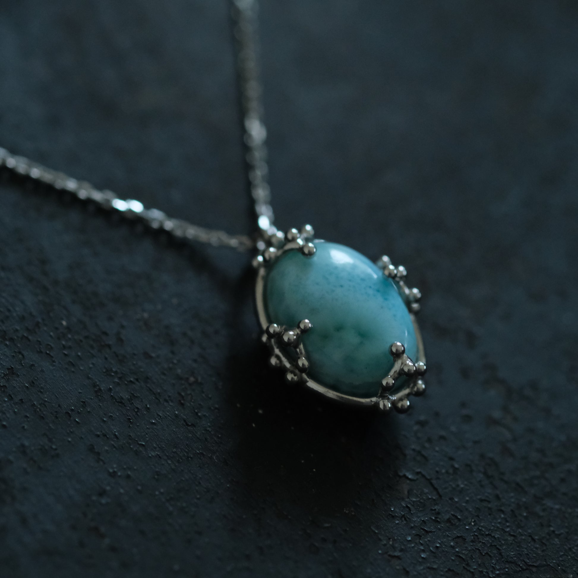 明るい水色の天然石「ラリマー」のネックレス。海や空を思わせるその色彩は「イルカの石」の別名も。身に着けるだけで穏やかな気持ちを運んでくれそうです。