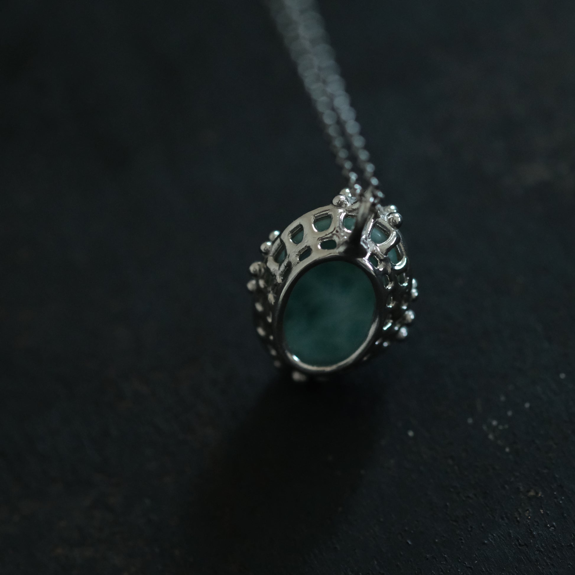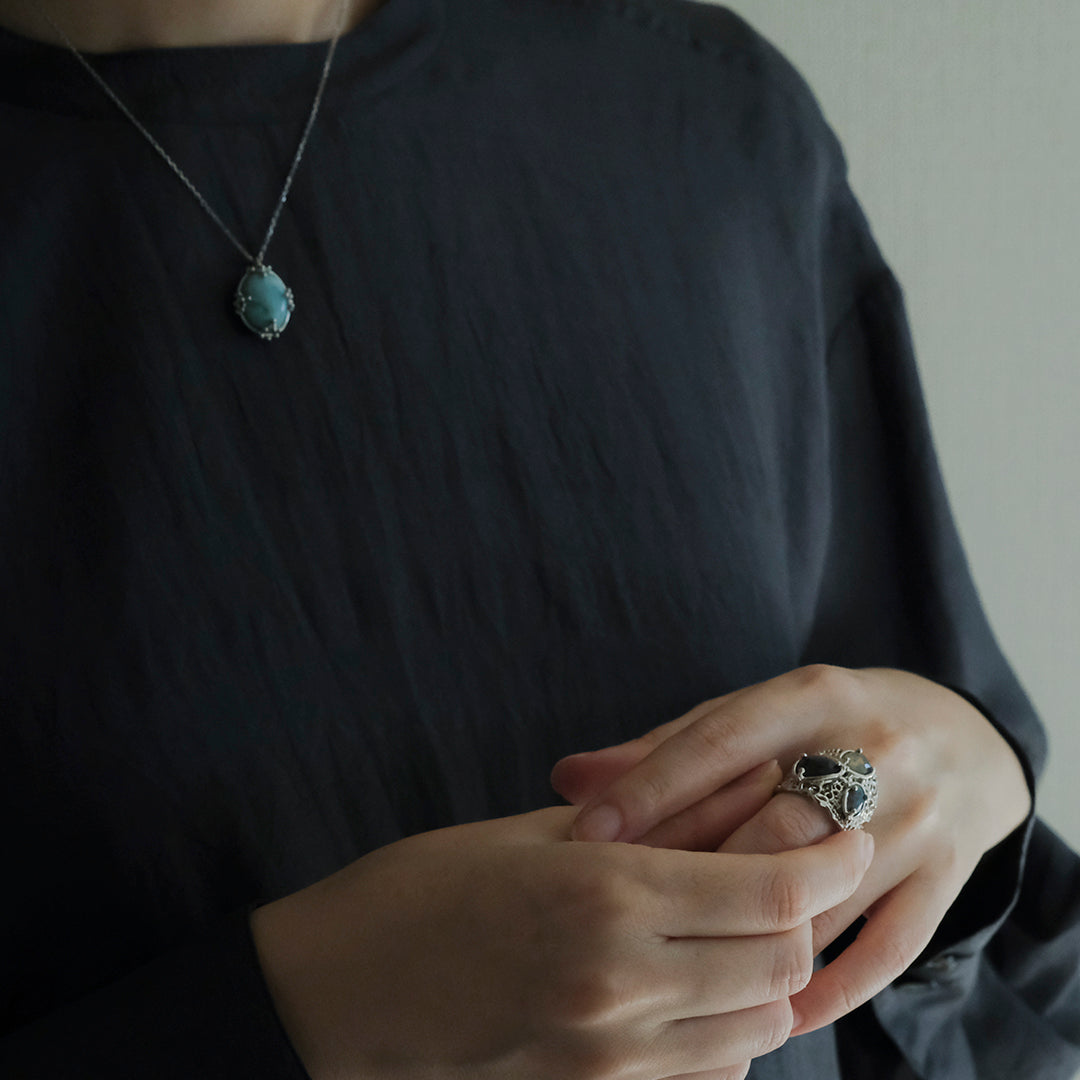 石の個性に合わせたシルバーの装飾は、装身具LCFならではの仕事。俯瞰から見た時もサイドから見た時も鑑賞できるように仕上げられています。