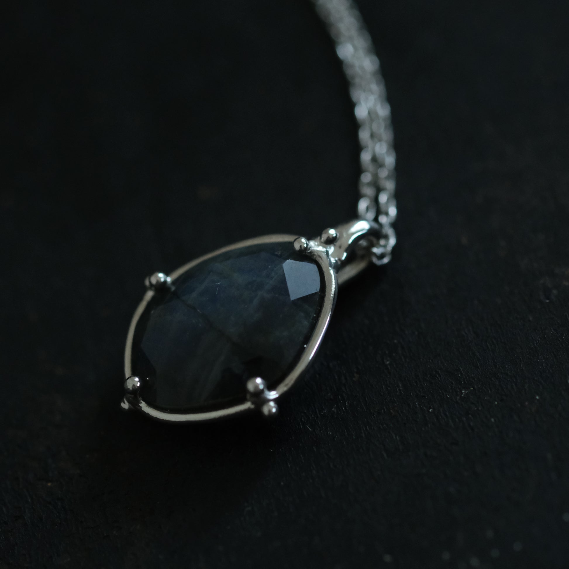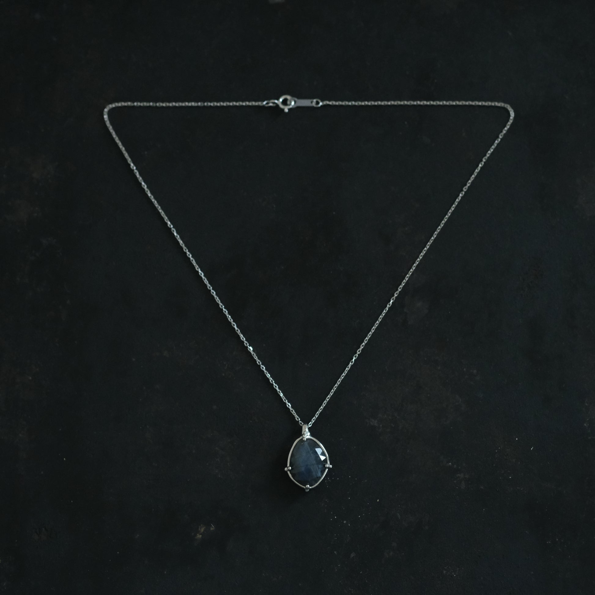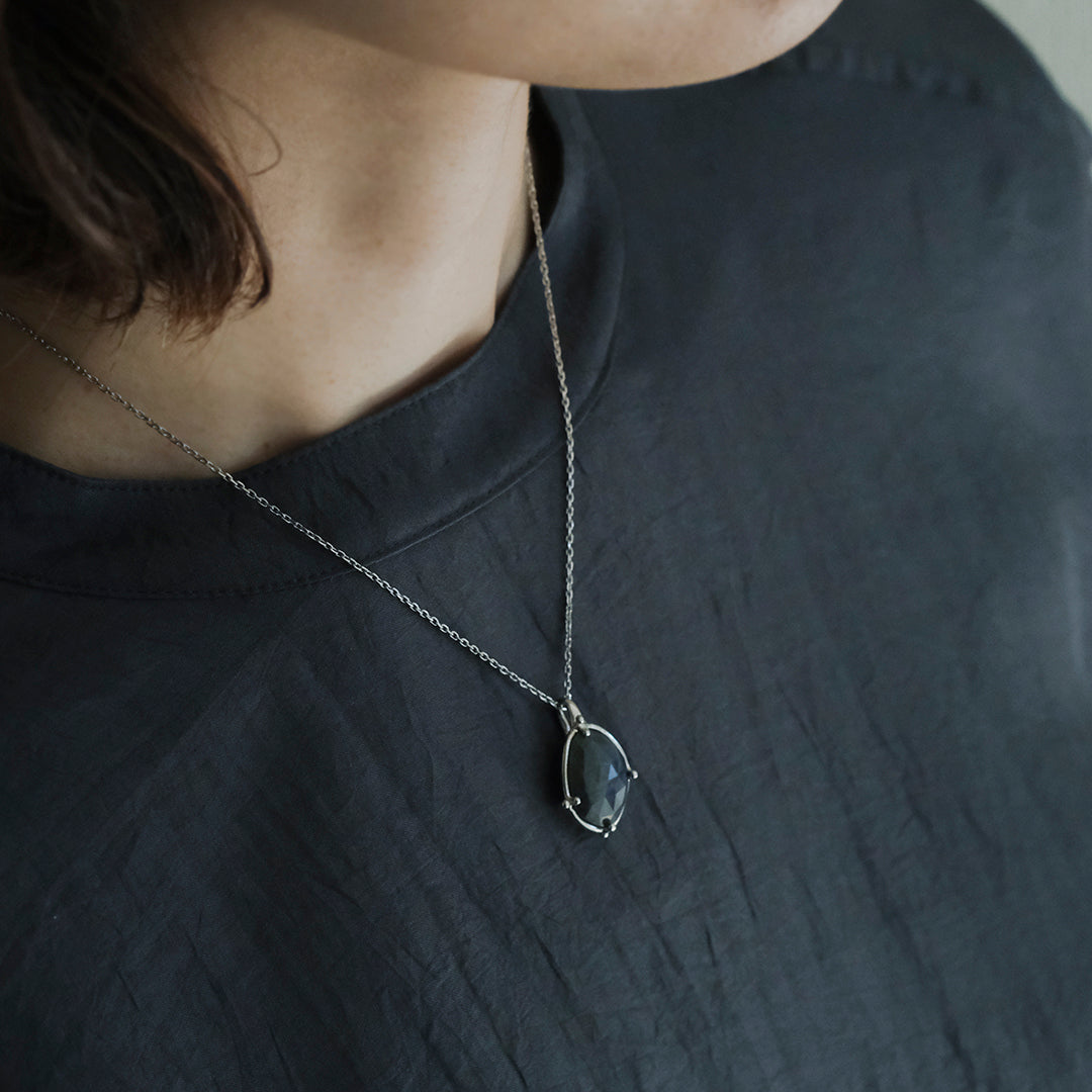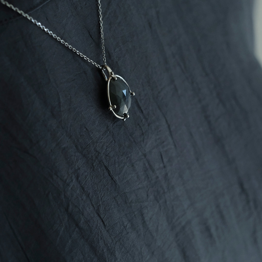 吸い込まれそうな深いブルーのブラックオパールネックレス。オパールならではの遊色効果が楽しめて、ずっと眺めていても飽きさせない魅力があります。
