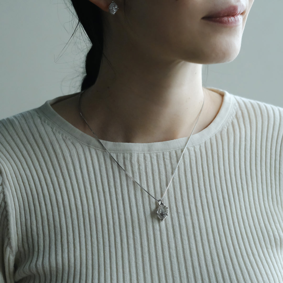 光の加減で変わる煌きが胸元を華やかに演出。デザインは同じでも石のかたちが異なりますので、お好みのものをお選びください。