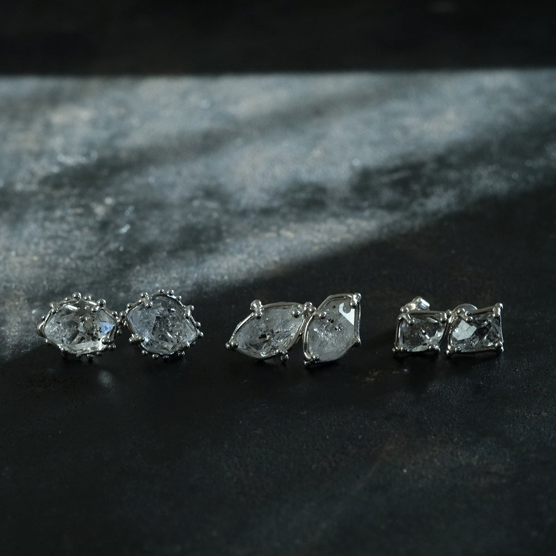 石一つ一つの個性を見極めながらアクセサリーに仕立てる装身具LCFの「原石水晶シリーズ」。こちらは直付けタイプのシンプルなピアス。小粒ながら一番星のようなきらめきです。