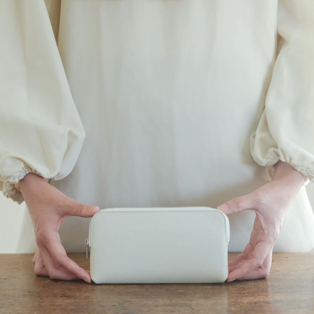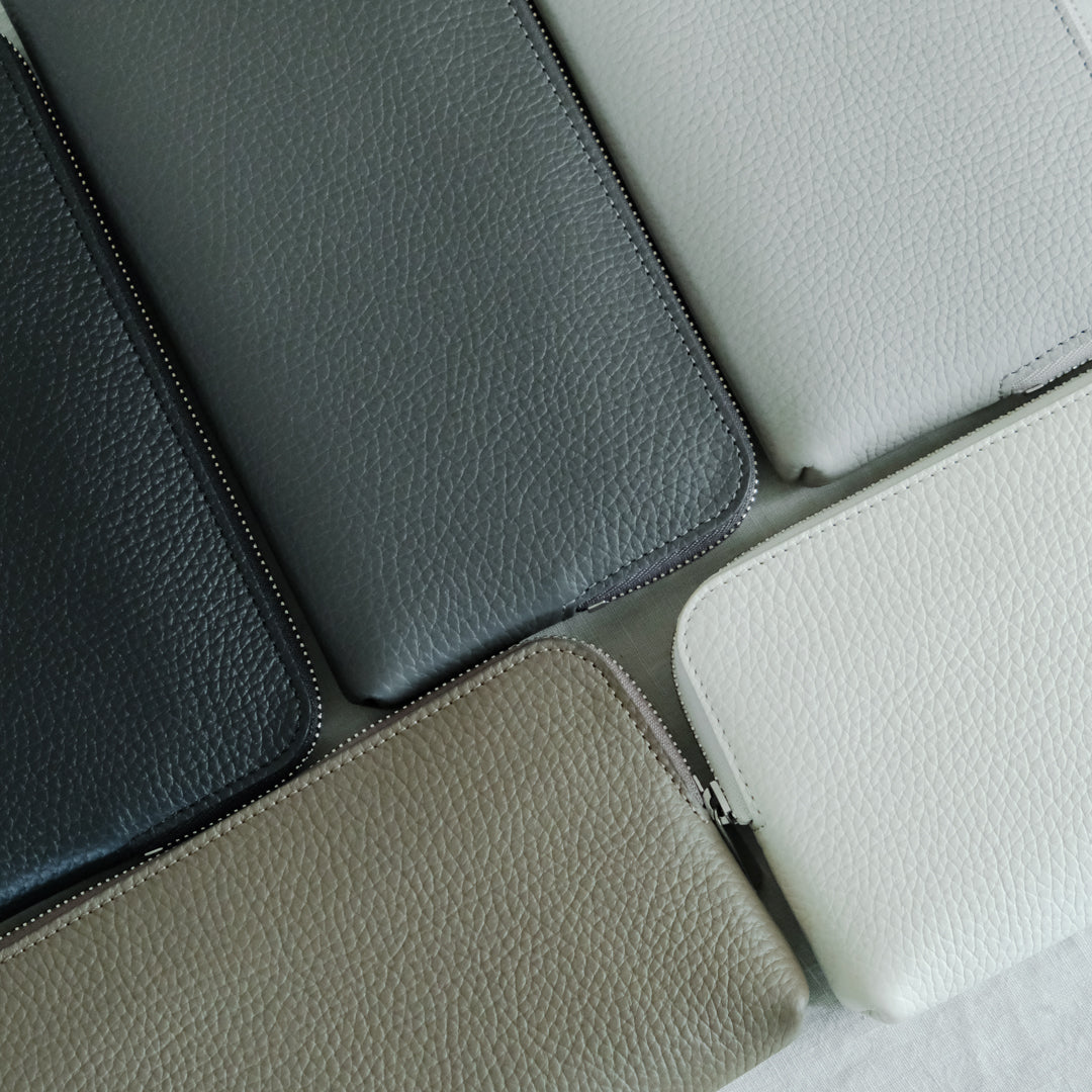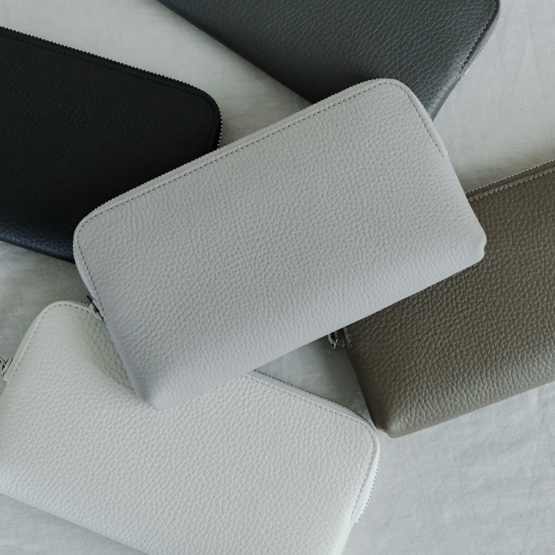 型押しのシュリンク加工を施した、柔らかく手なじみのよい革。使用や経年による色や質感の変化が出にくく、キズなどが目立ちにくいため、気を遣わずにご使用いただけます。色はブラック、グレー、ライトグレー、ホワイト、トープの5色です。