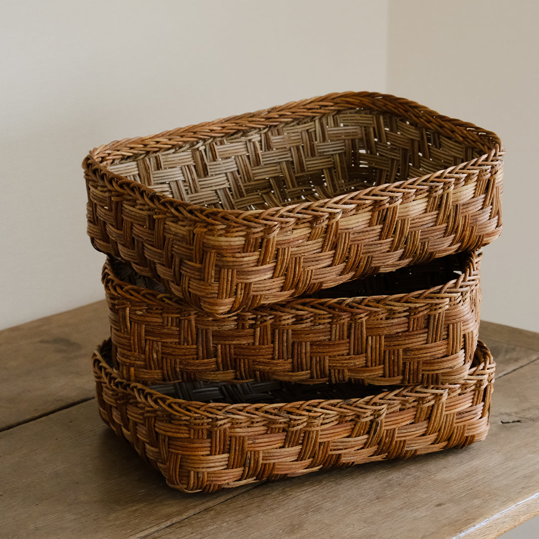 A4サイズが入る整理篭を、編み目の美しい「あじろ編み」でつくってもらいました。書類を入れたり、食器の保管などなにかと便利な整理篭。高さは食器棚にも入れやすいように低めに設定しました。