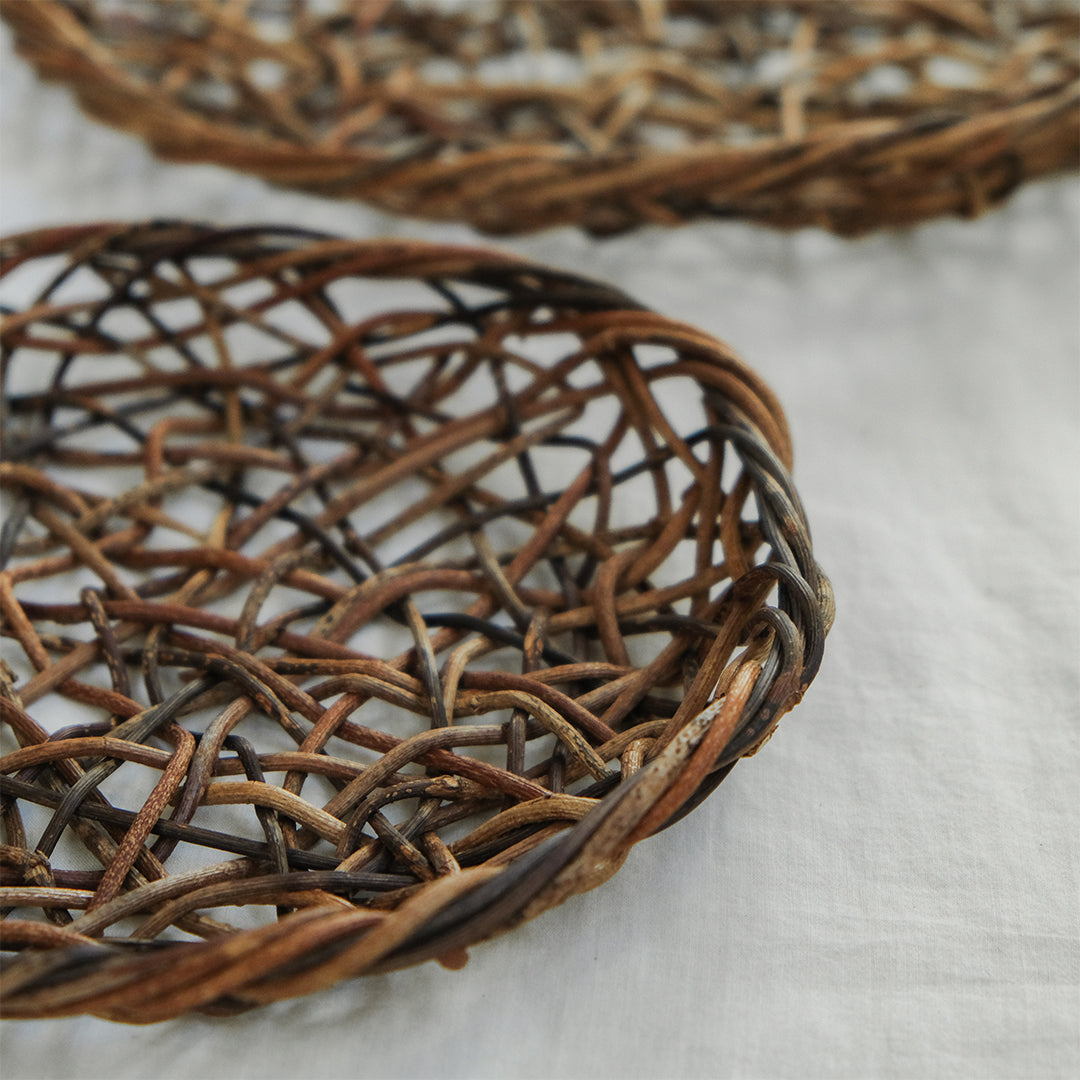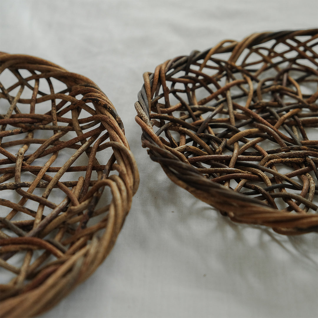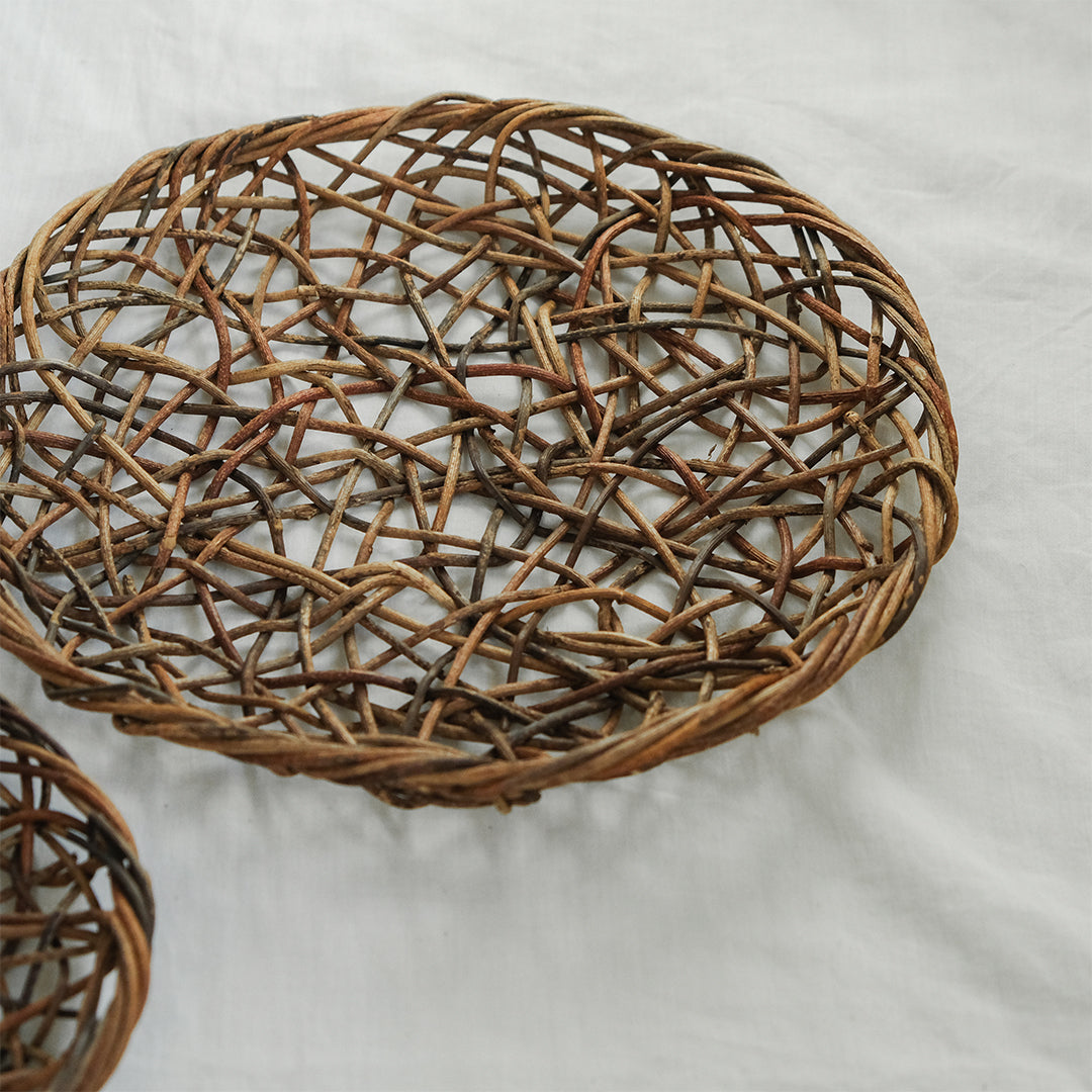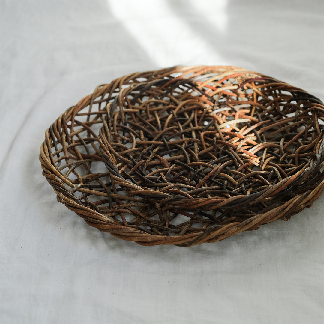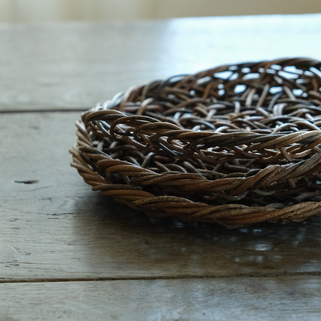あけびの一本蔓をつかい、伝統的な「乱れ編み」でつくった素朴な編み皿。一見無造作に編まれた丸皿は、自然の無骨さの中にしなやかな美しさが感じられます。