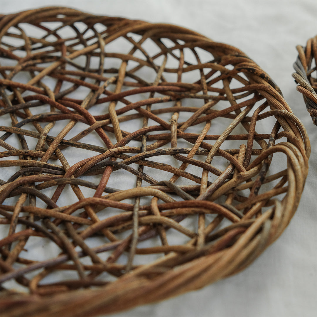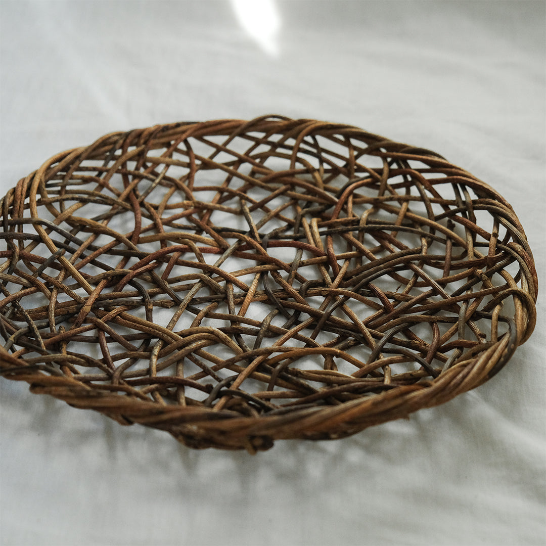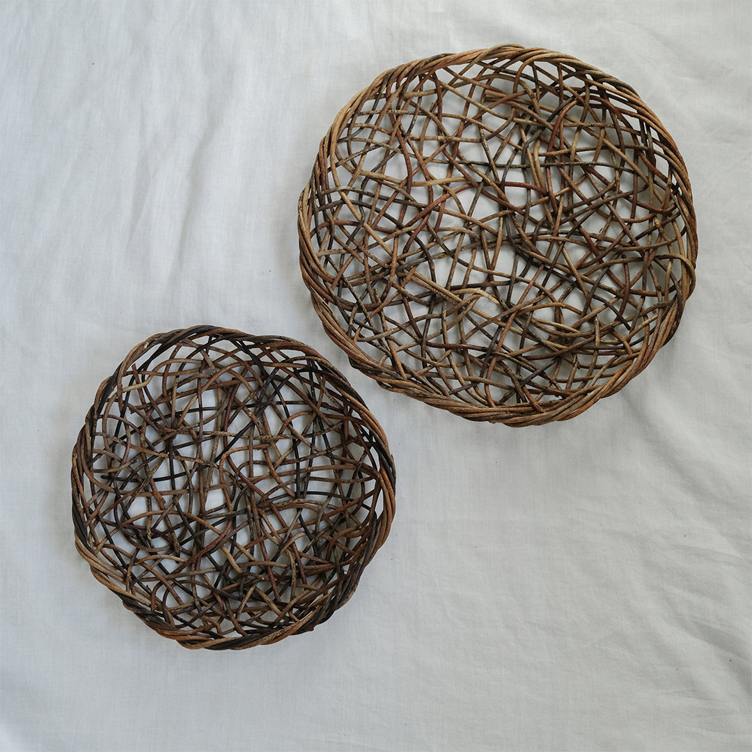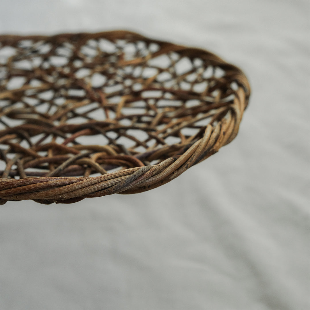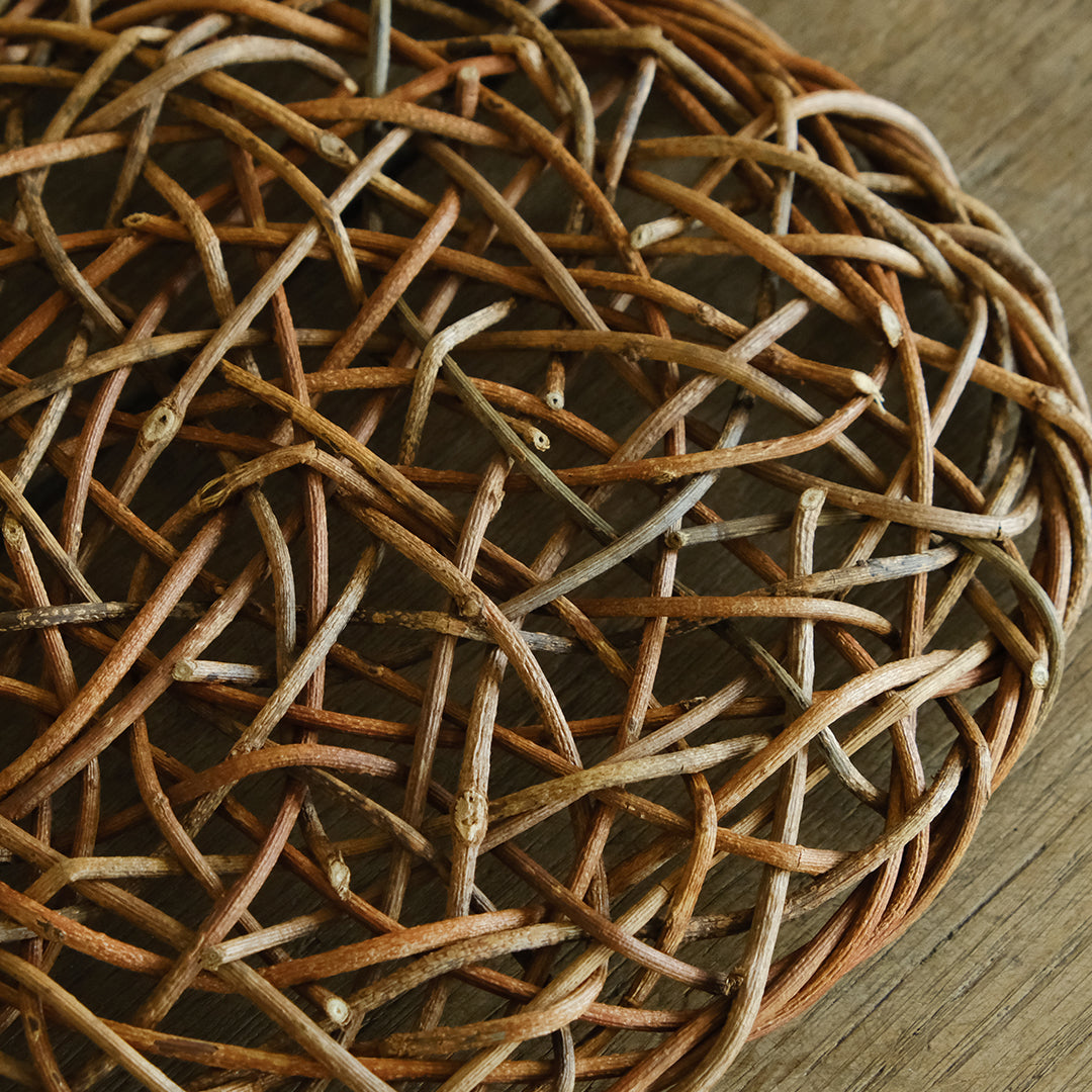 あけびの一本蔓をつかい、伝統的な「乱れ編み」でつくった素朴な編み皿。一見無造作に編まれた丸皿は、自然の無骨さの中にしなやかな美しさが感じられます。