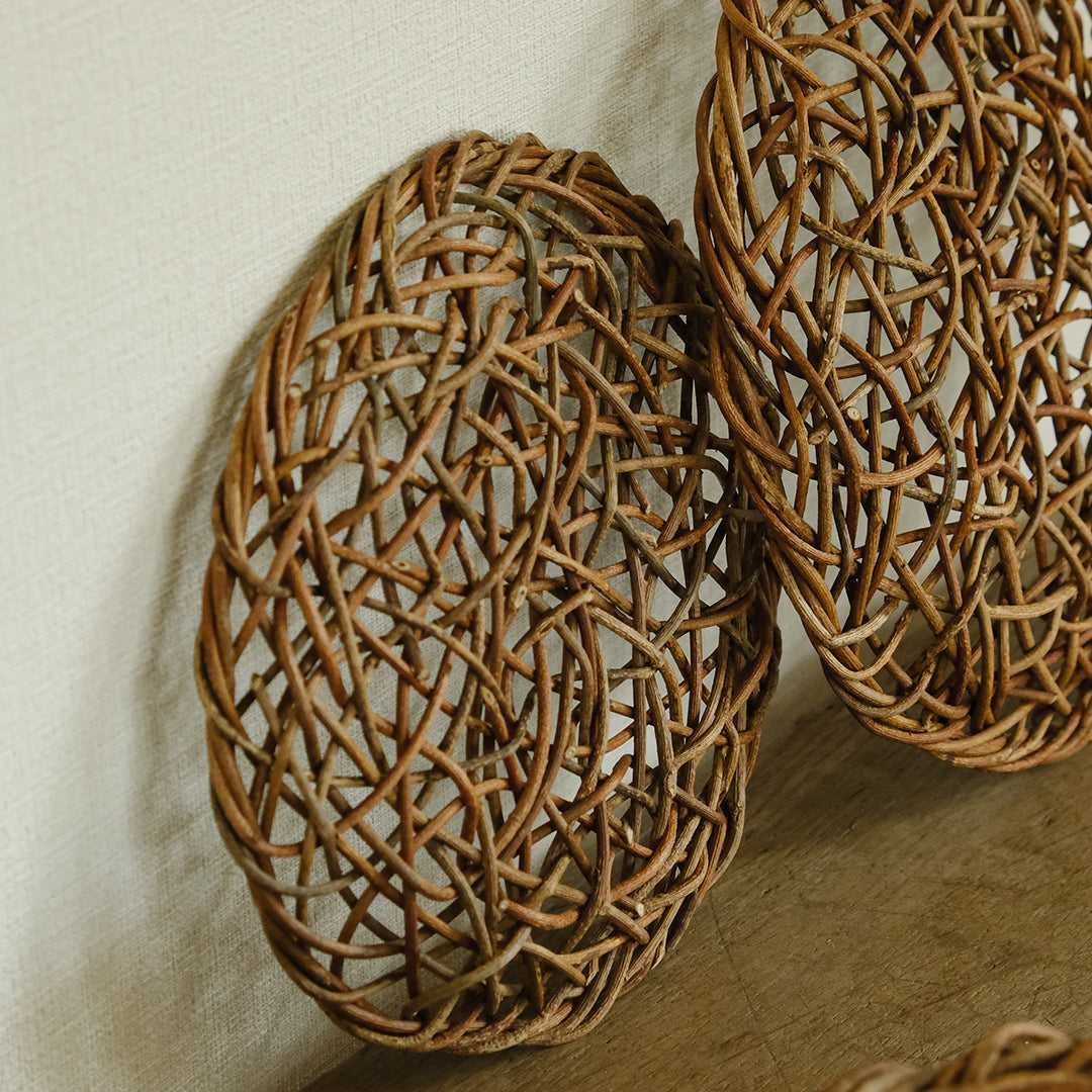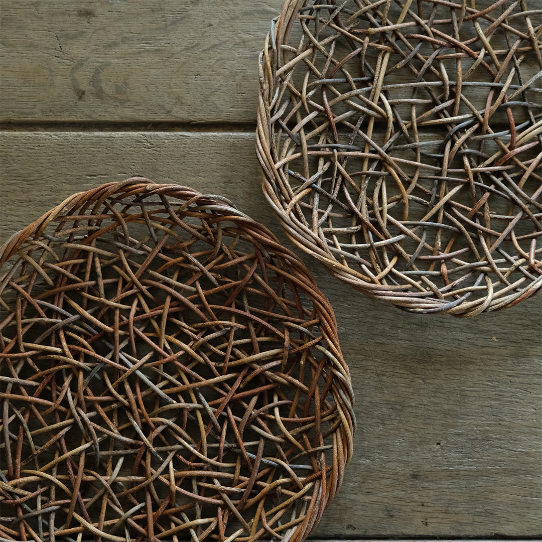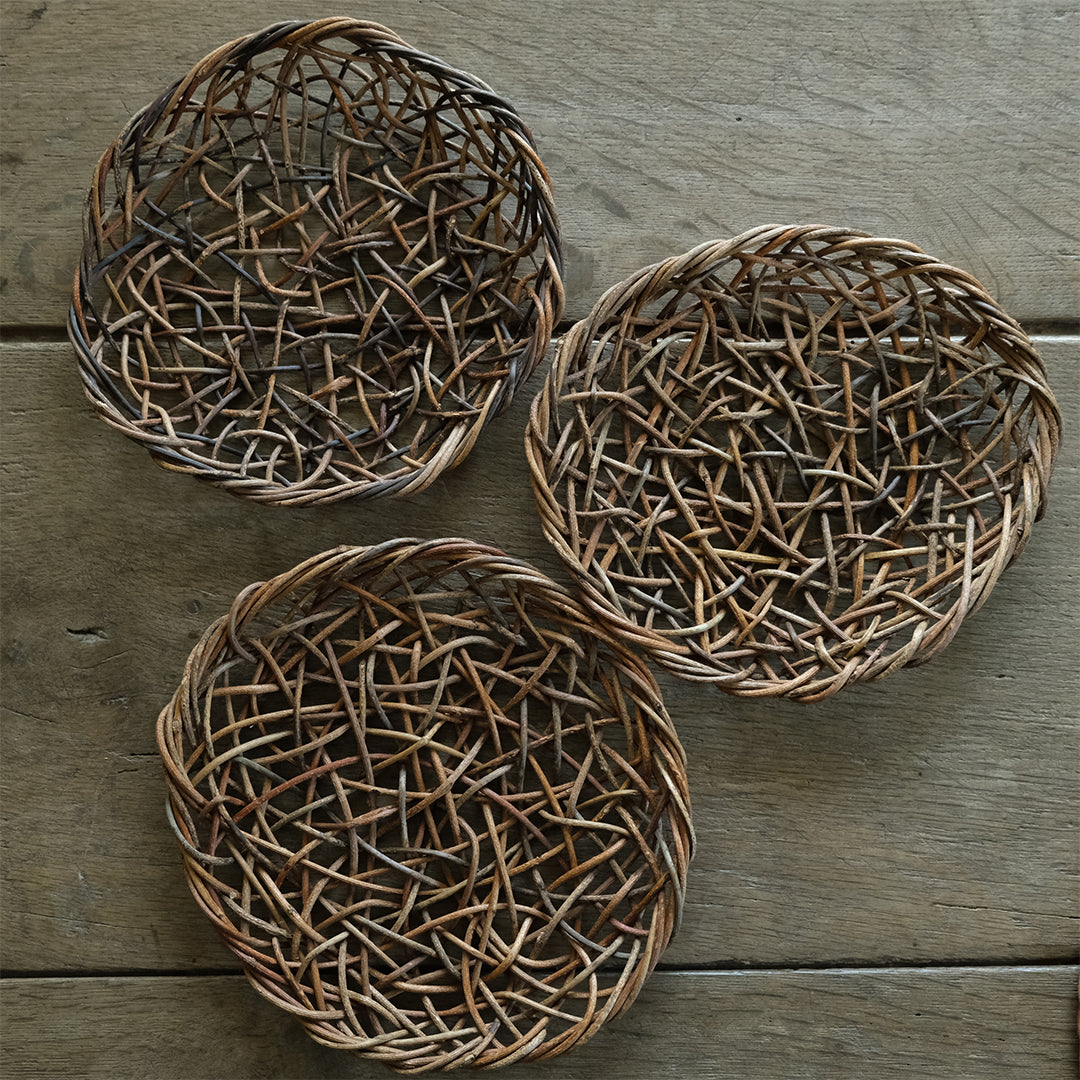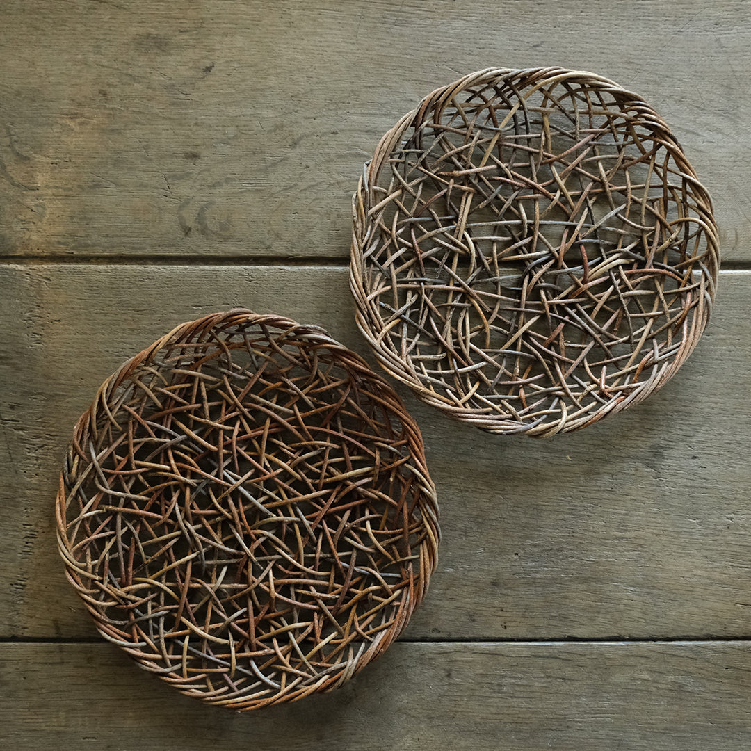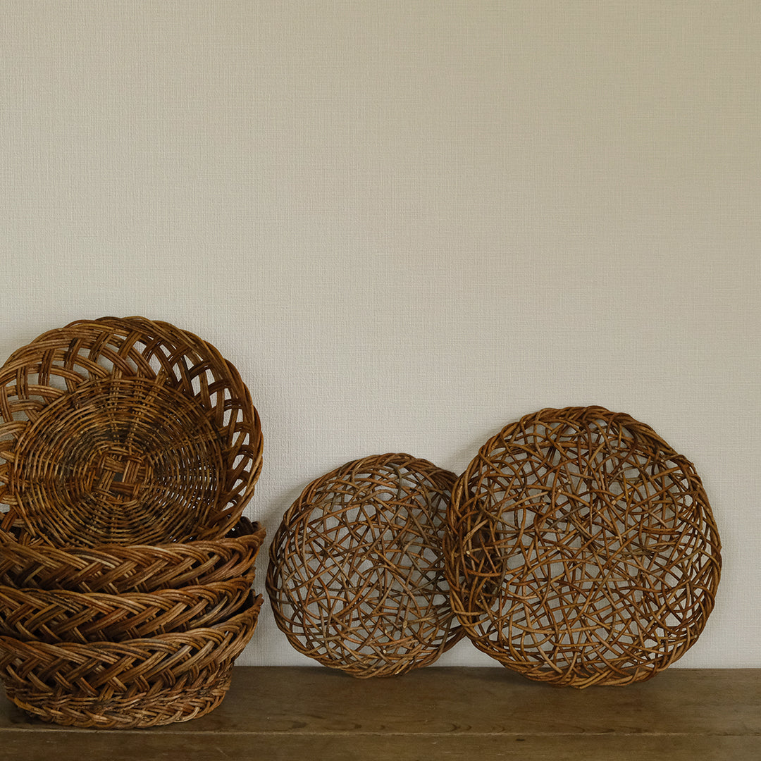 あけびの一本蔓をつかい、伝統的な「乱れ編み」でつくった素朴な編み皿。一見無造作に編まれた丸皿は、自然の無骨さの中にしなやかな美しさが感じられます。