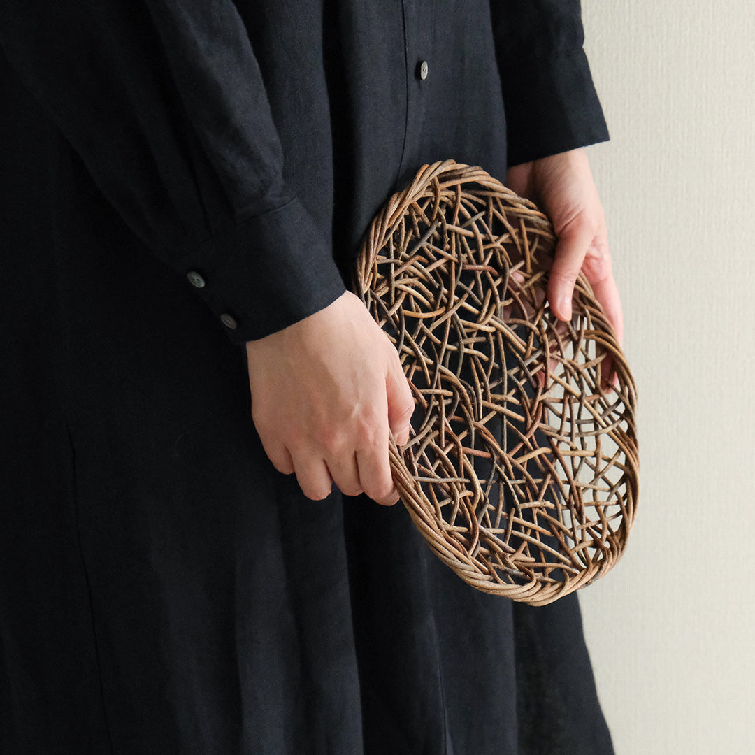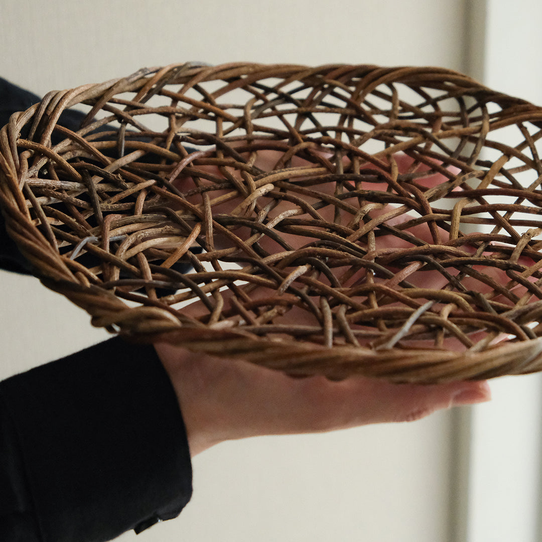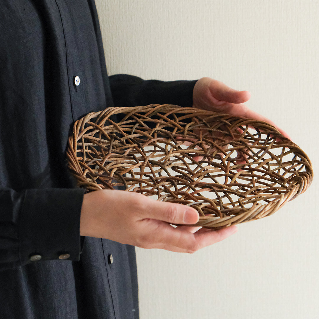 そのままでも特別な存在感のある「乱れ編み」。暮らしの中で使いやすい、かごとお皿の間のような編み皿に仕上げました。