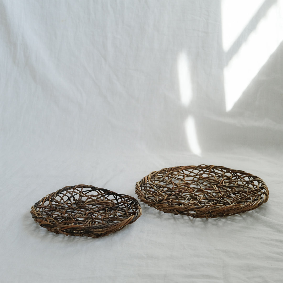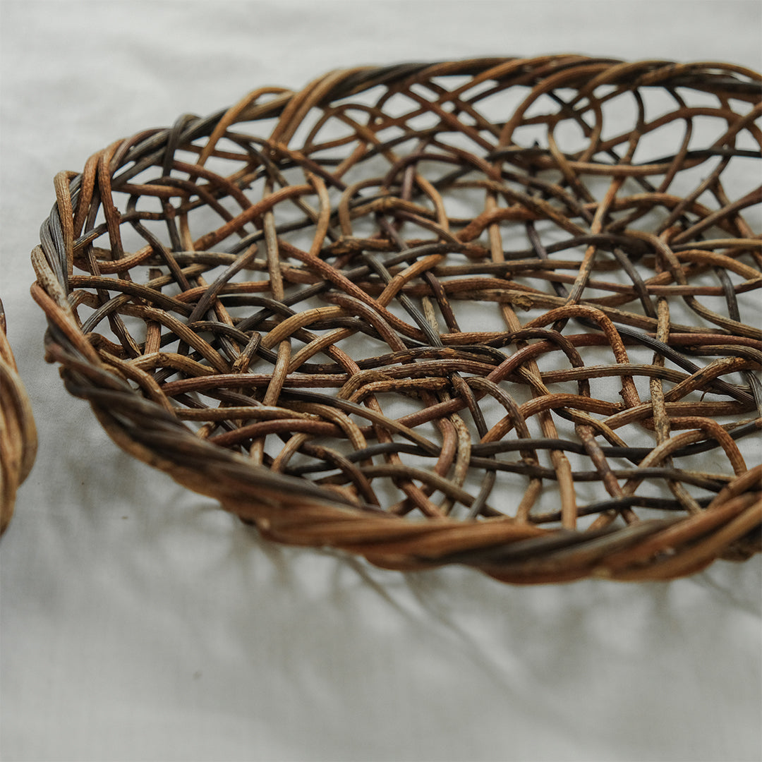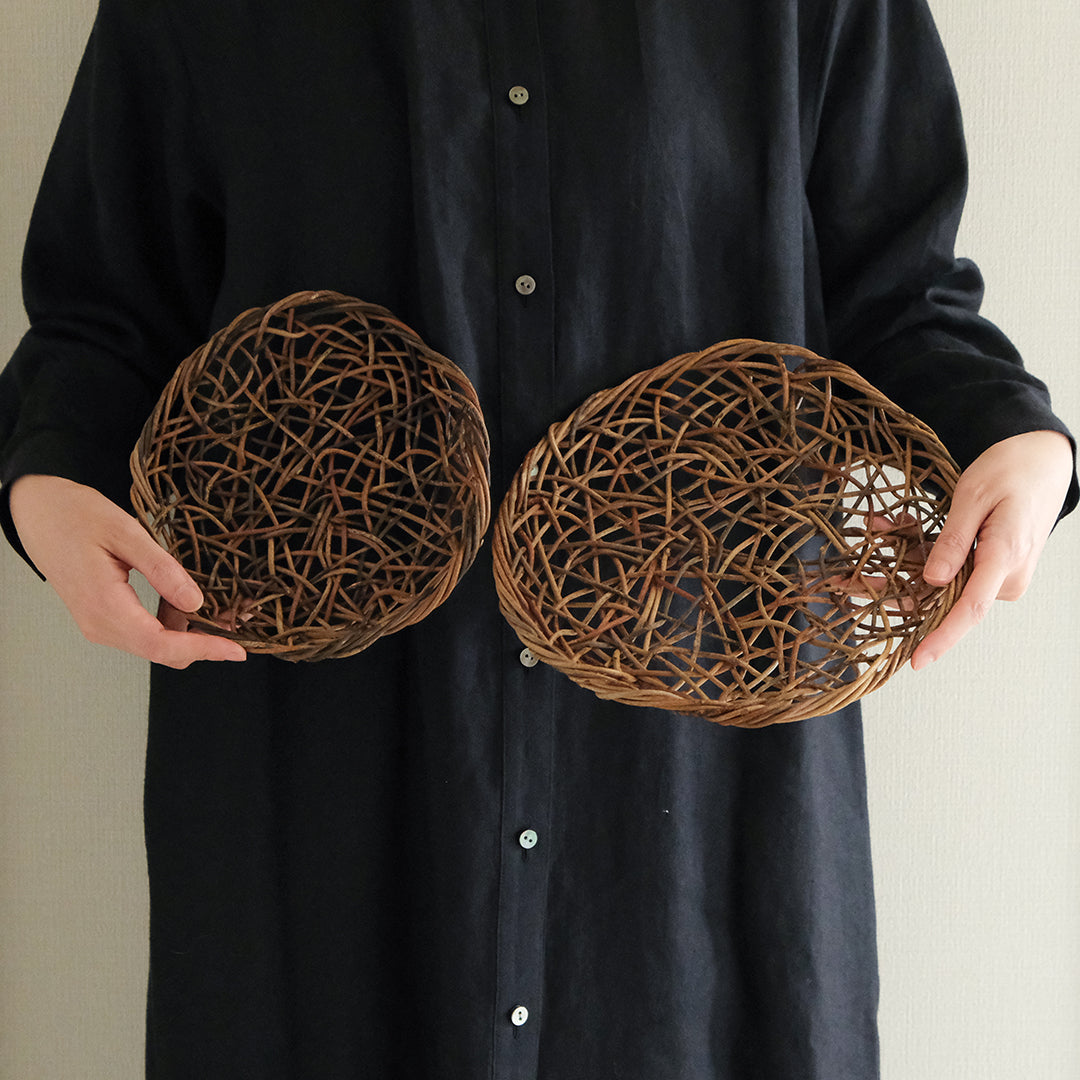 そのままでも特別な存在感のある「乱れ編み」。暮らしの中で使いやすい、かごとお皿の間のような編み皿に仕上げました。