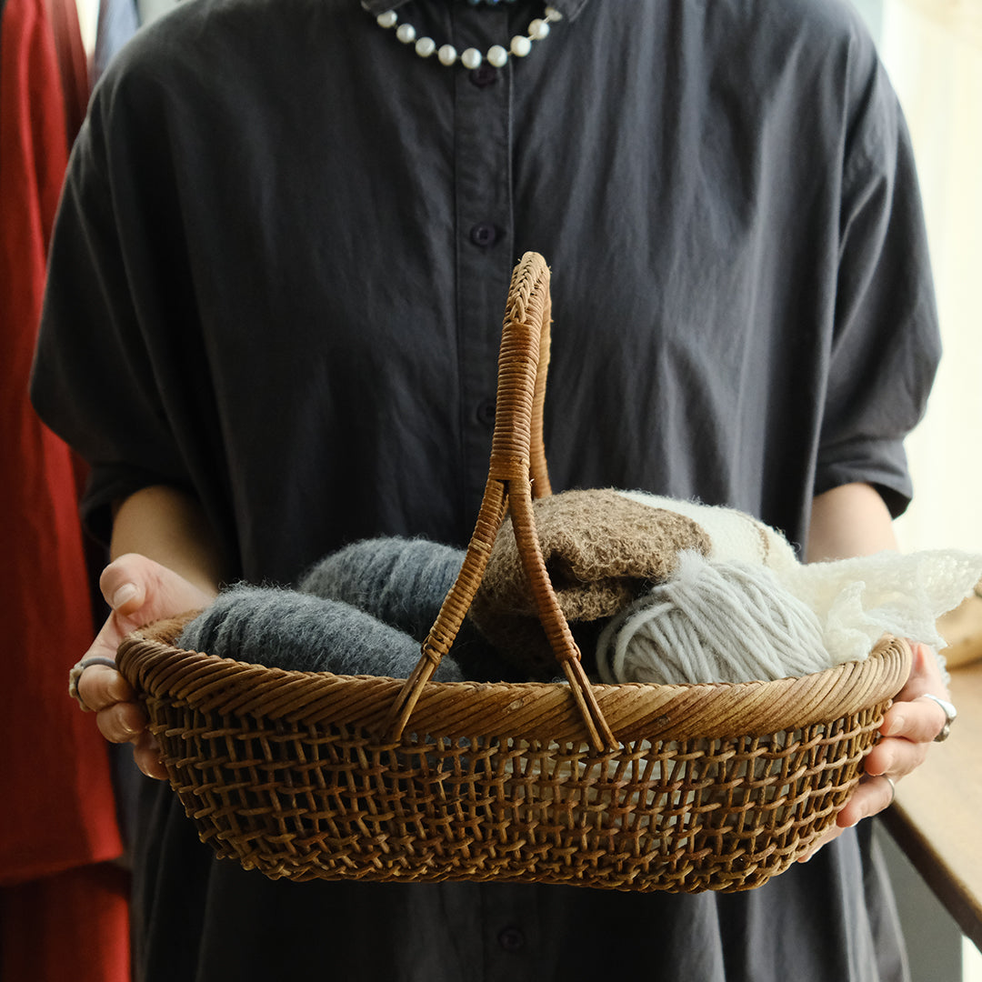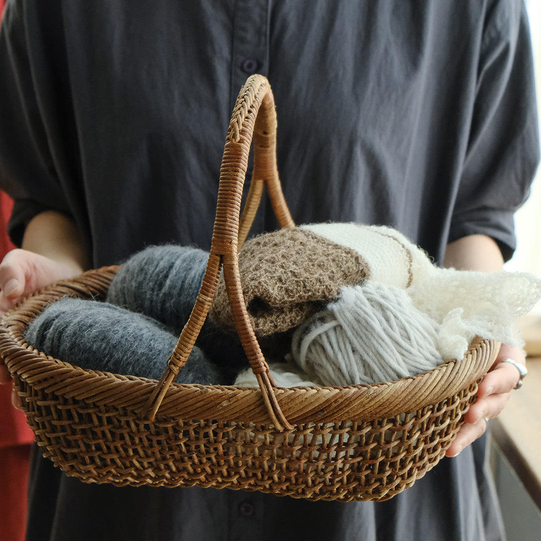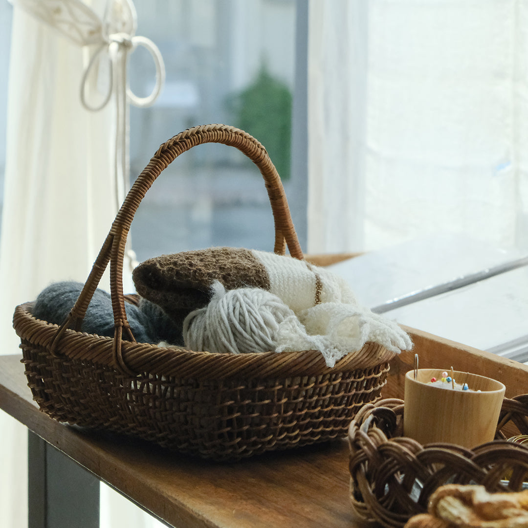 持ち手があることで、家中どこへでも連れていきやすいかご。深さもあるので果物やお菓子、湯飲みなどお茶のセットを入れてテーブルに、ソファへと、どこへでも。 ▲編み物の道具を入れてお、気に入りのスペースに