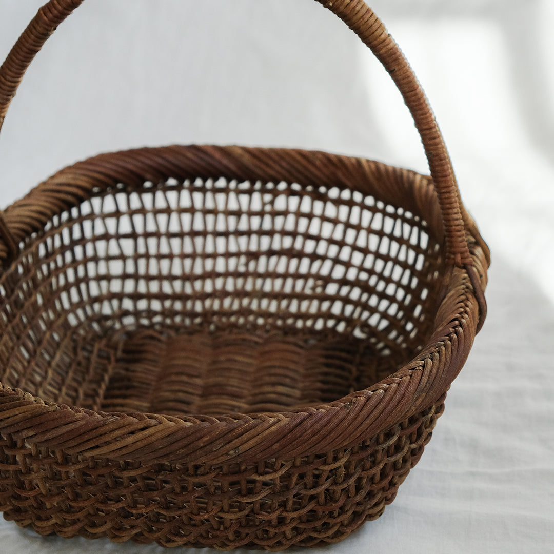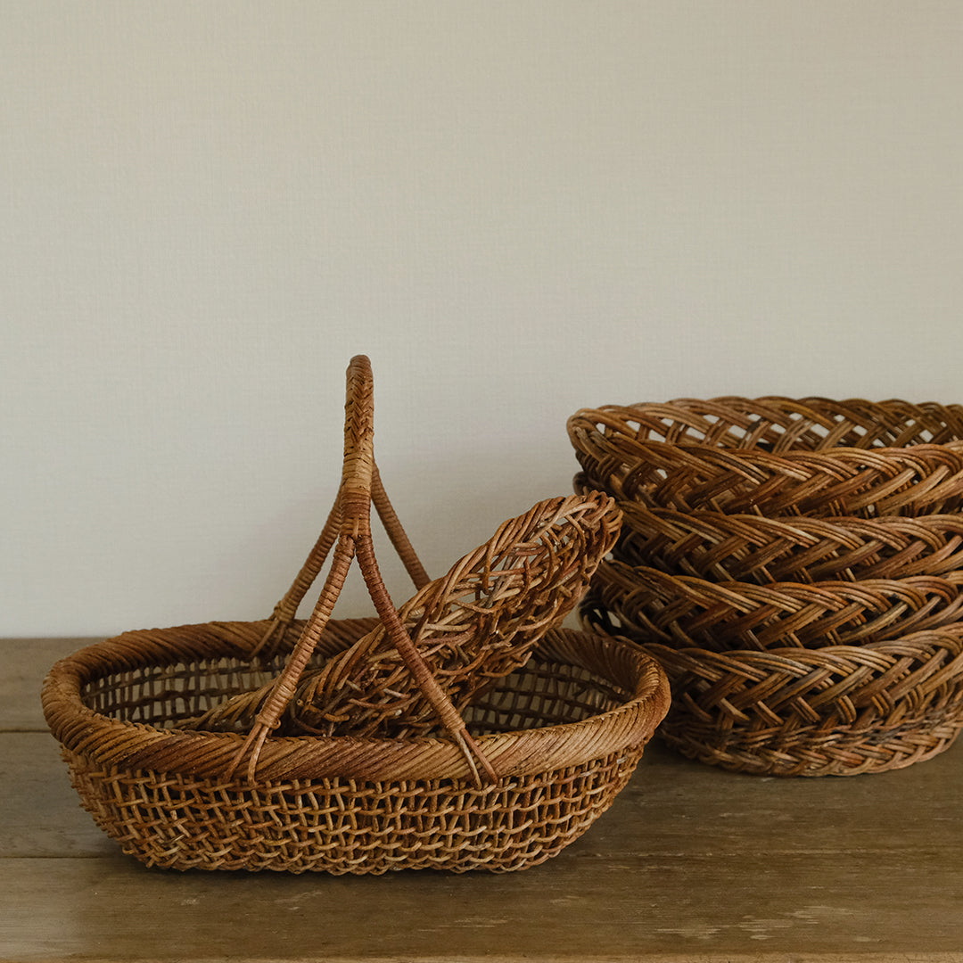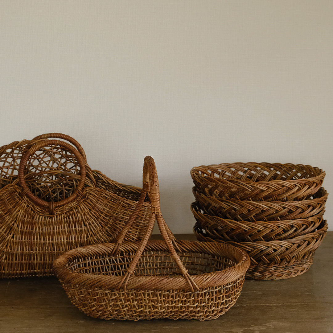 クラシックなこだし編みに、華奢なからみ手が映える、まるでヨーロッパのアンティークのような佇まいのバスケット。食卓ではパンや果物を入れて、読みかけの本や編み物の道具を入れたら家中どこへでも。