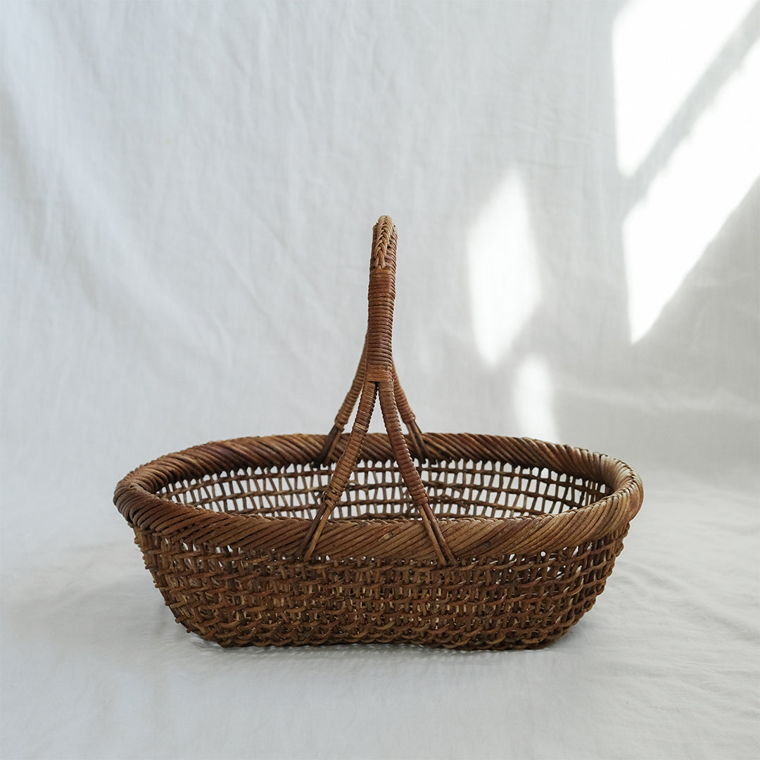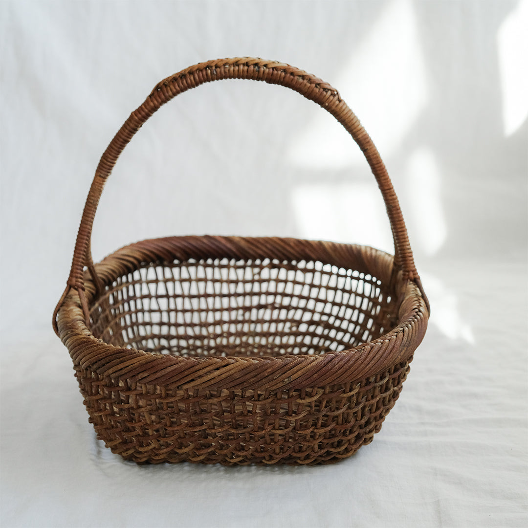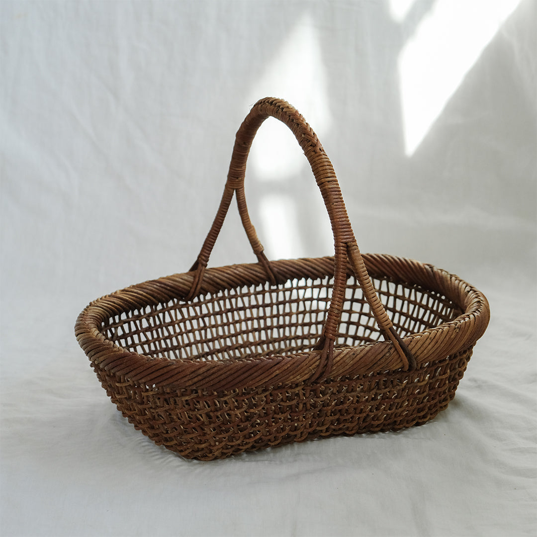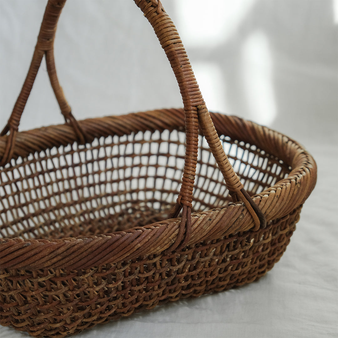 クラシックなこだし編みに、華奢なからみ手が映える、まるでヨーロッパのアンティークのような佇まいのバスケット。食卓ではパンや果物を入れて、読みかけの本や編み物の道具を入れたら家中どこへでも。