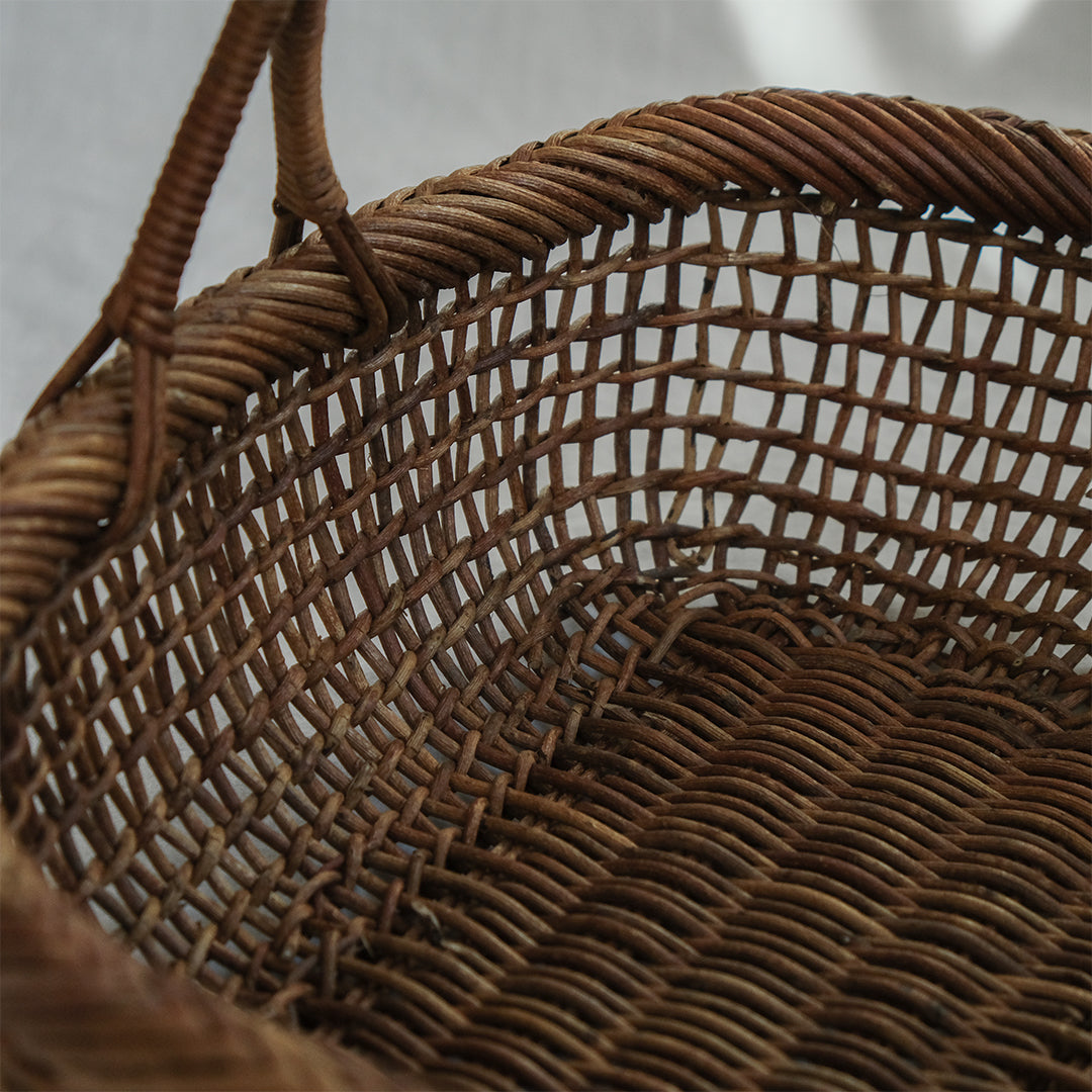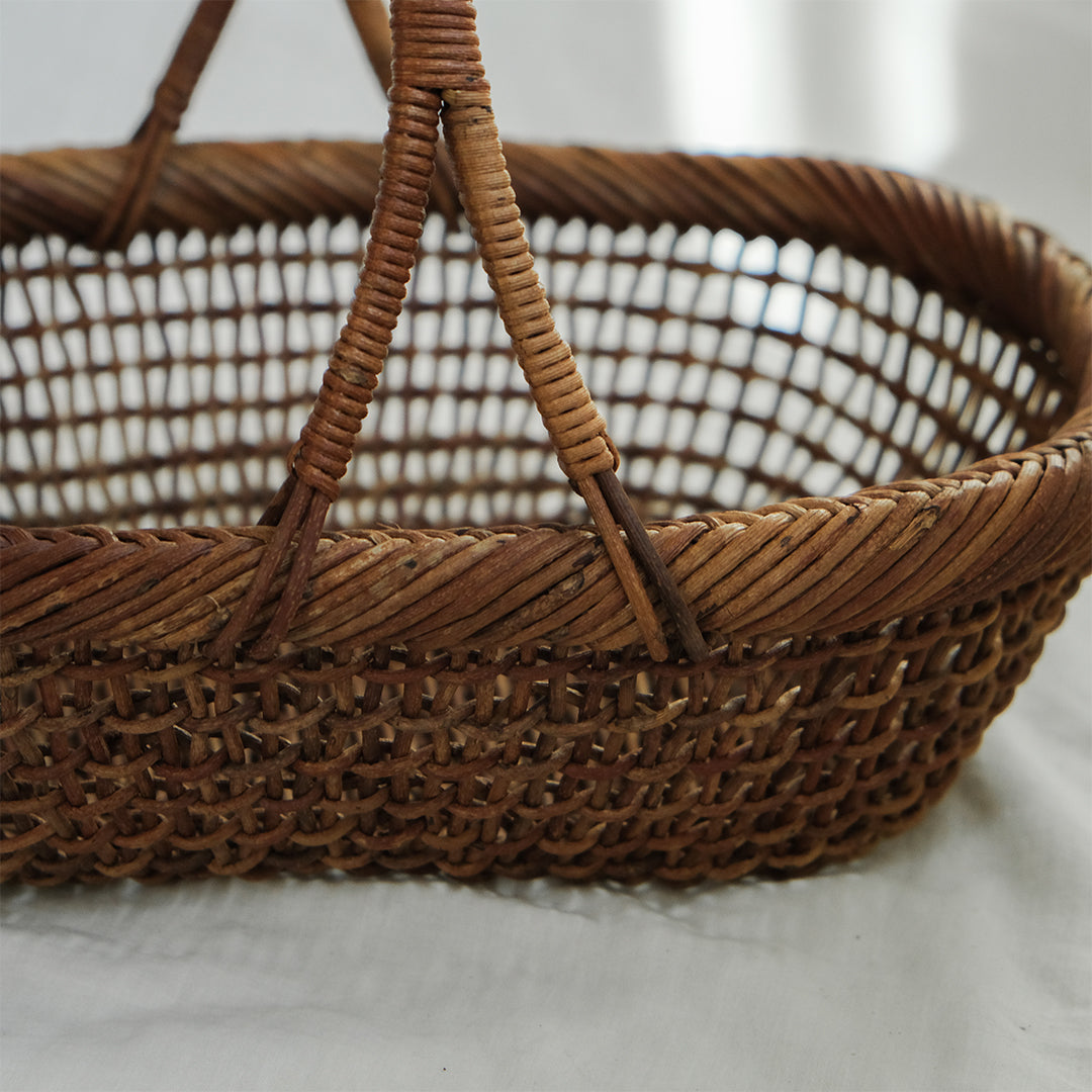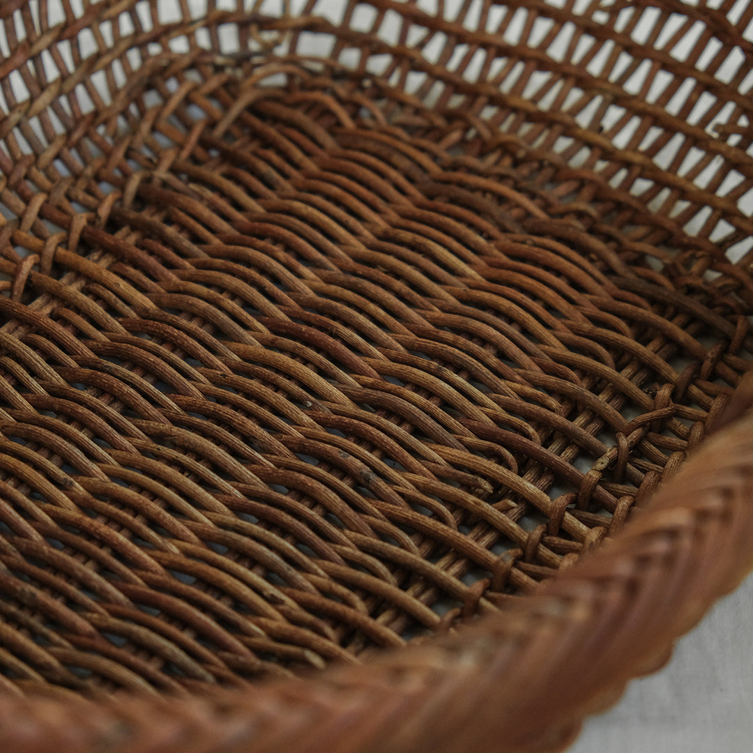 細めこだし編みには、木型を使用せずフリーハンド編み上げる為、熟練の技術が必要なんだそう。 同じように細めこだし編み、絡み手で仕上げたかごには「細目こだし編 丸型一本手」があります。