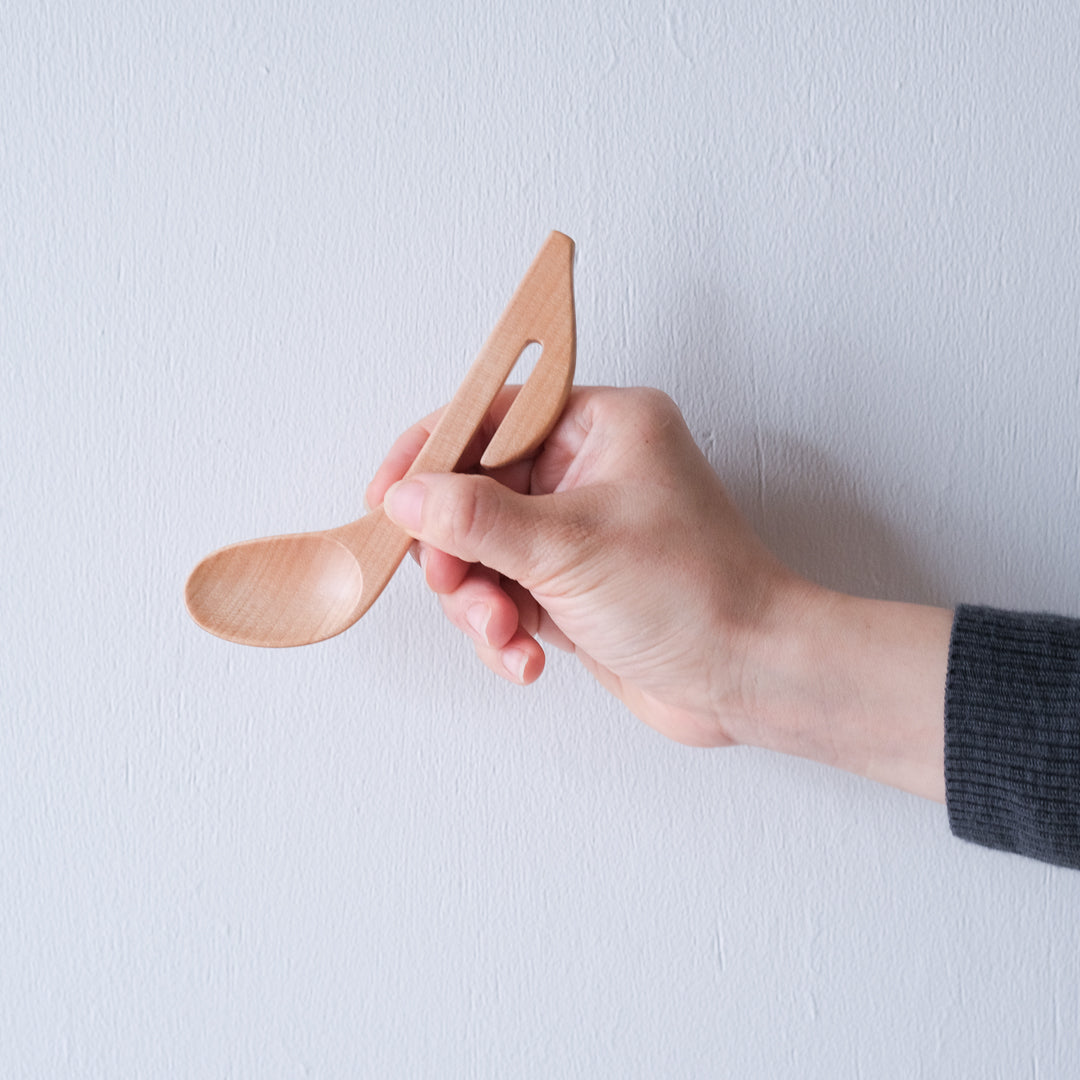 握りやすく自然素材のあたたかみが感じられ、ヘッドのつぼ部も平たく横に広がり、食べやすいかたちになっています。