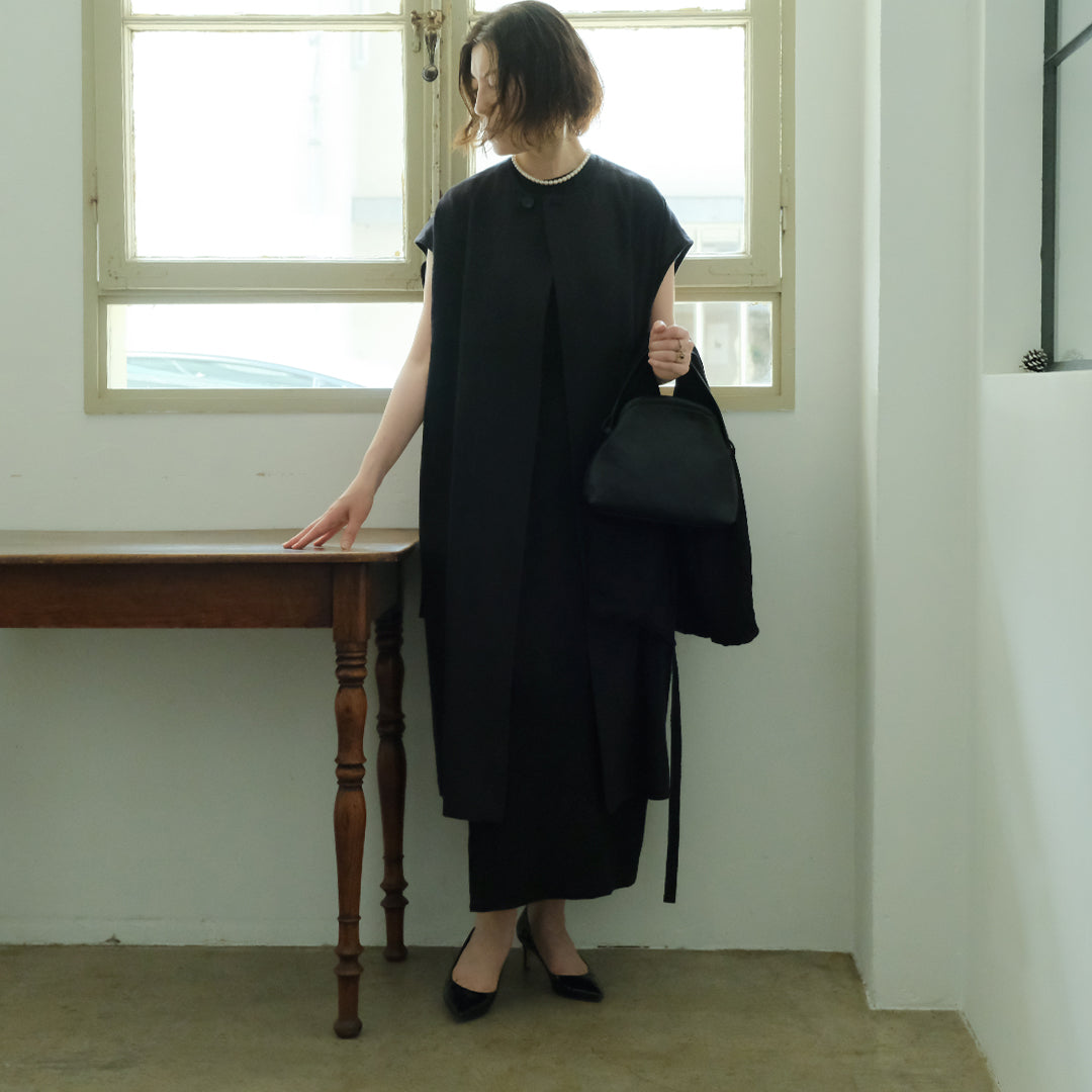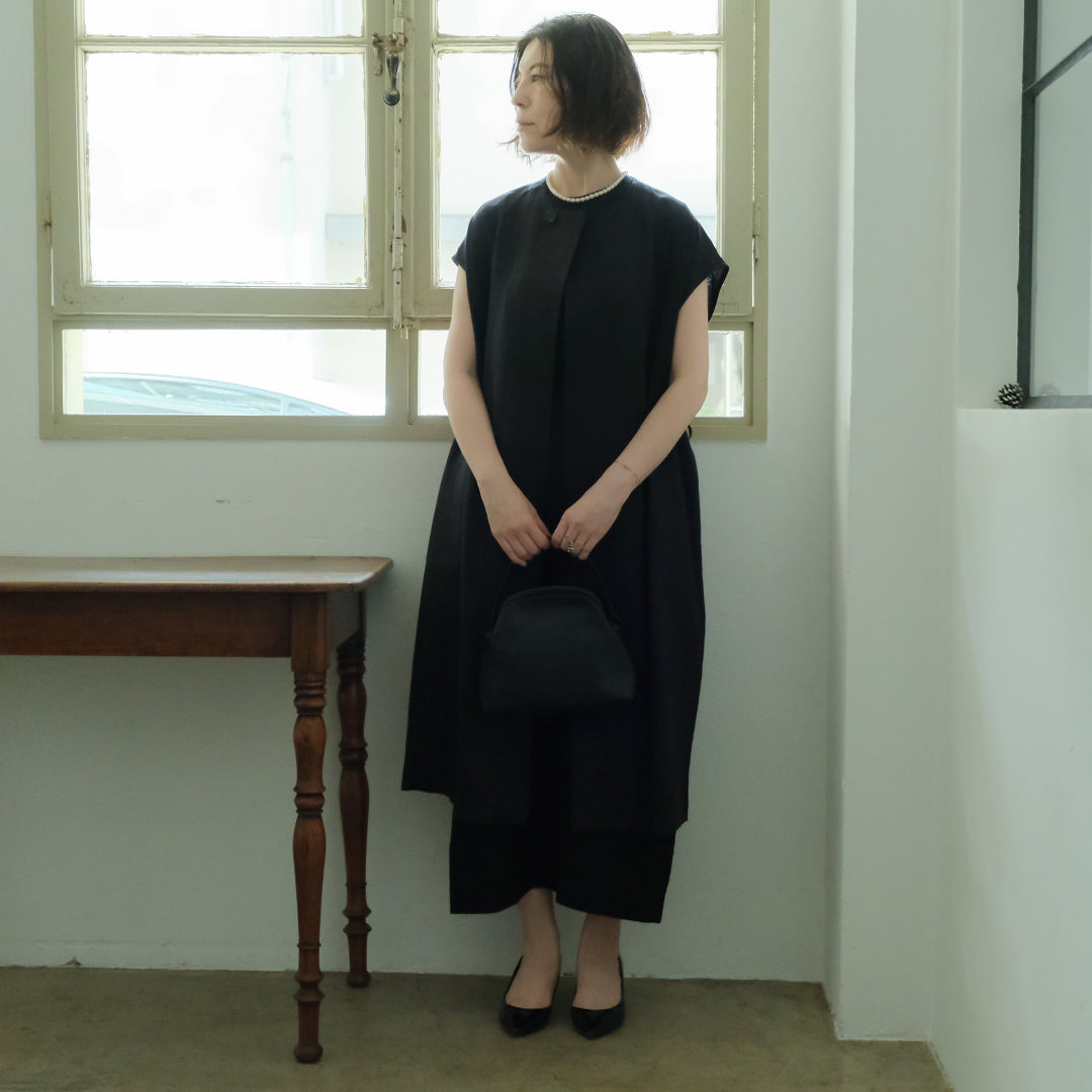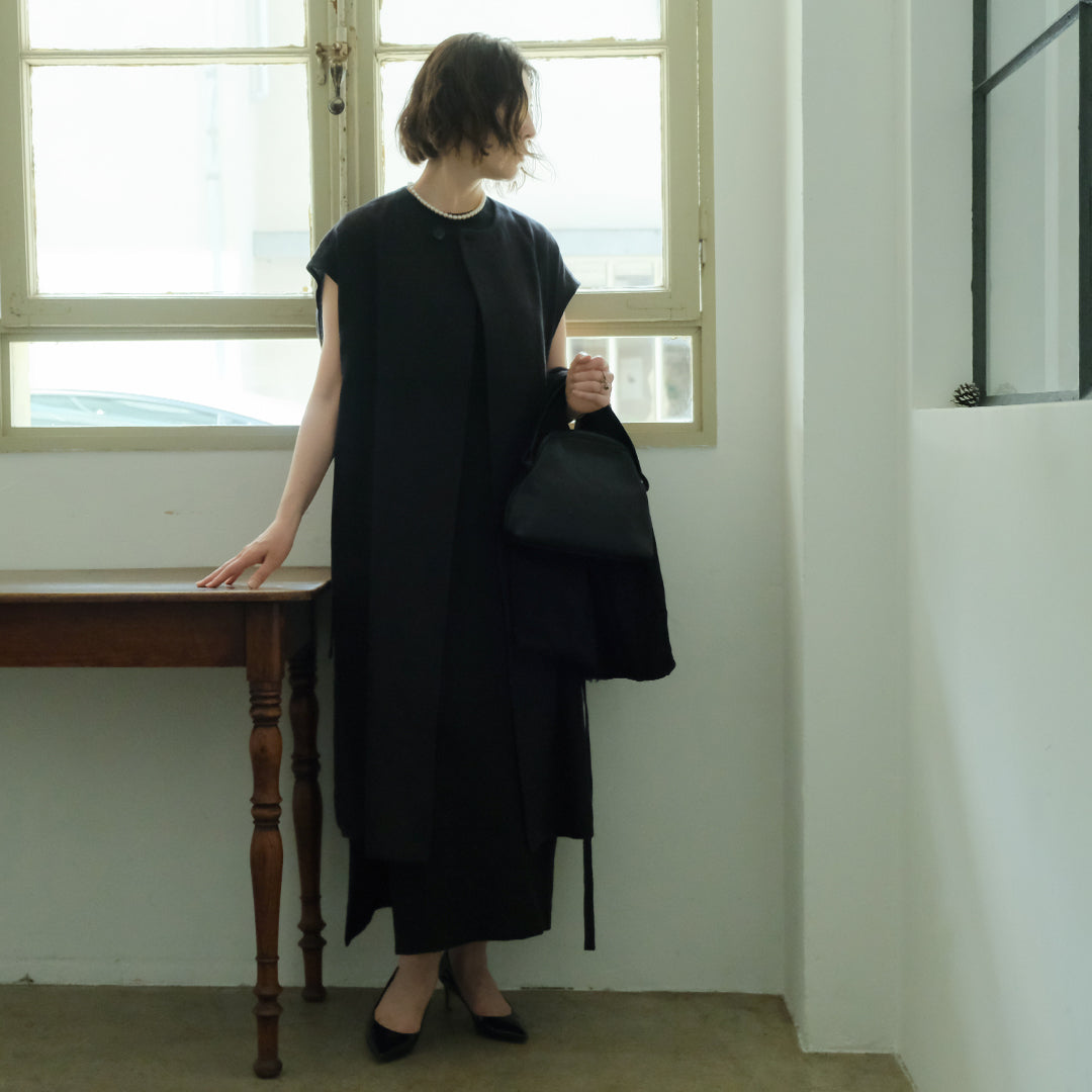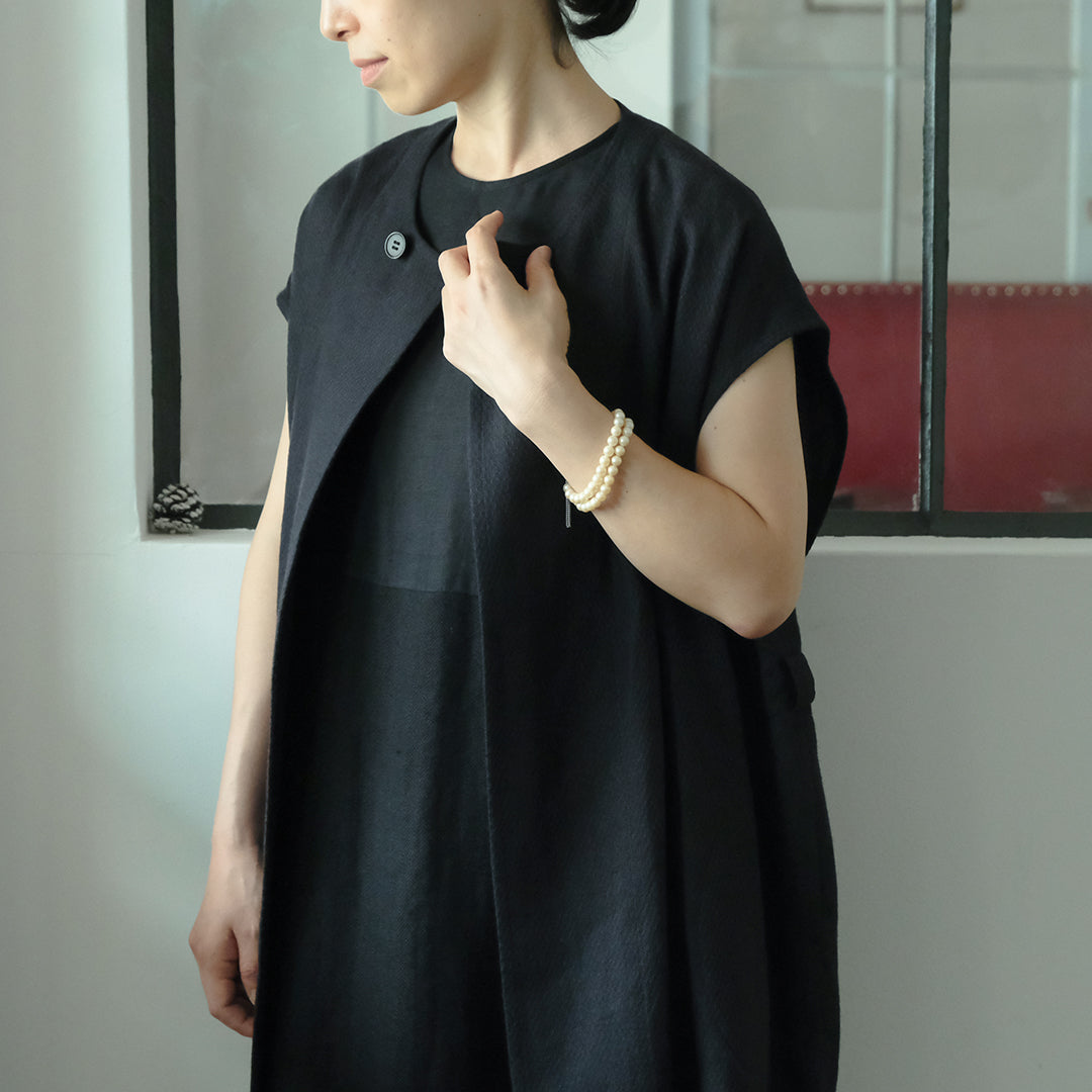 ウールと聞くと冬用かと思われがちですが、通気性と保湿性を兼ね備えたシャリ感のある生地は、冬場はあたたかく夏場は涼しくとても快適。▲丸く合わせやすい首元に、上品な水牛ボタンデザイナー自身、12月の結婚式にシンプルドレスとロングジレを合わせて参加。屋内のお式だったので問題なく過ごせたそうです。シンプルドレスサイズ1にロングジレを合わせて、バッグ:TACHINO CHIE、モデル身長159cm