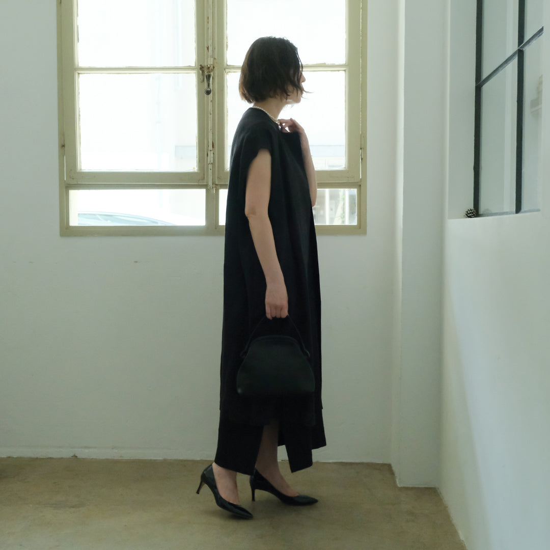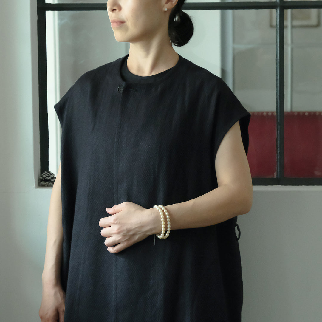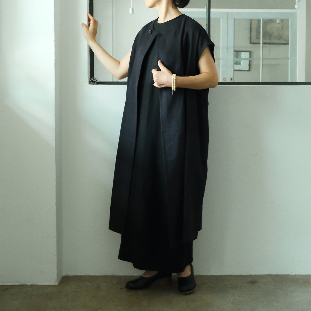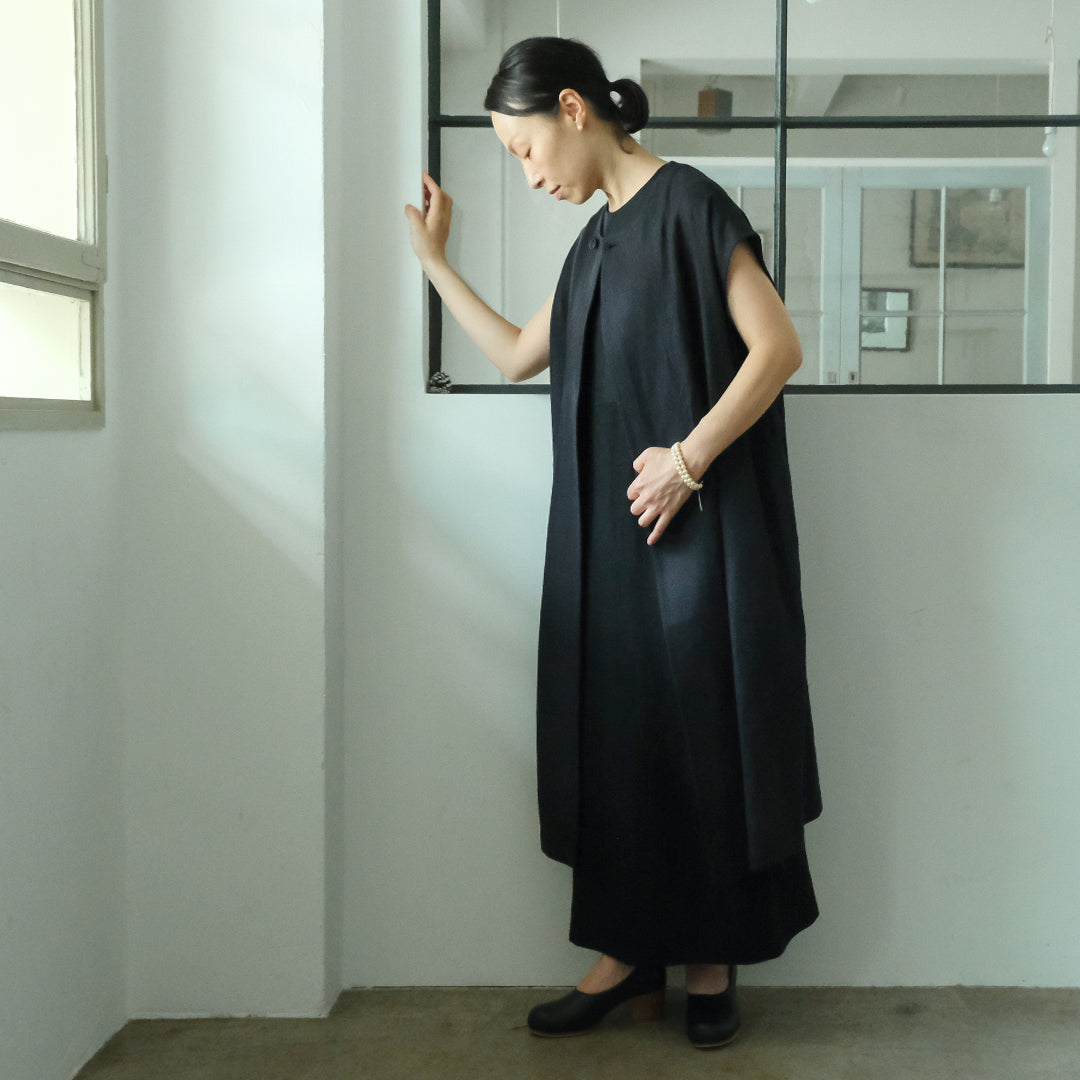 ウールと聞くと冬用かと思われがちですが、通気性と保湿性を兼ね備えたシャリ感のある生地は、冬場はあたたかく夏場は涼しくとても快適。▲丸く合わせやすい首元に、上品な水牛ボタンデザイナー自身、12月の結婚式にシンプルドレスとロングジレを合わせて参加。屋内のお式だったので問題なく過ごせたそうです。シンプルドレスサイズ1にロングジレを合わせて、バッグ:TACHINO CHIE、モデル身長159cm