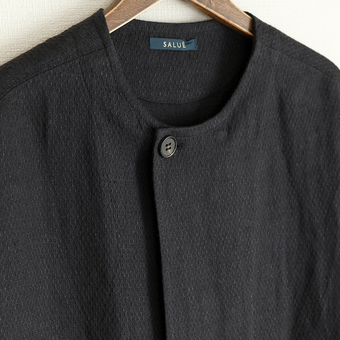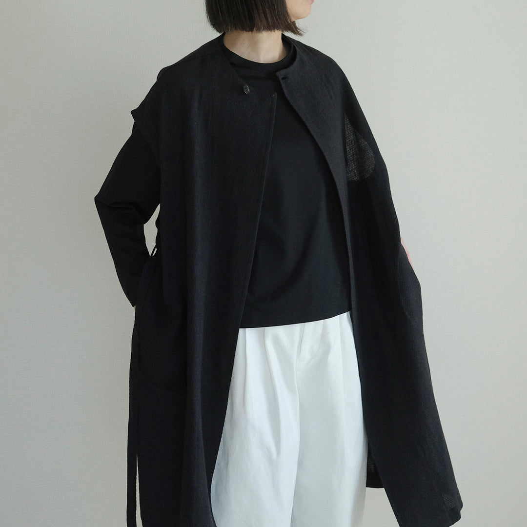 フレンチスリーブならではの安心感とかわいらしさをプラスしました。ウールリネン生地が生み出す洗練されたシルエットが、特別なシーンの着こなしをより上質なものに。マキシ丈のワンピースにも合わせやすいロング丈。生地の美しさが際立つシンプルなデザインは、レイヤードしやすいようにほどよくコクーンシルエットに仕上げました。黒を合わせた着こなしにも奥行感を感じさせるジャカード生地。付属のベルトがあるので、その日の着こなしに合わせたシルエットに。