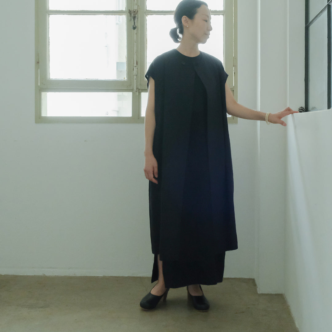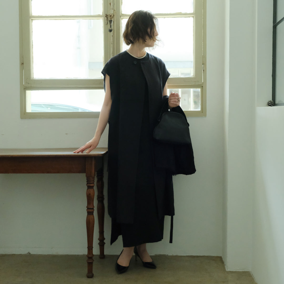 ワンピースの上にさっと羽織れるジレ。少しウールが混ざったジャカード生地でつくったロングジレは、薄手のコートのように気軽に使える一枚です。シンプルドレスサイズ2に合わせて、ネックレス:[shuo']Black Pearl Rutile Quartz Necklace、ピアス:[shuo']Snow drop  Pierceシンプルドレスサイズ1に合わせて、ショール:リトアニアンリネンストール/ライトウェイトリネンモデル身長155cm