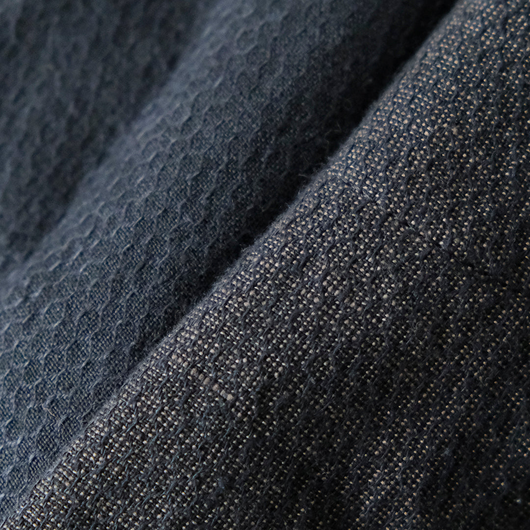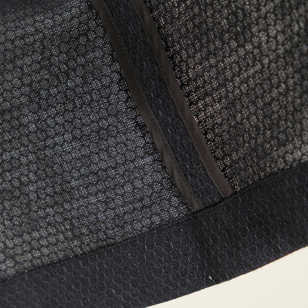 先染めされた3本の糸で編まれたジャカード生地は、2本のリネン糸と1本のウール糸を使用たハニカム模様。▲裏側はパイピングで美しく