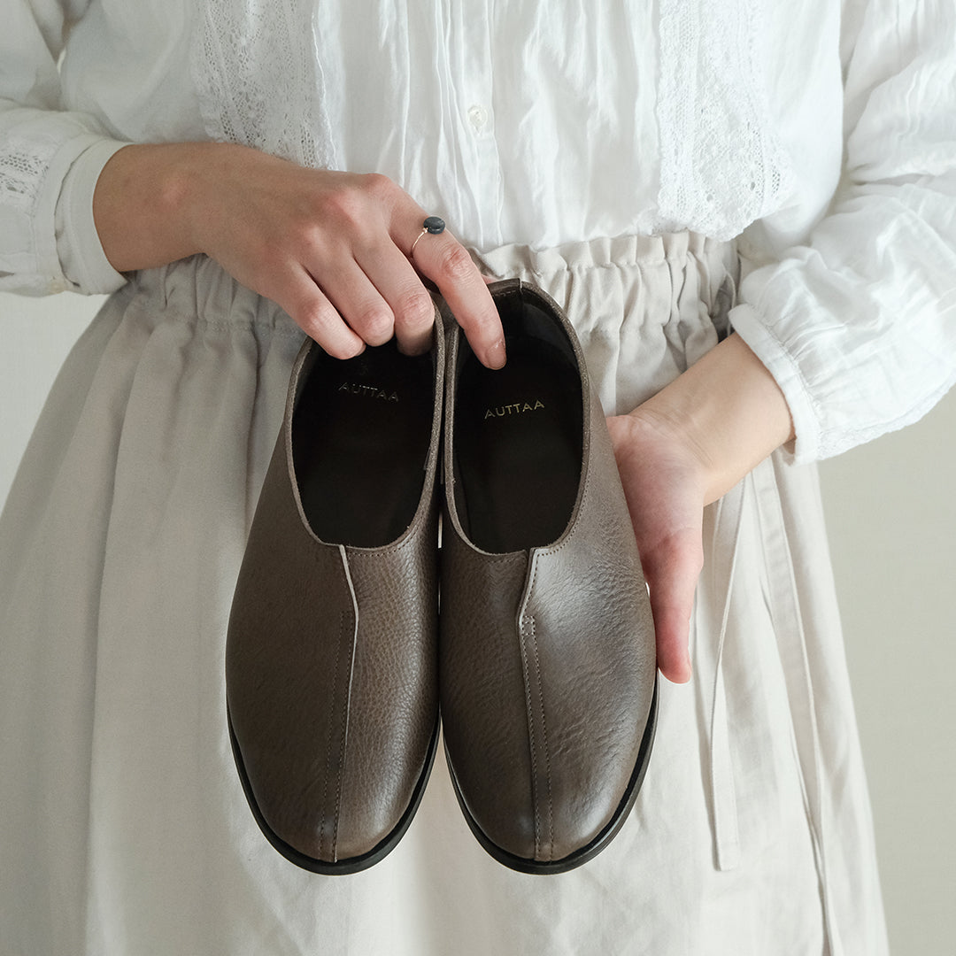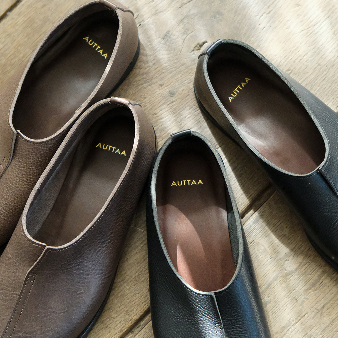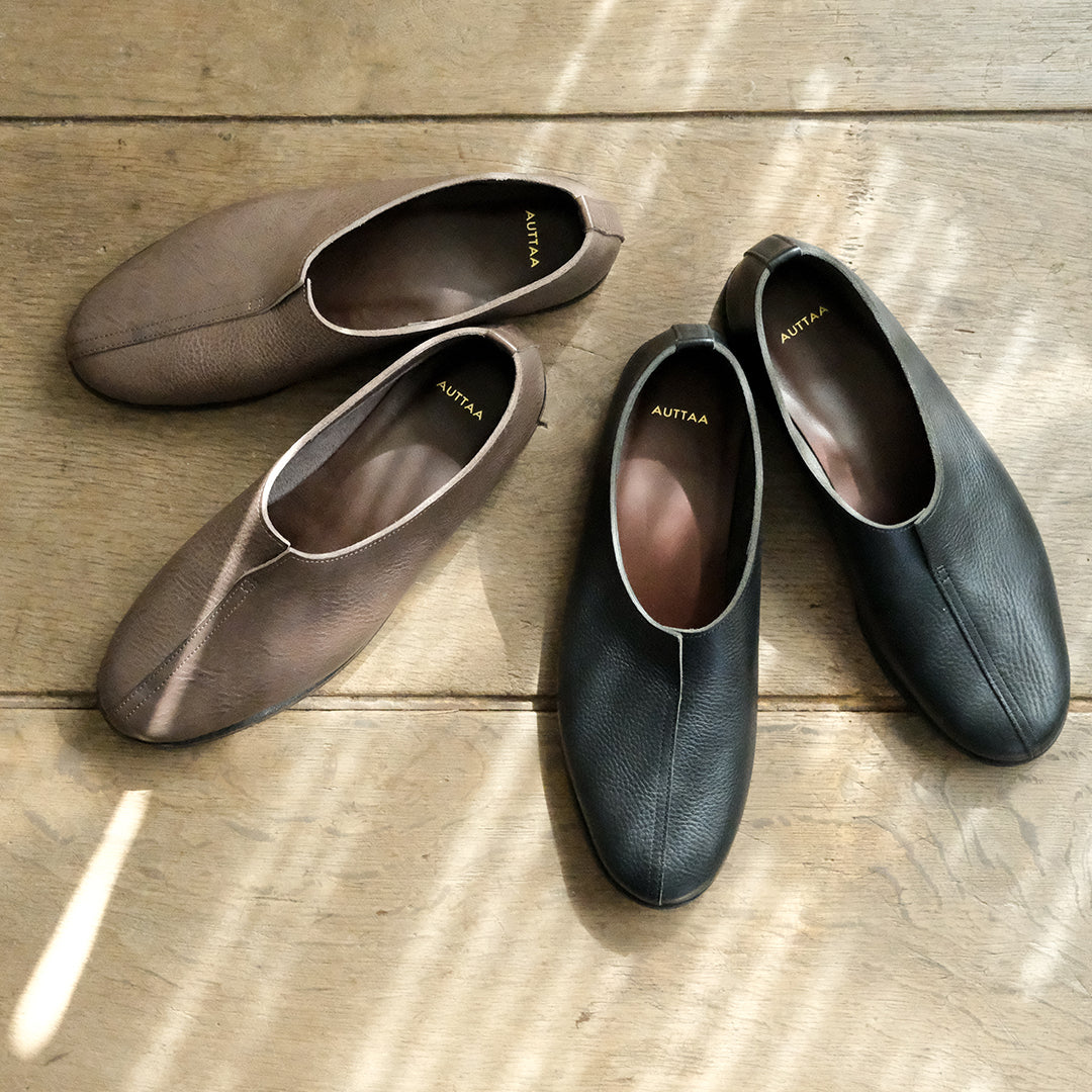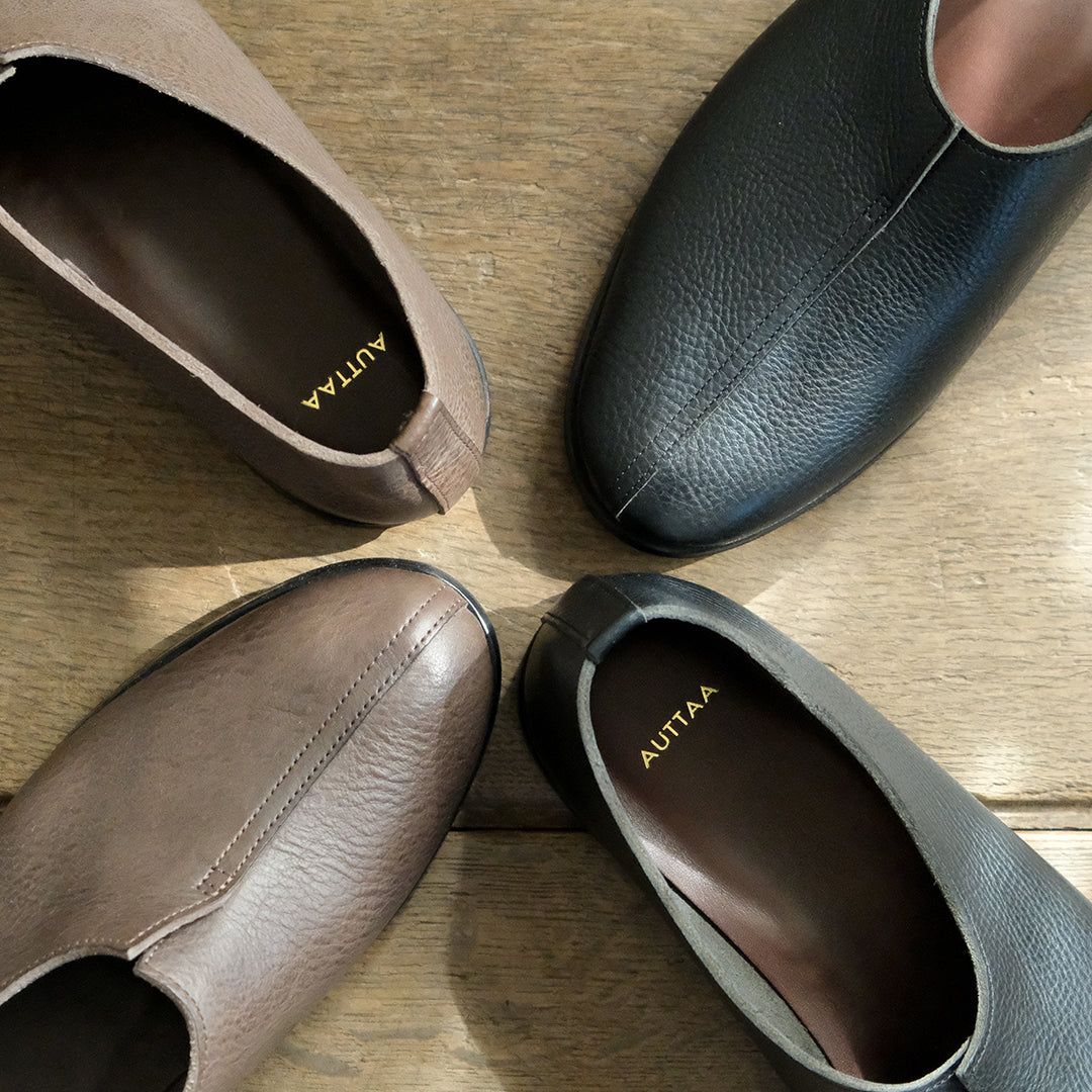 デザインはAUTTAAの定番、外でも履ける「ルームシューズ2」と通じるものがありますが、こちらは芯材を入れてよりしっかりときちんとした感じ。お出かけ向きに仕上げられています。