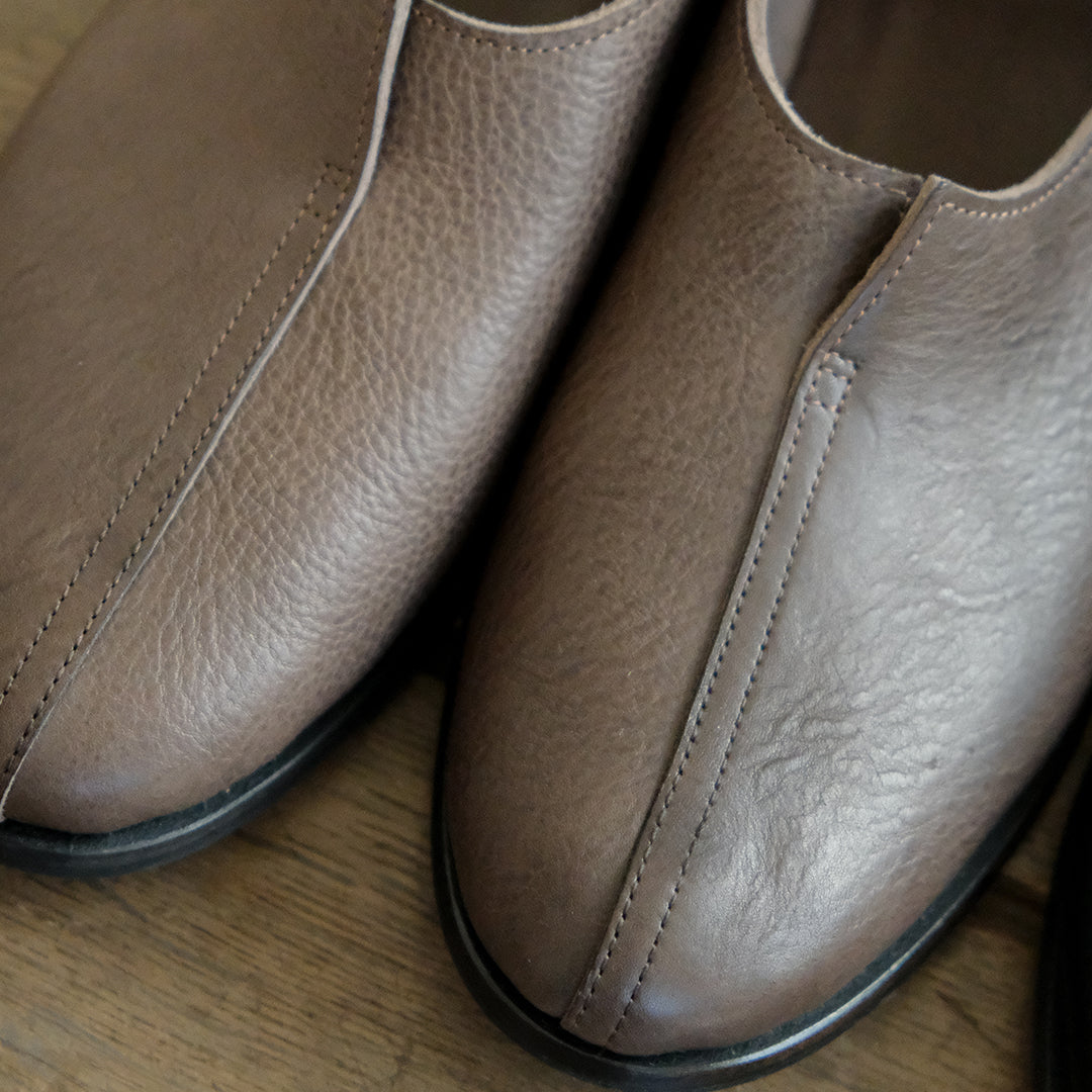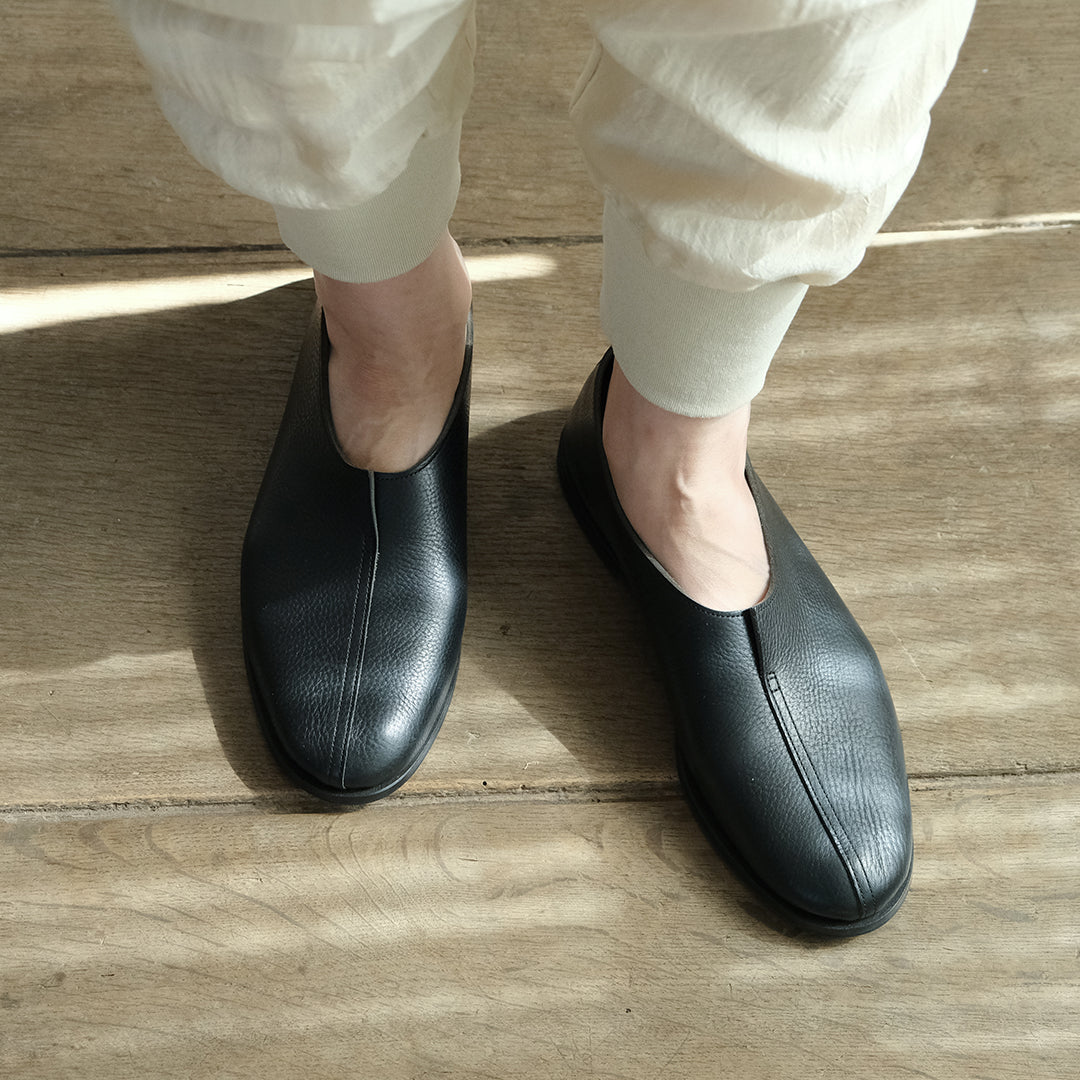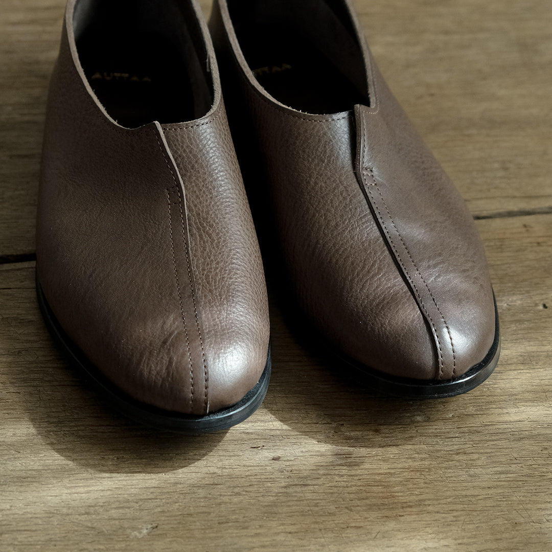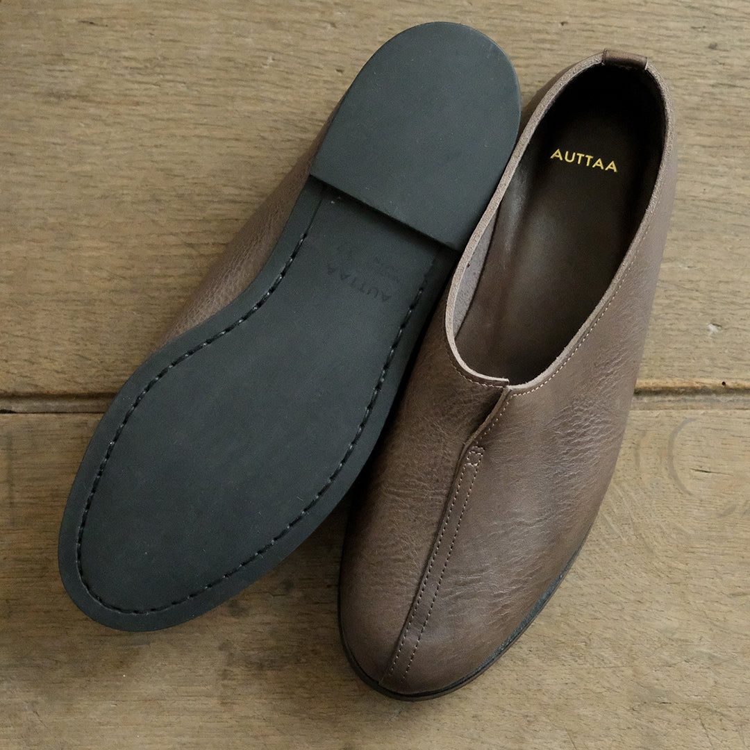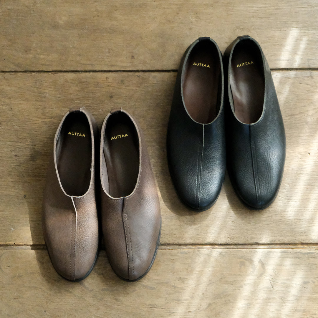 デザインはAUTTAAの定番、外でも履ける「ルームシューズ2」と通じるものがありますが、こちらは芯材を入れてよりしっかりときちんとした感じ。お出かけ向きに仕上げられています。