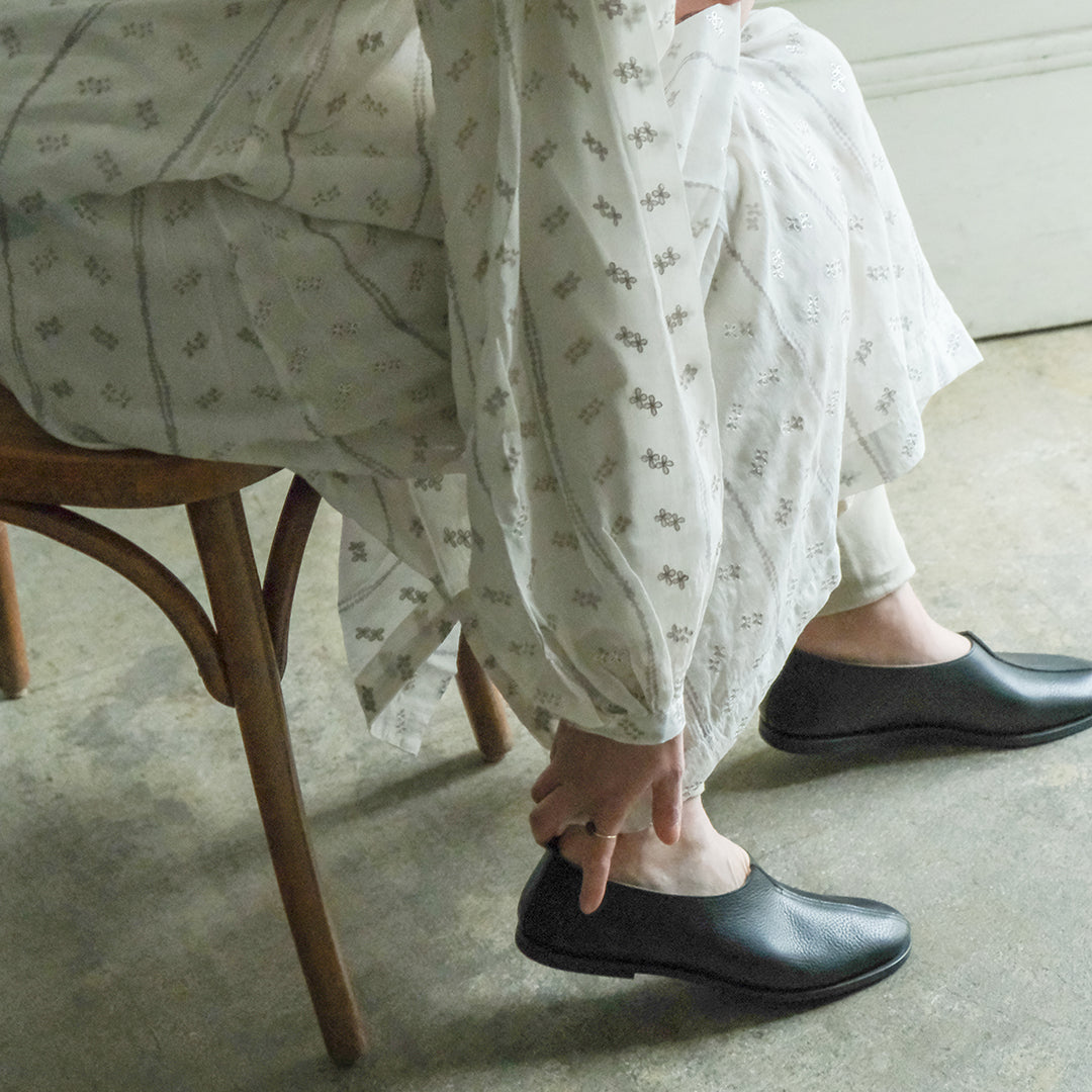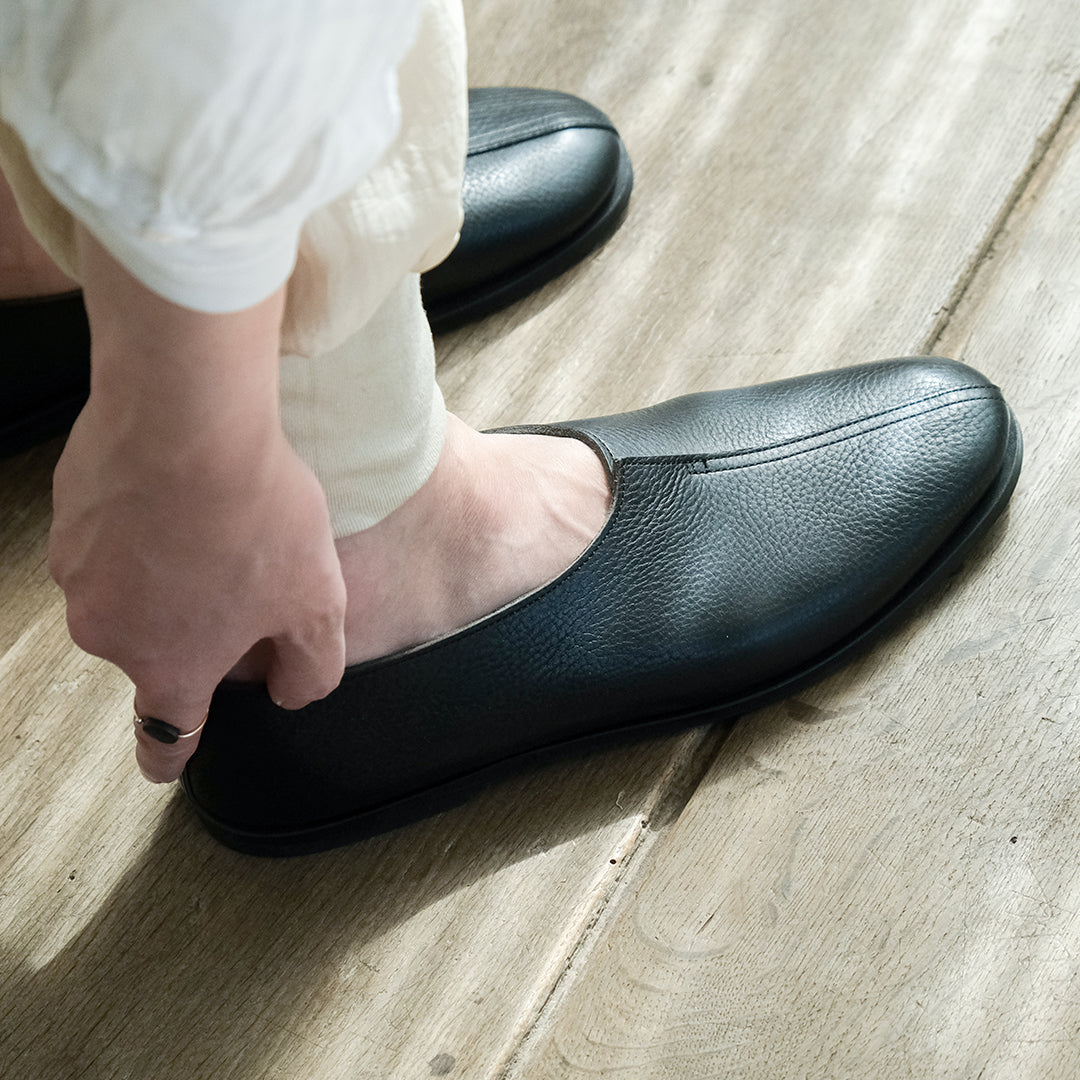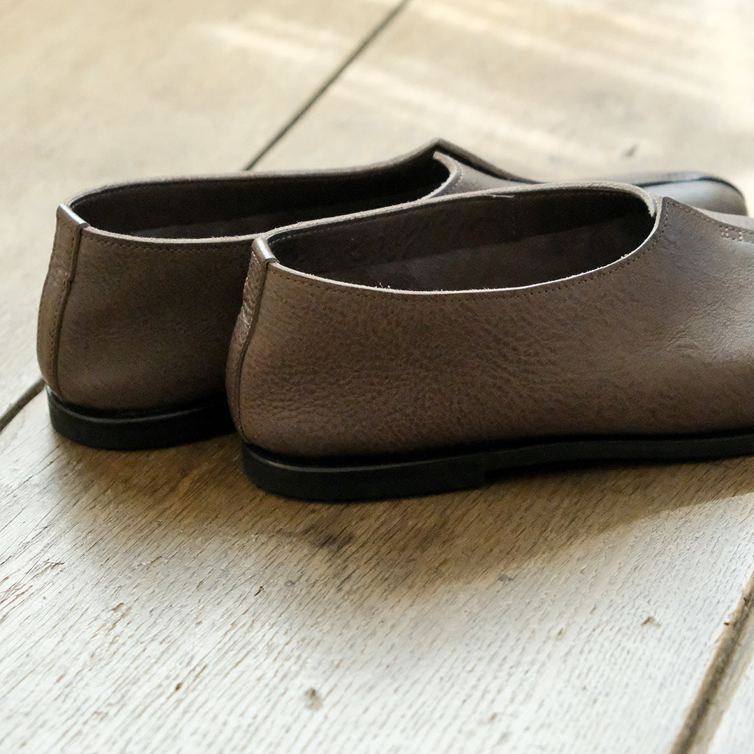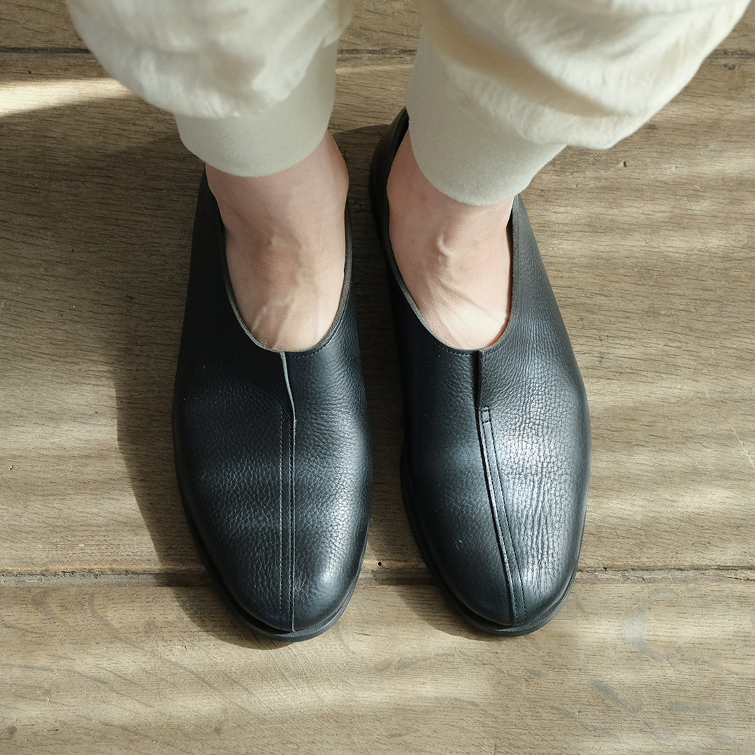 デザインはAUTTAAの定番、外でも履ける「ルームシューズ2」と通じるものがありますが、こちらは芯材を入れてよりしっかりときちんとした感じ。お出かけ向きに仕上げられています。