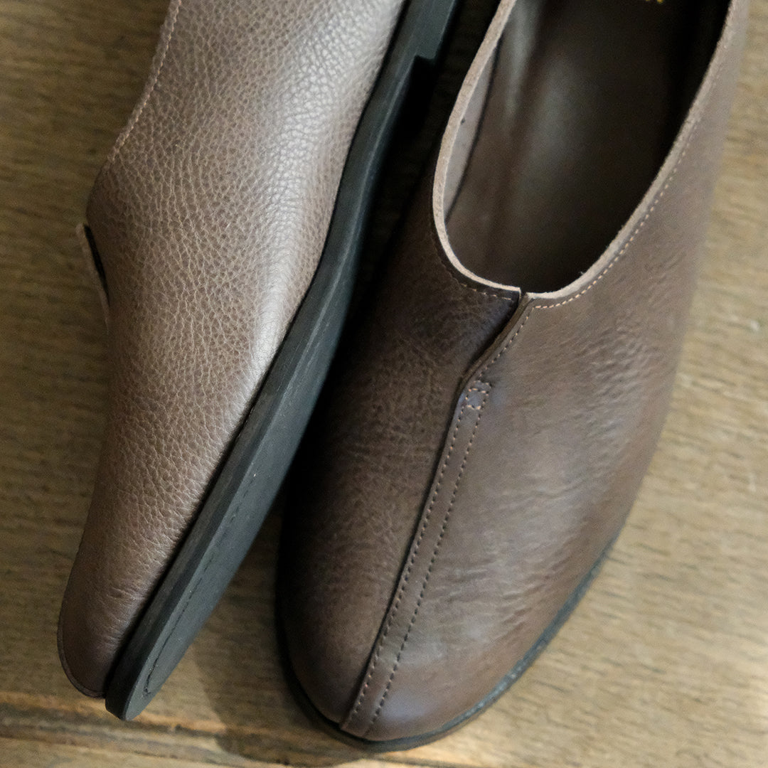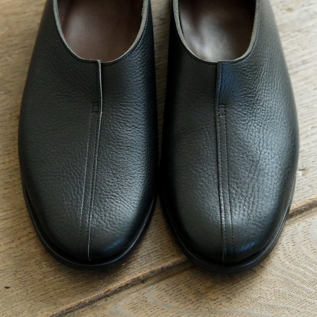 革素材の美しさを堪能できる一枚革のスリッポン。シボがありリラックスムード漂うレザーで仕立てられていて、靴下でも素足でも楽しみたい軽快な一足です。