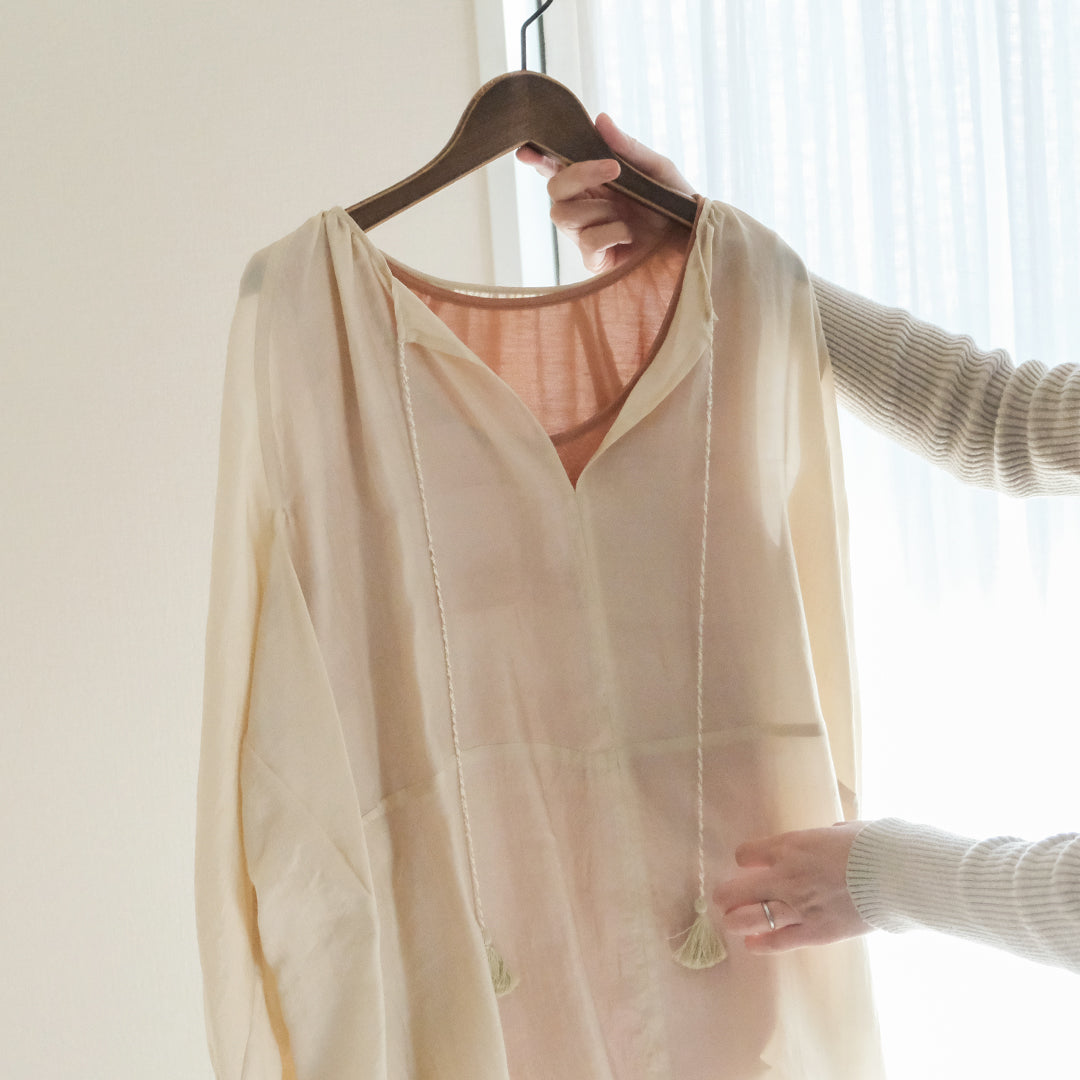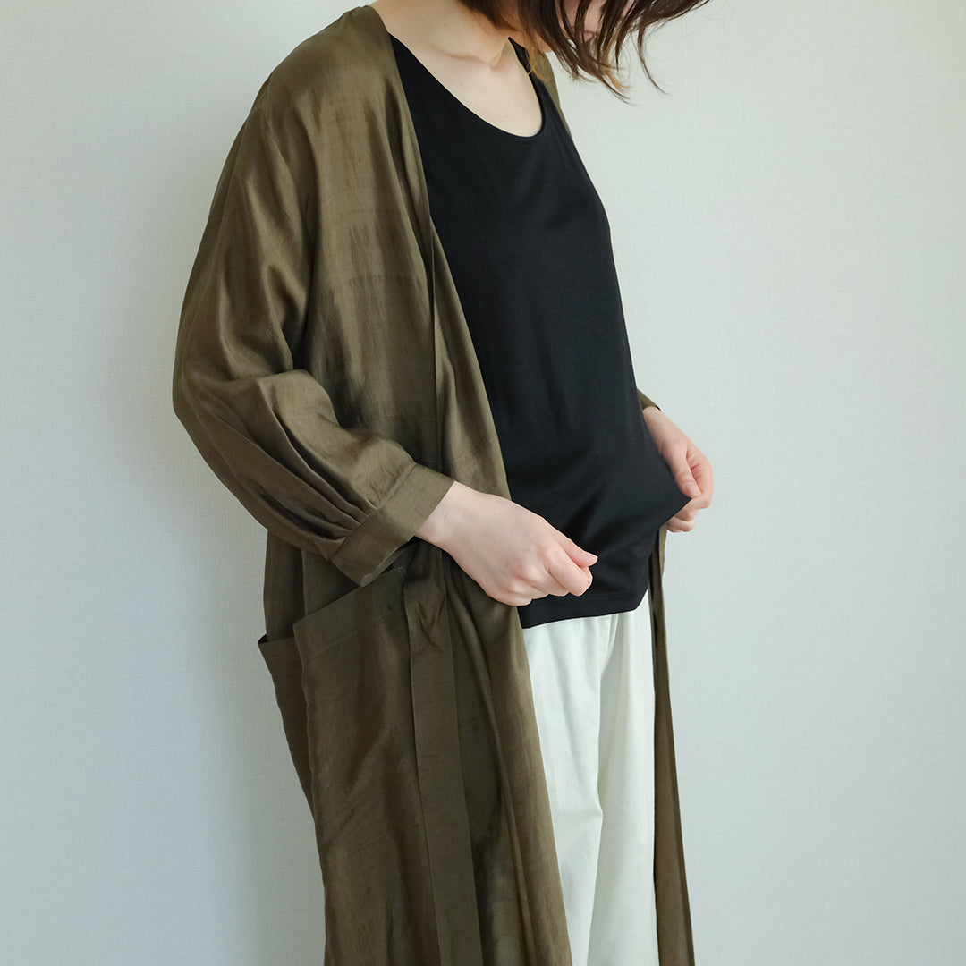 素材の持つ自然な美しさを感じられるミニマルなデザイン。触ってみれば生地の柔らかなとろみと、空気のような軽さにきっと驚くはず。