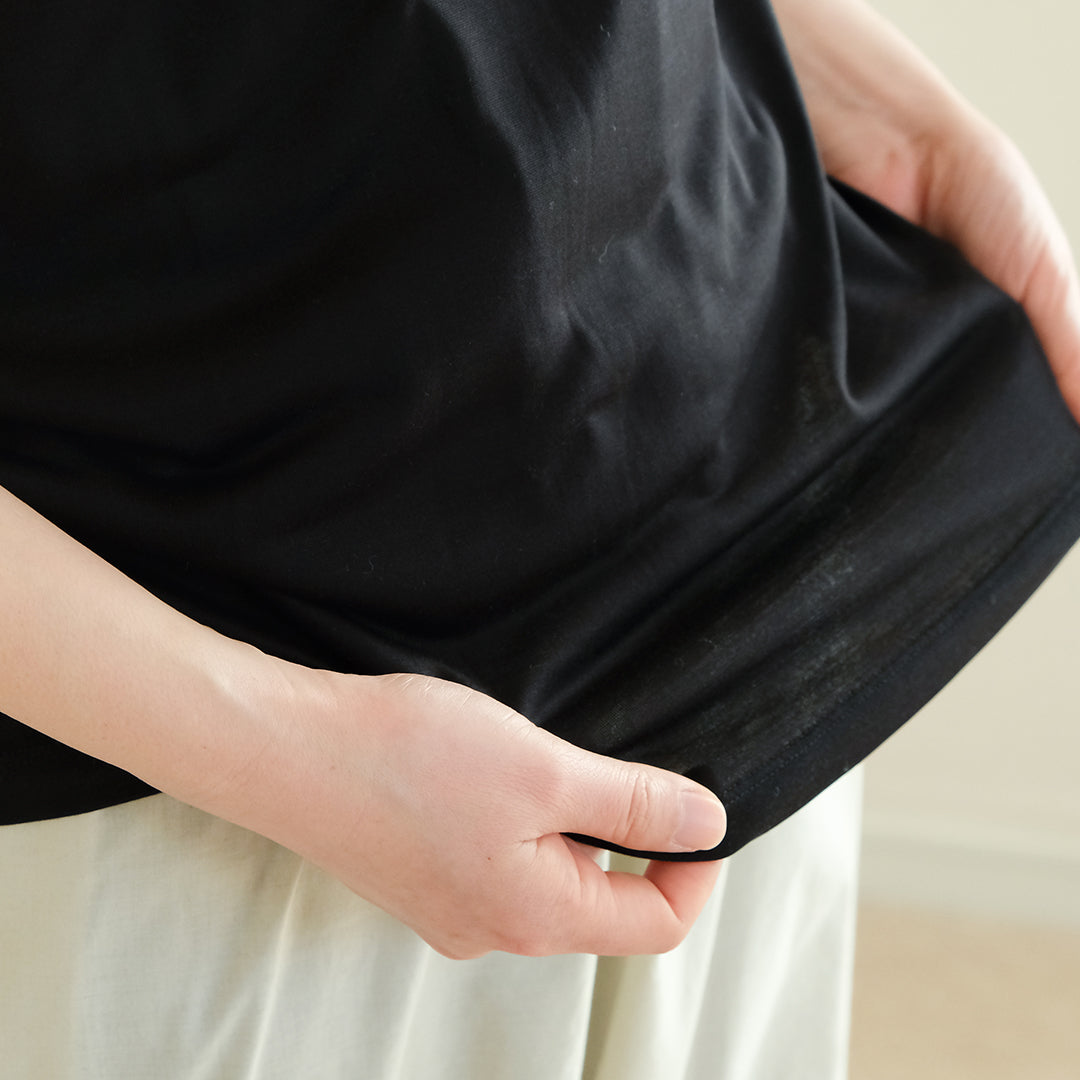 COCOONA SKINWEARのタンクトップは、天竺編みの100%シルク生地を使用。伸びにくい素材のため、一日中快適な着心地が続きます。