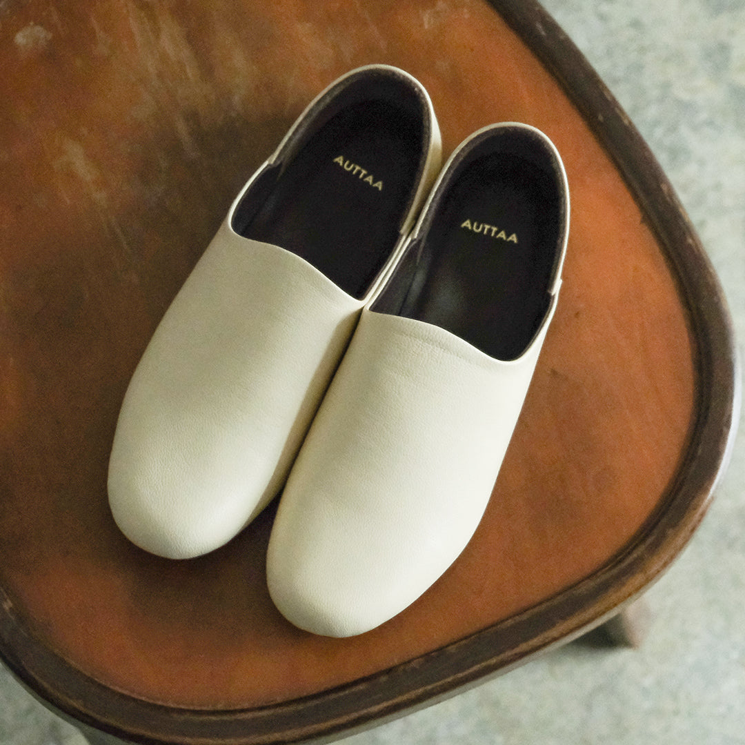 AUTTAAの定番ルームシューズにライニング(内張り)を施し、より丈夫につくったのが「ルームシューズ2」です。室内用としてはもちろん、外履きとしてもお使いいただける一足です。