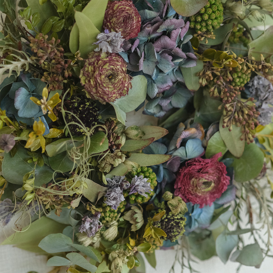 2025年はラナンキュラスのドライリース。「晴れやかな魅力」の花言葉のように、ドライにした後も明るく華やか。センニチコウやスカビオサと組み合わせて可憐な仕上がりです。