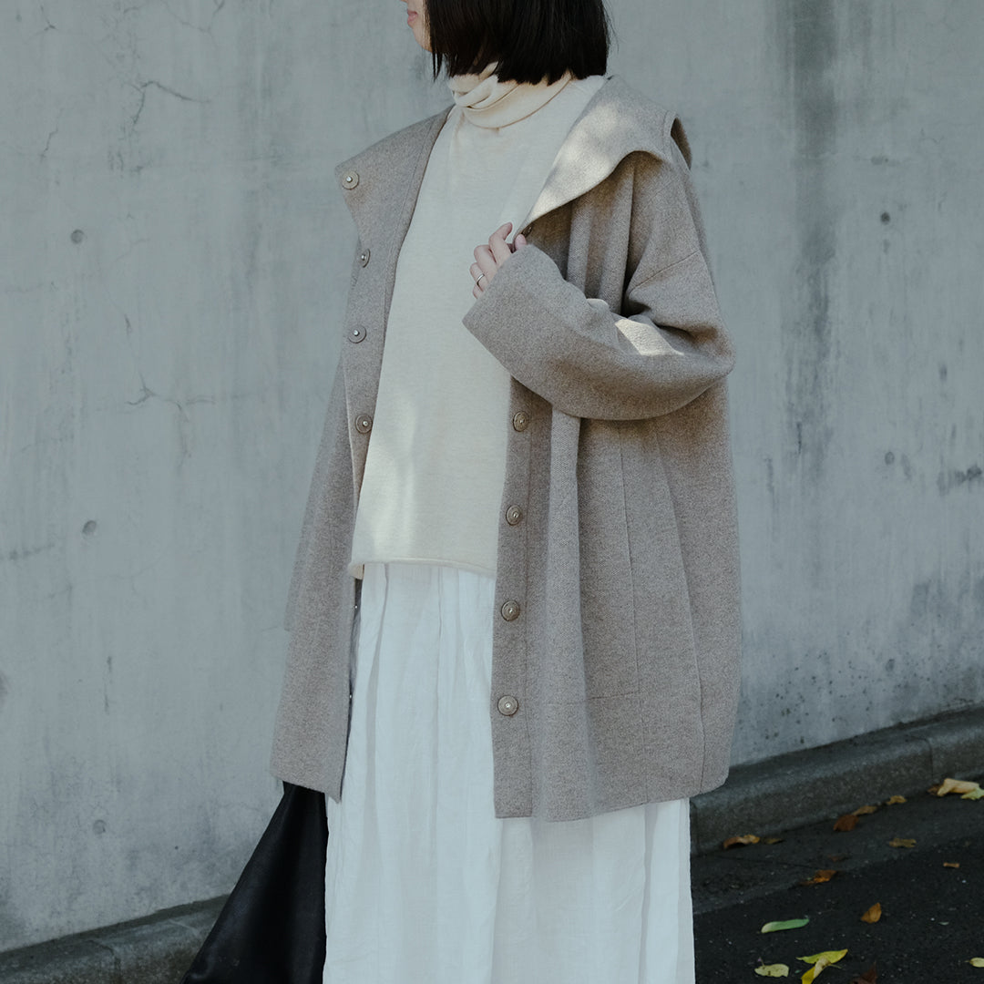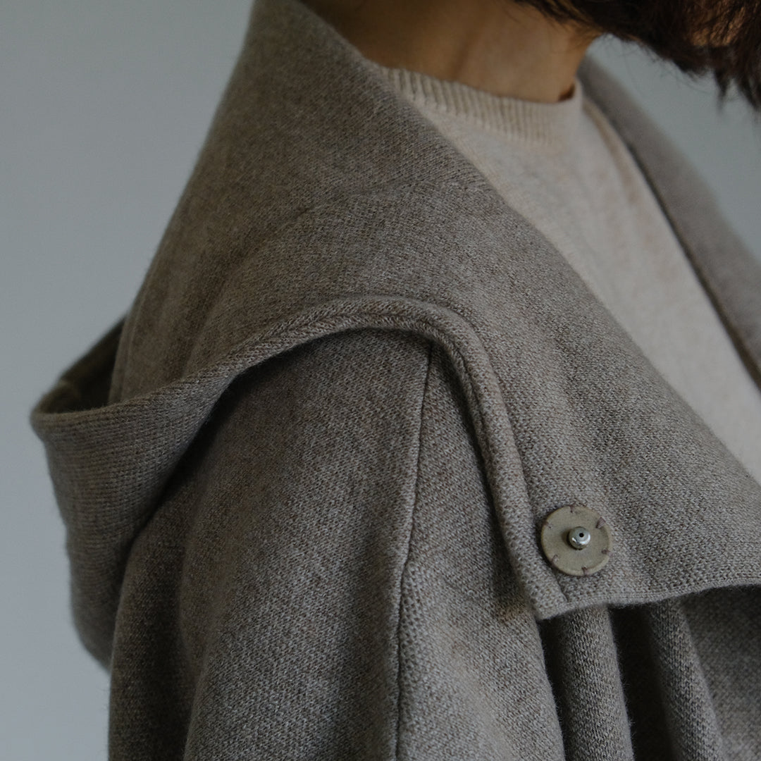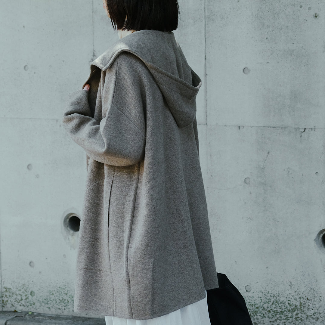 こちらでご紹介するのは、サッとさっと気軽に羽織れて、カシミアの上質な風合いによりカジュアルになりすぎないフード付きコート。