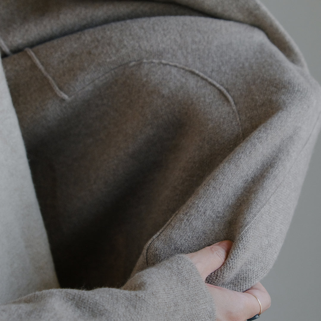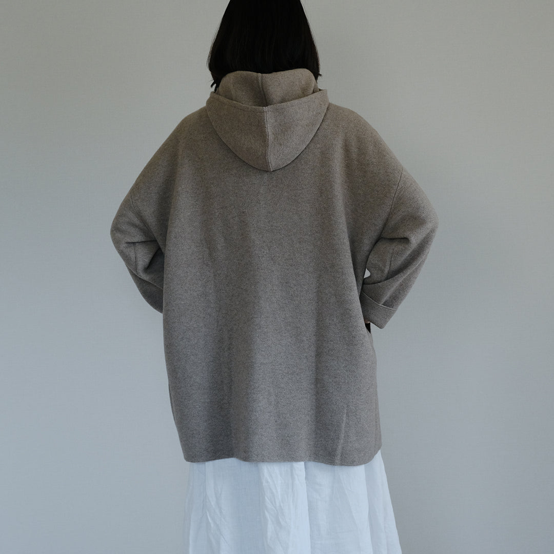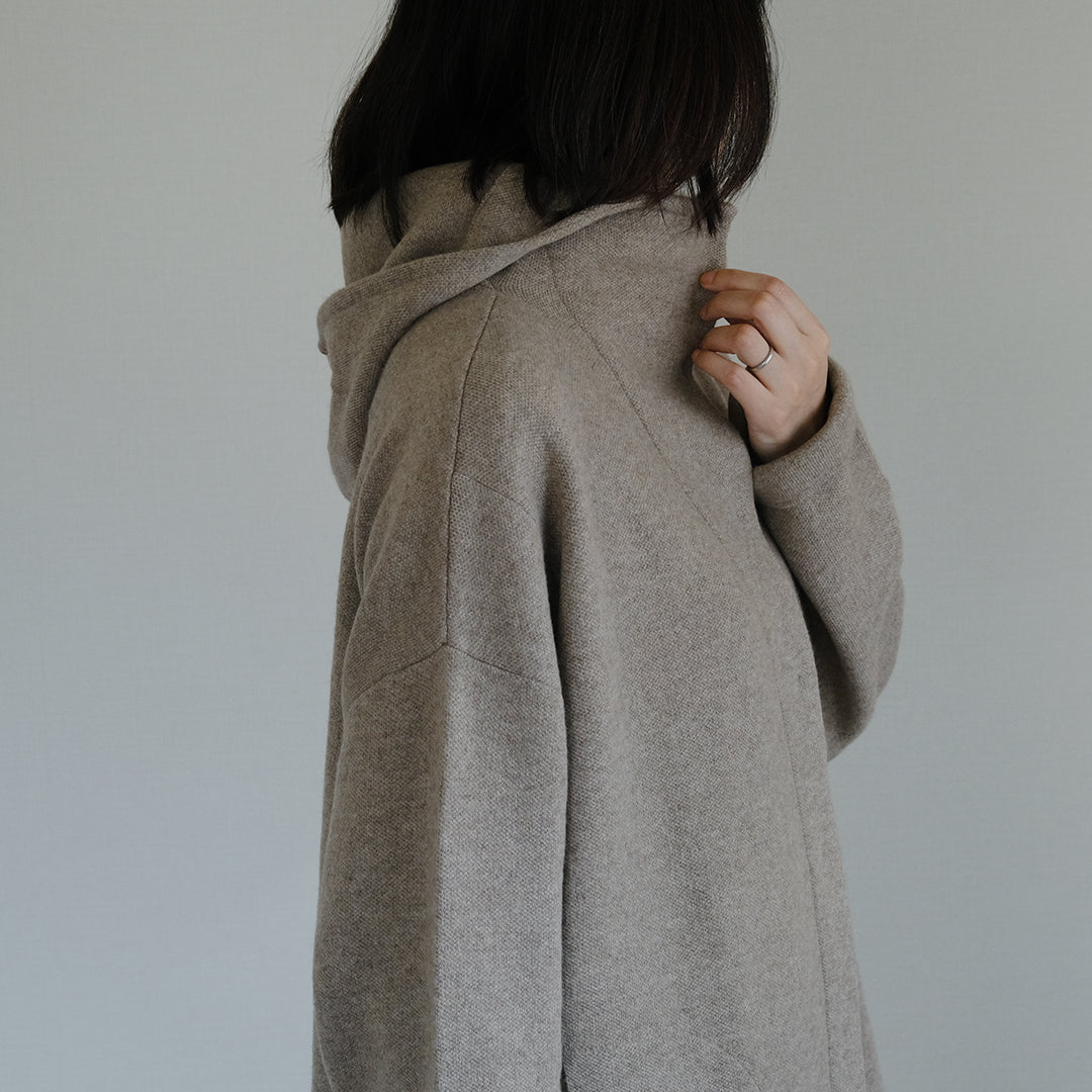 こちらでご紹介するのは、サッとさっと気軽に羽織れて、カシミアの上質な風合いによりカジュアルになりすぎないフード付きコート。