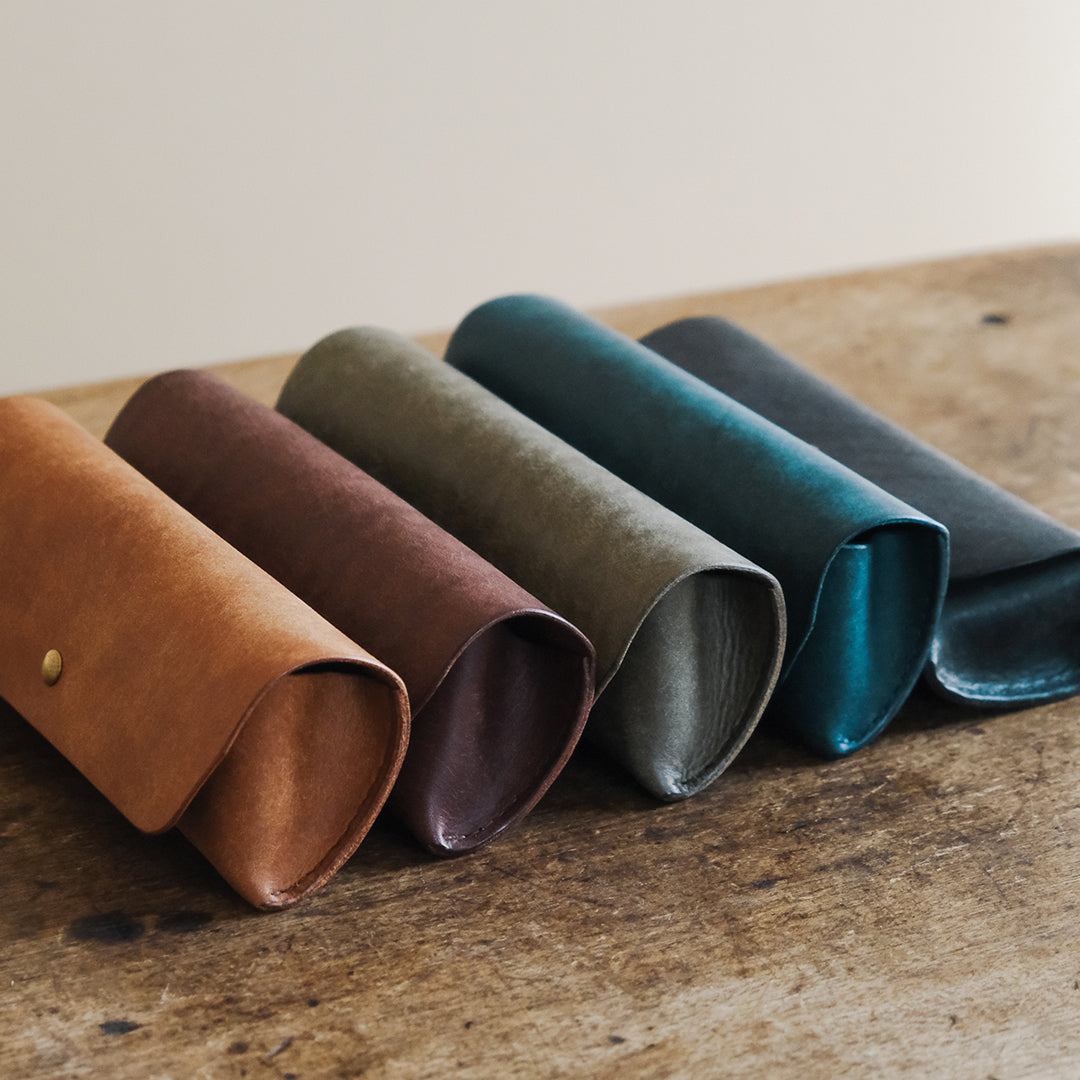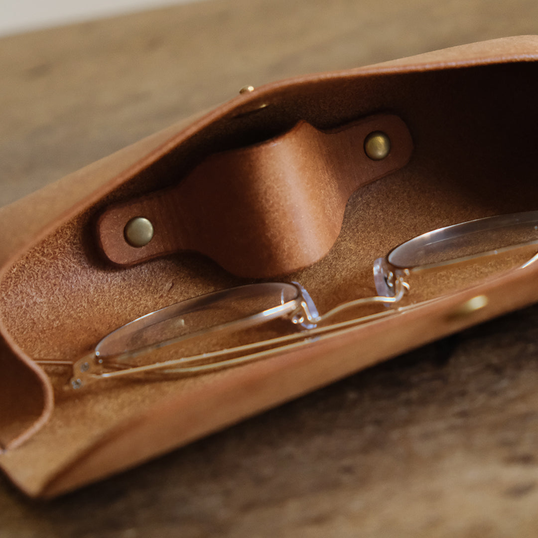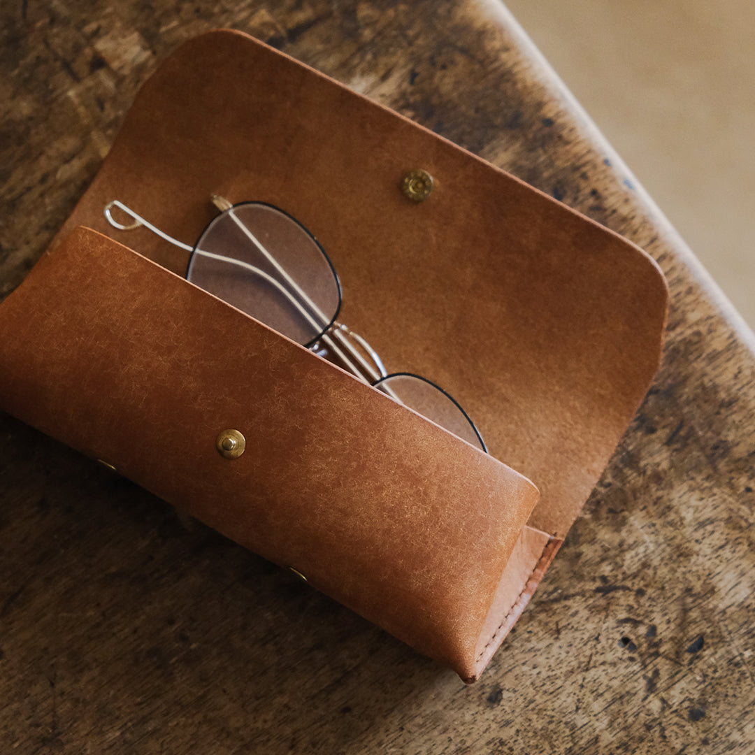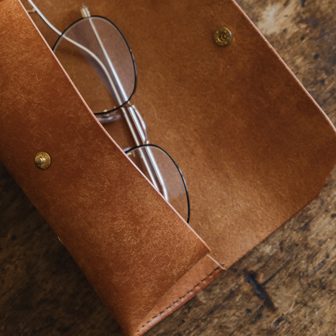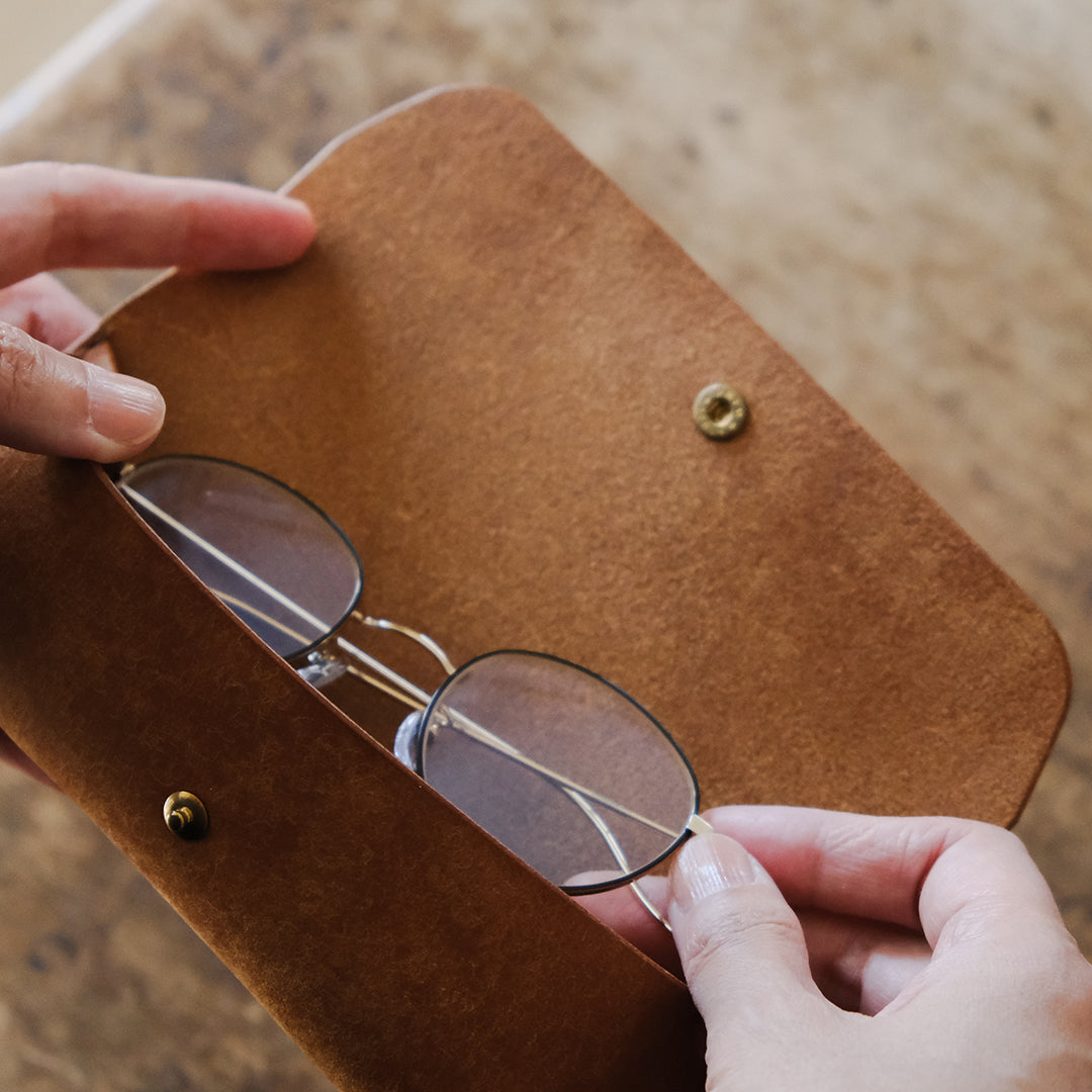 一枚革を手縫いで仕立てた、JOURNEYのメガネケース。メガネをしっかり守りつつ、ふっくらしたかたちで軽やかに持ち歩けます。使うほどに革の風合いが増し、愛着を持って使える一品です。