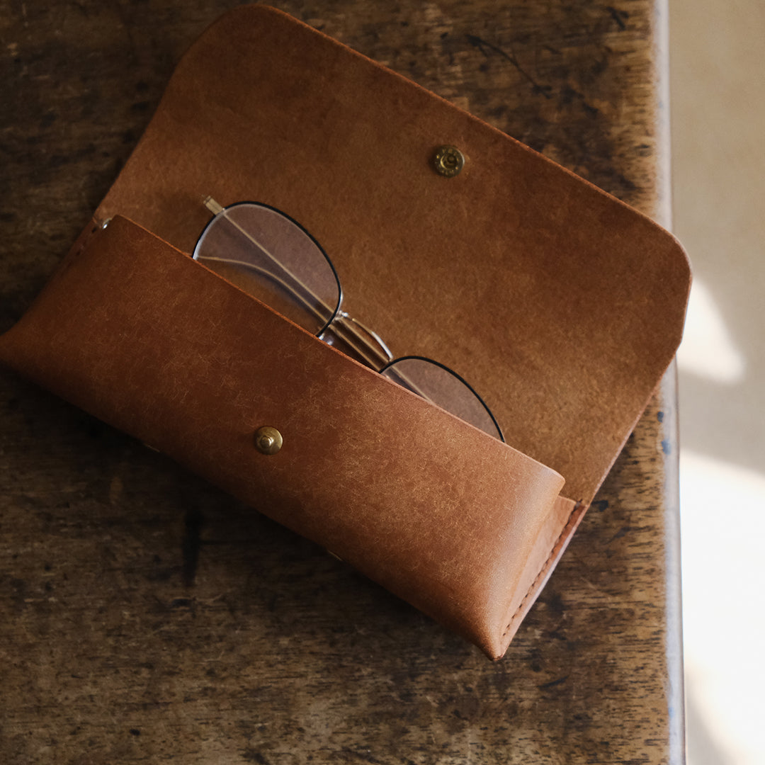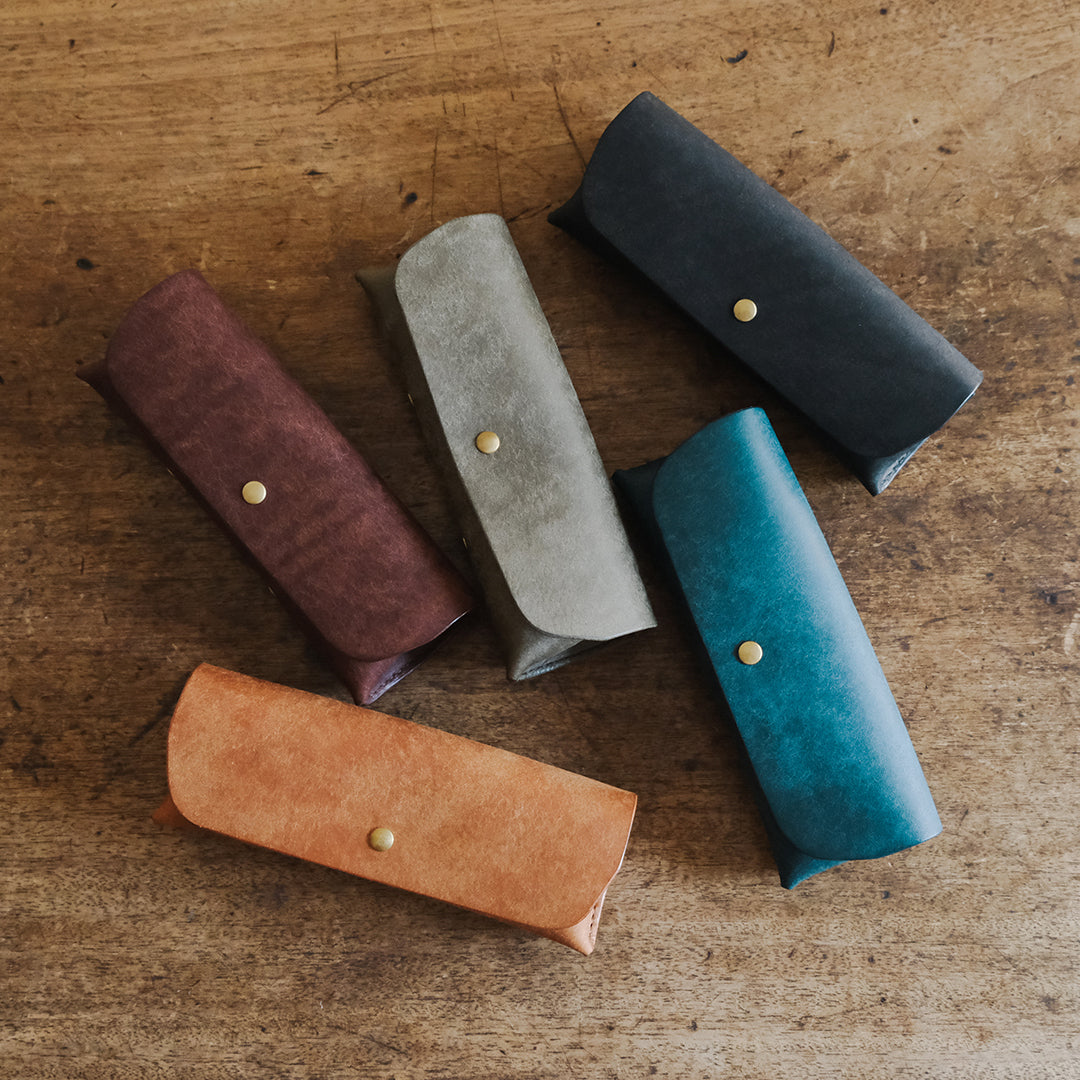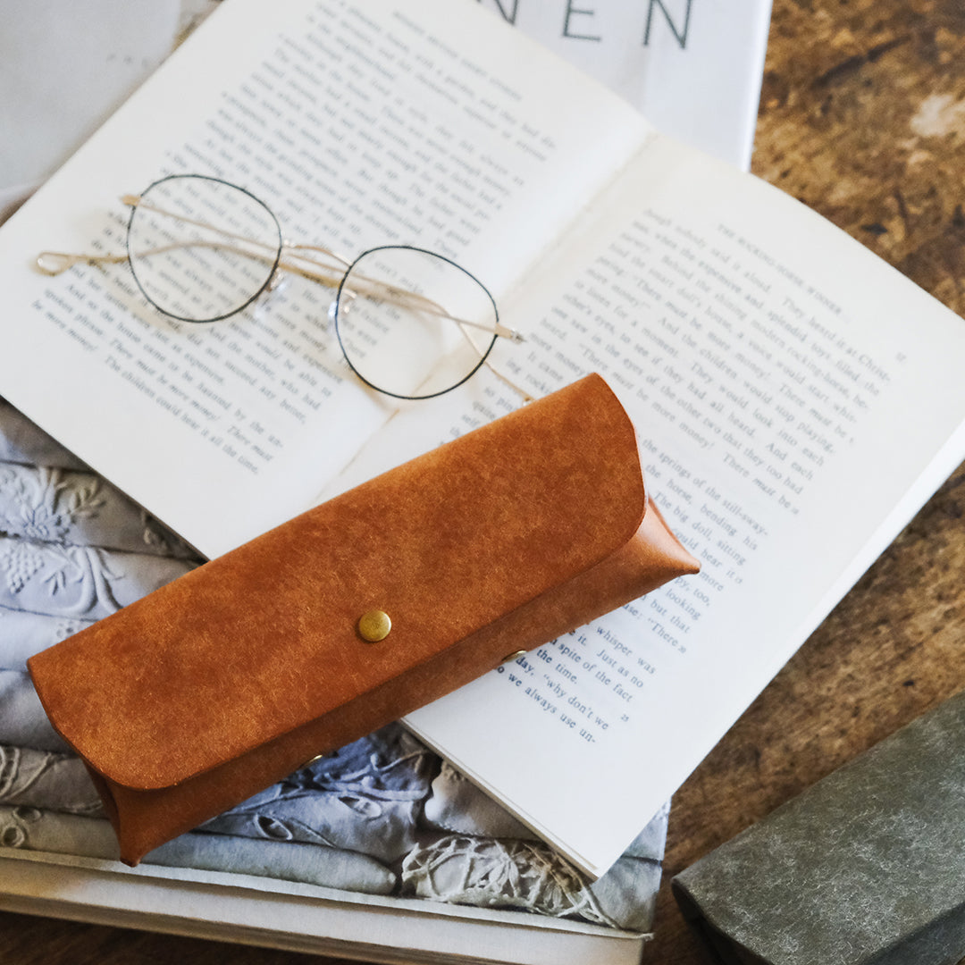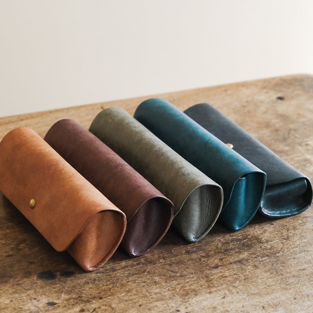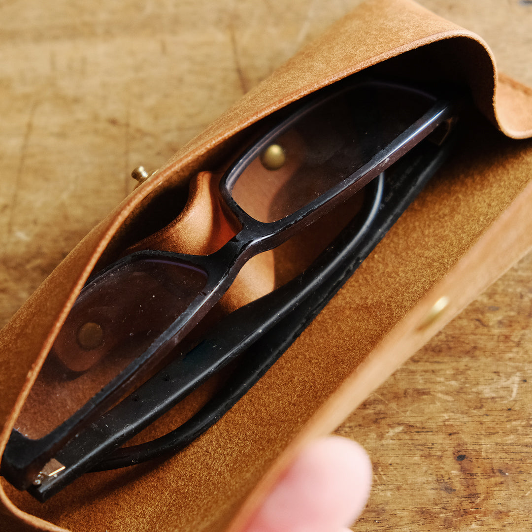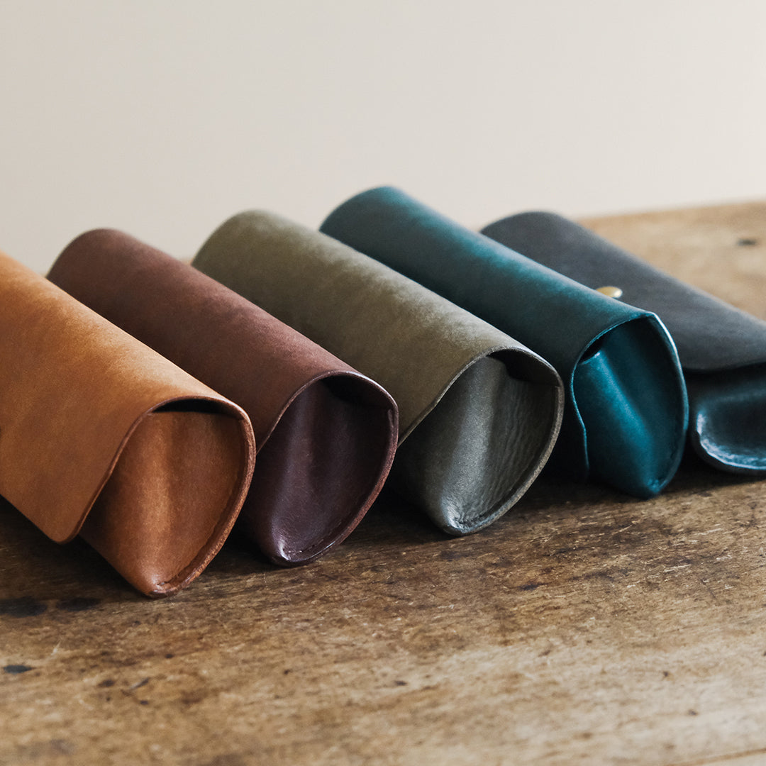 一枚革を手縫いで仕立てた、JOURNEYのメガネケース。メガネをしっかり守りつつ、ふっくらしたかたちで軽やかに持ち歩けます。使うほどに革の風合いが増し、愛着を持って使える一品です。