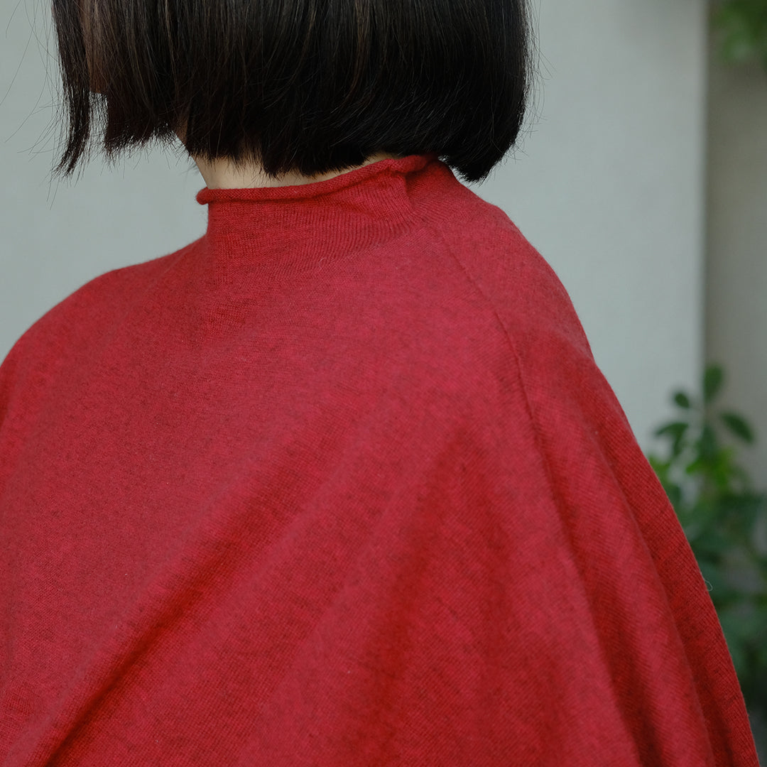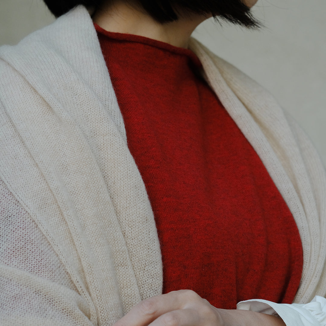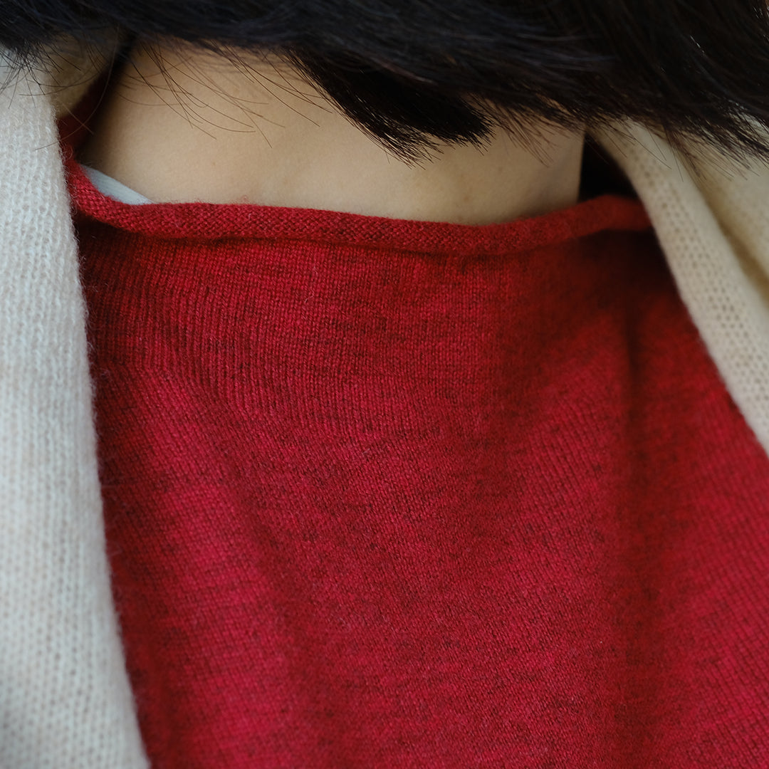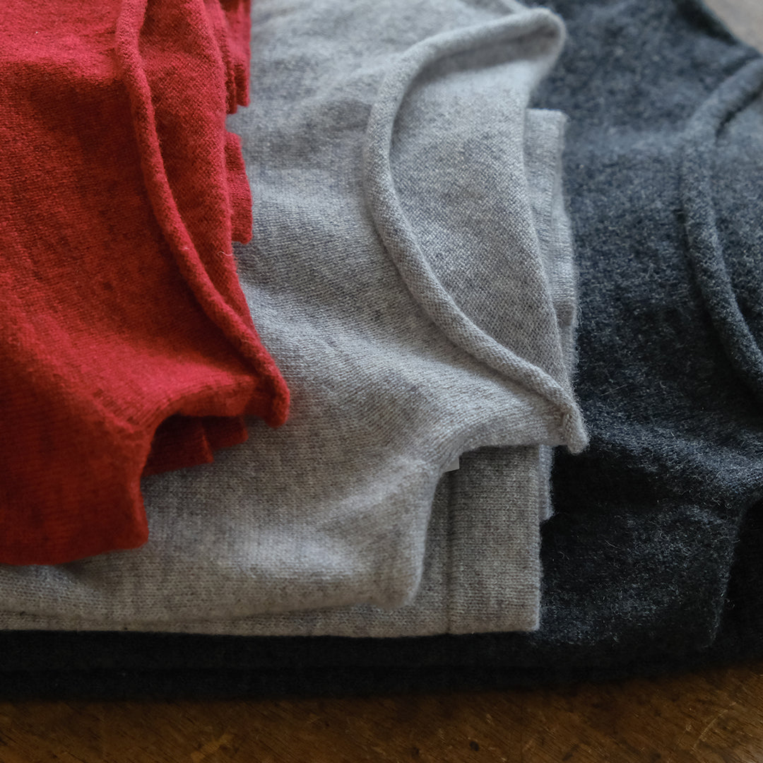 カラーはミックスレッド、グレー、チャコール、とFREEMAN--B定番の3色。原毛の段階で染めることで、カシミヤへの負担を最小限に抑えています。