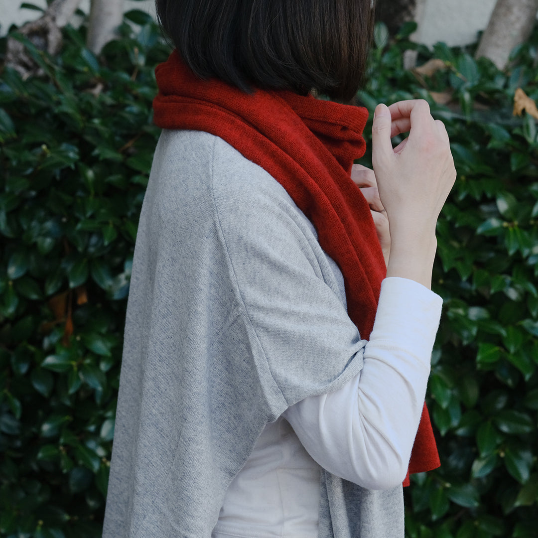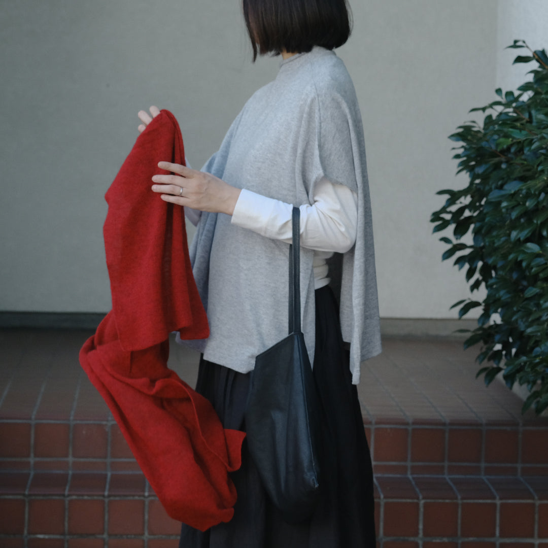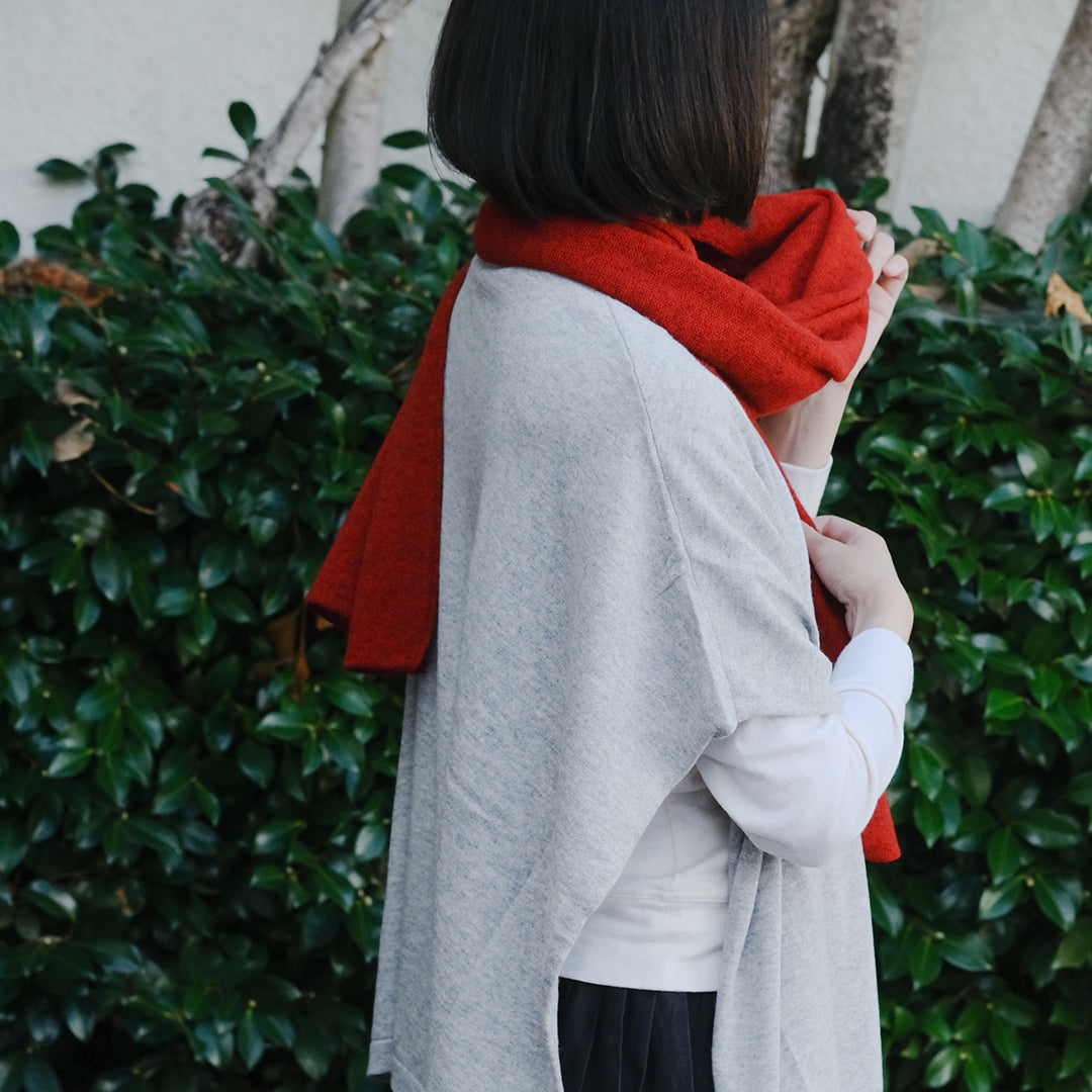 カラーはミックスレッド、グレー、チャコール、とFREEMAN--B定番の3色。原毛の段階で染めることで、カシミヤへの負担を最小限に抑えています。